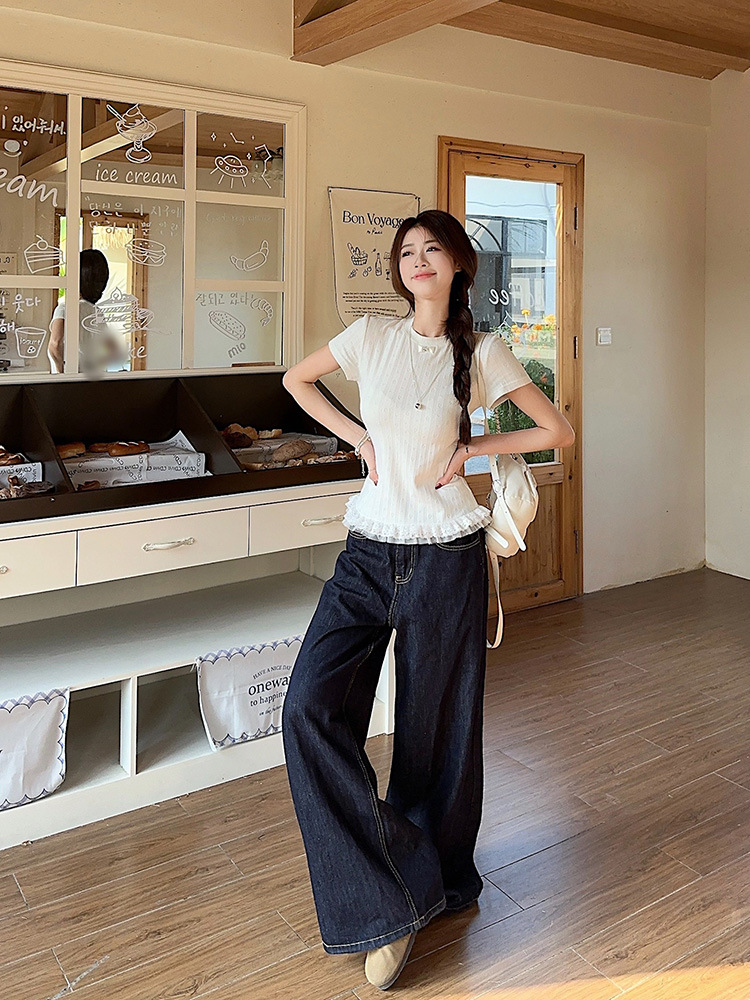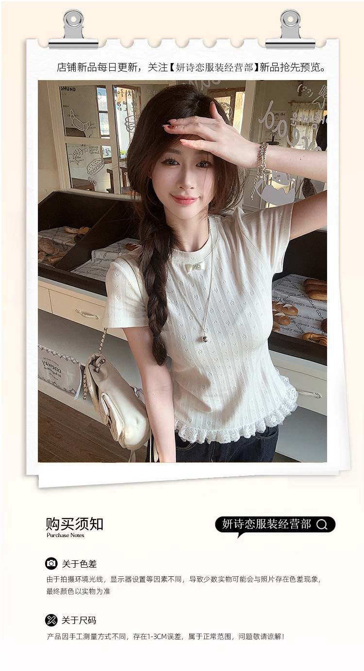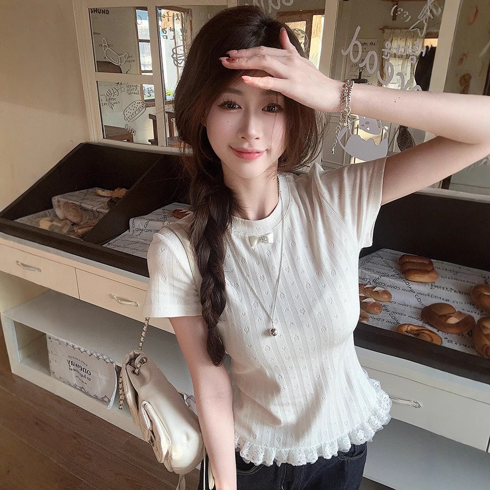 나이를 줄이는 레이스 반팔 티셔츠 여성 2025 년 여름 새로운 달콤한 사랑 자카드 디자인 센스 슬림 핏 탑스토어 가기