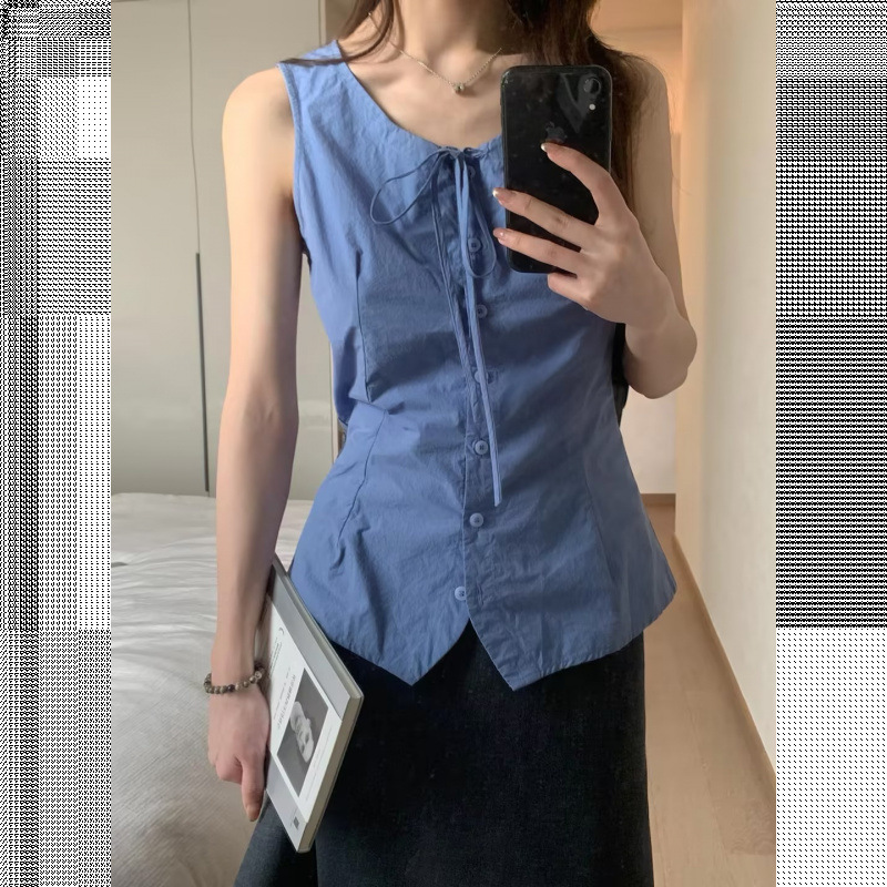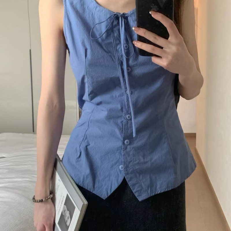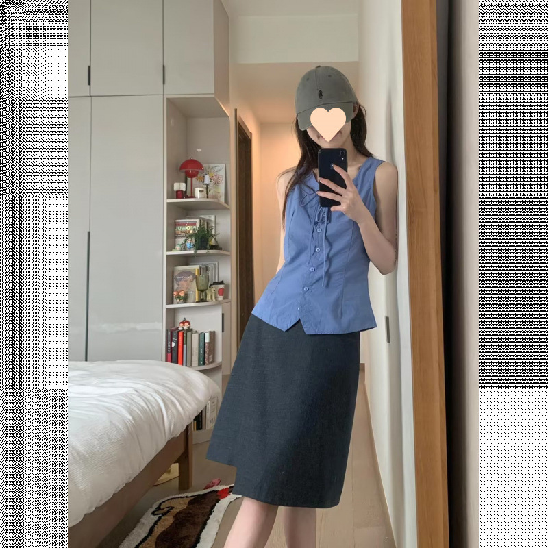 프랑스 스타일 라이트 성숙한 세트 여성 여름 세련된 레이스 업 민소매 셔츠 우아한 높은 허리 세트 절반 길이 스커트 투피스 세트