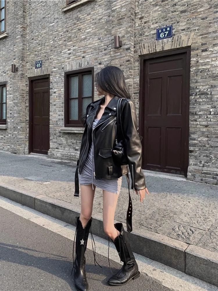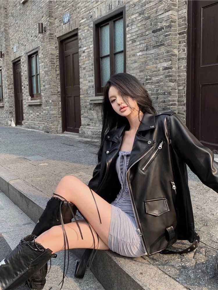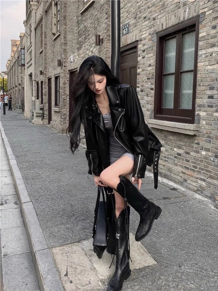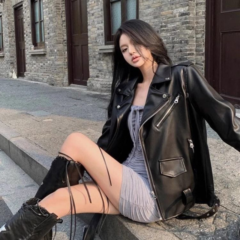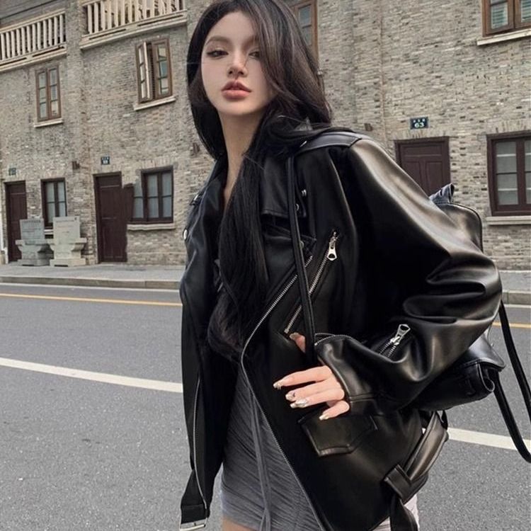 미국 스타일의 하이 엔드 패션 가죽 자켓 여성의 2025 새로운 봄과 가을 거리 세련된 오토바이 가죽 자켓 최고 트렌디스토어 가기