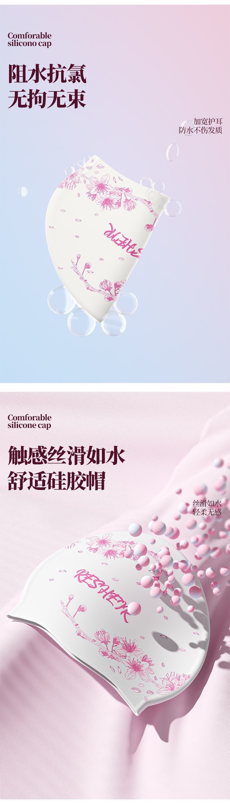 • 백색분말-복숭아꽃가지-방수머리없음-프린트수영모