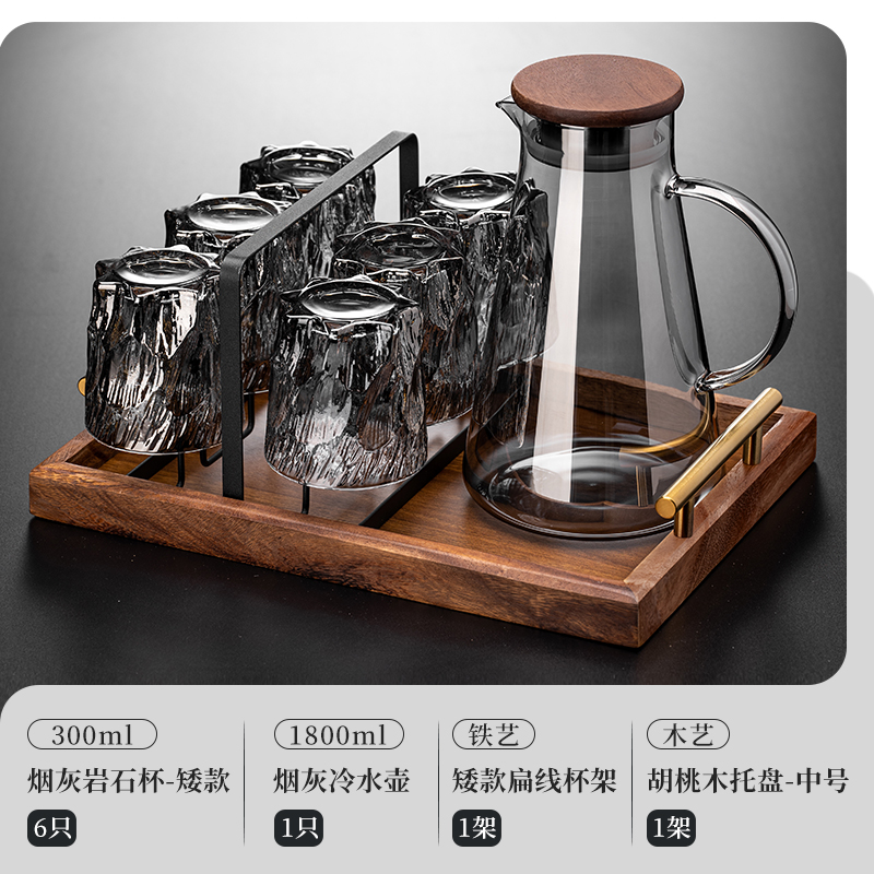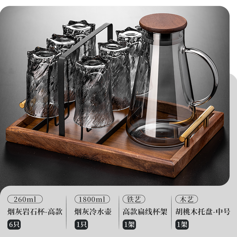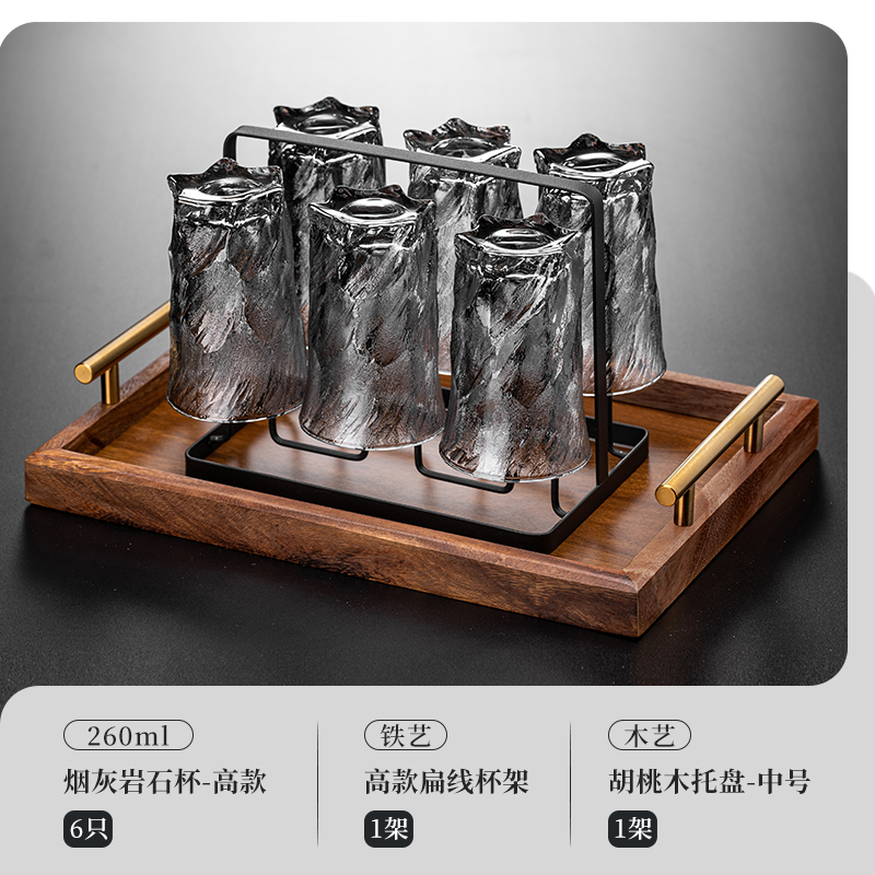 • 260ML 스모크 그레이 록 톨 컵 x6+컵 홀더+주전자+호두 트레이