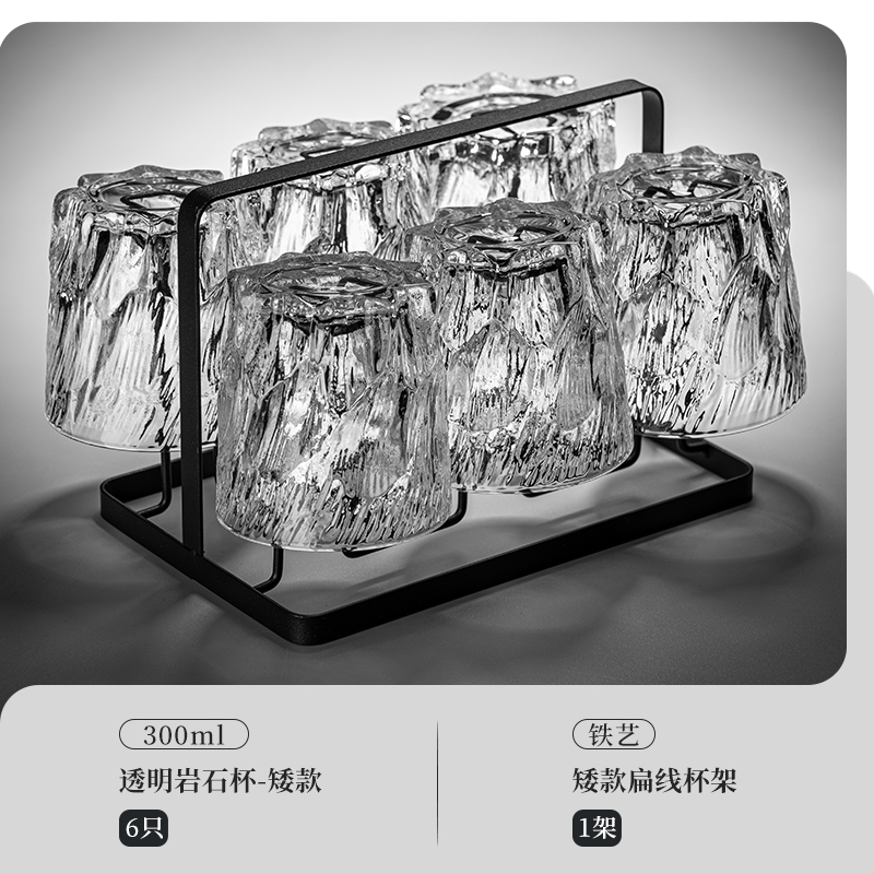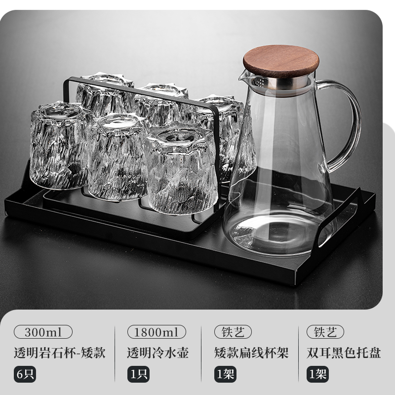 • 300ML 투명 록 쇼트 컵 x6+컵 홀더+주전자+검은 철제 트레이