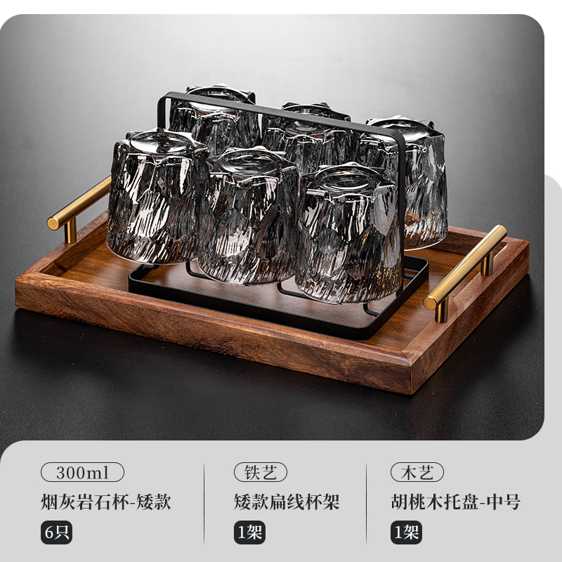 • 300ML 스모크 그레이 록 쇼트 컵 x6+컵 홀더+호두 트레이