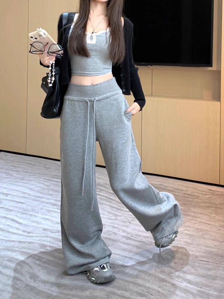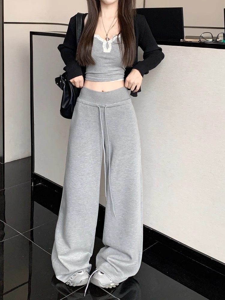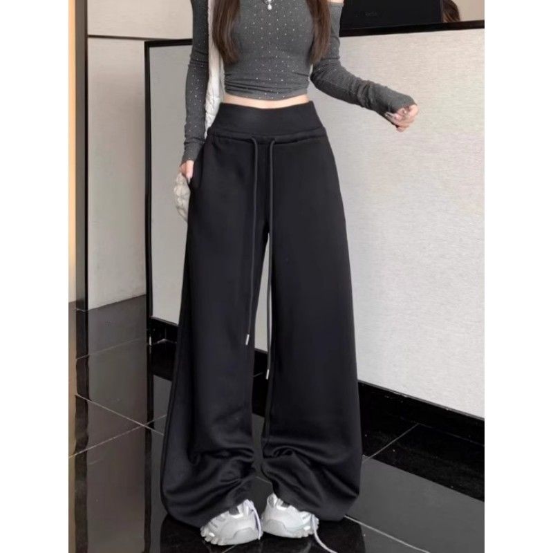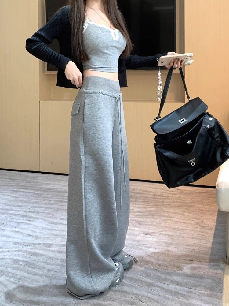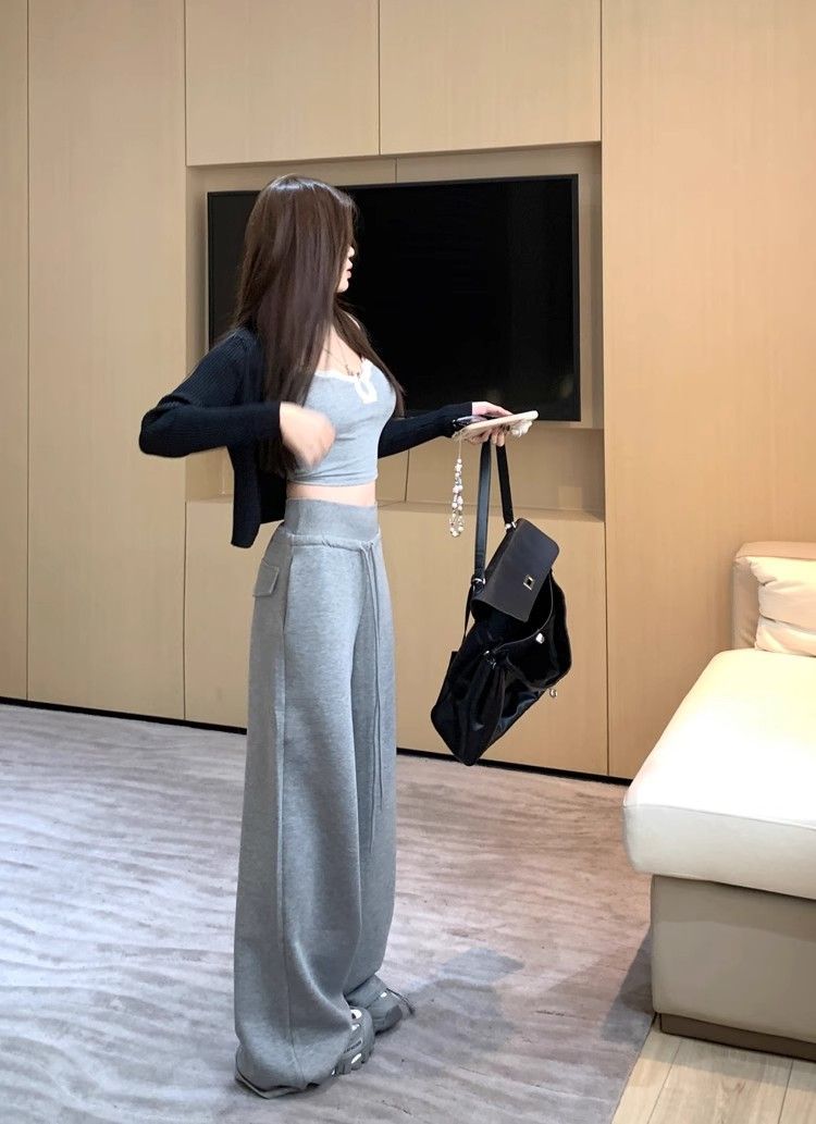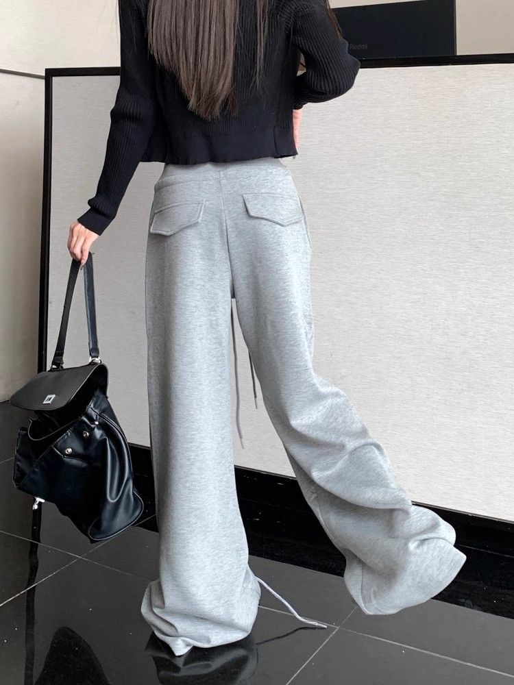 회색 스포츠 바지 스트레이트 바지 여성의 봄과 가을 새로운 높은 허리 처짐 리브 허리 미국 캐주얼 와이드 레그 팬츠 도매스토어 가기