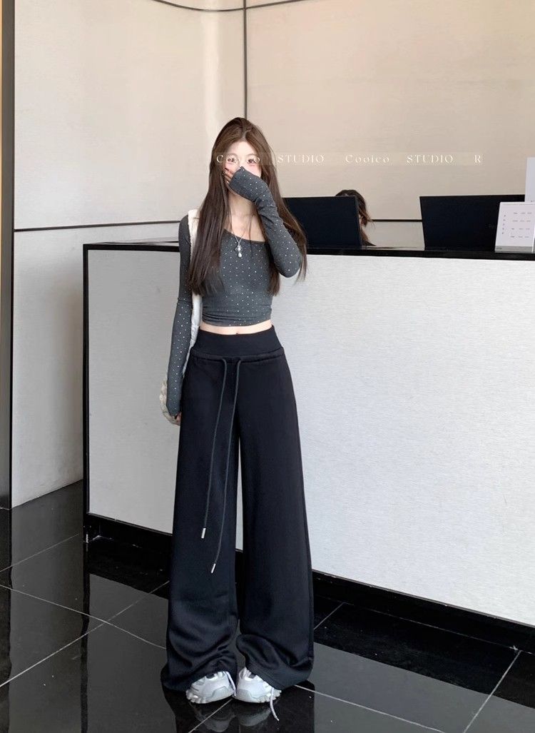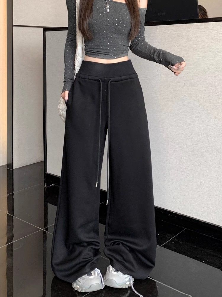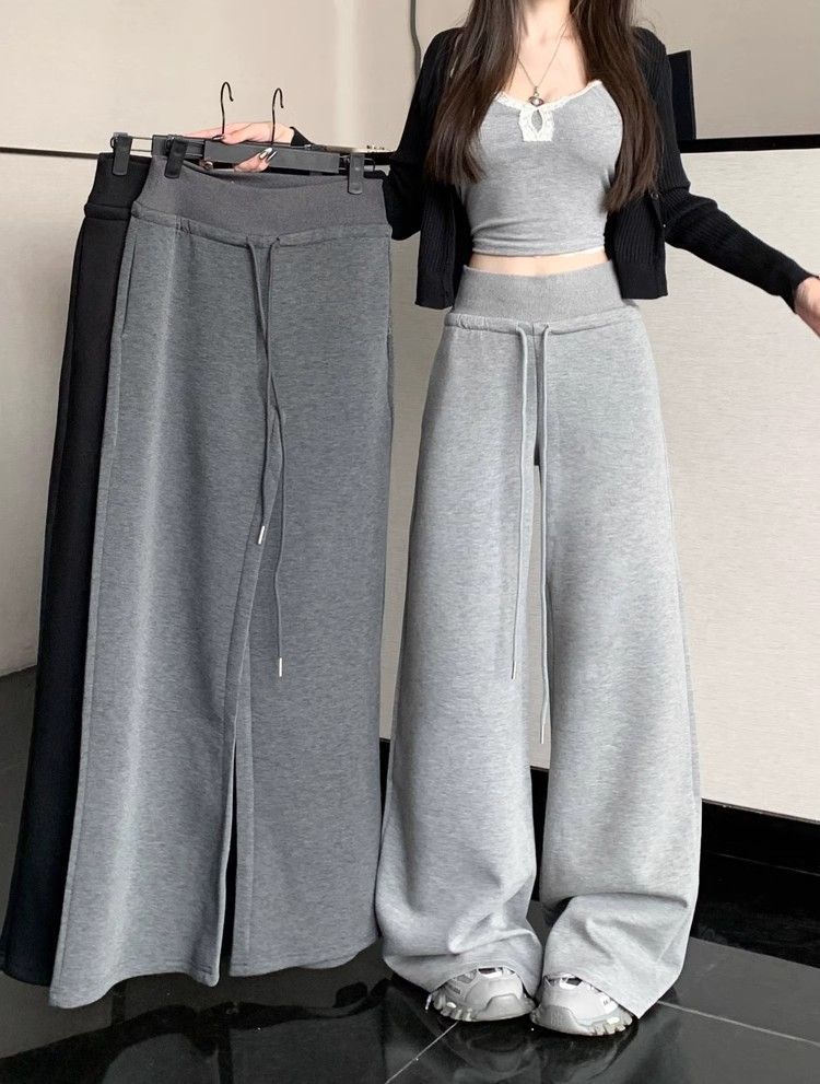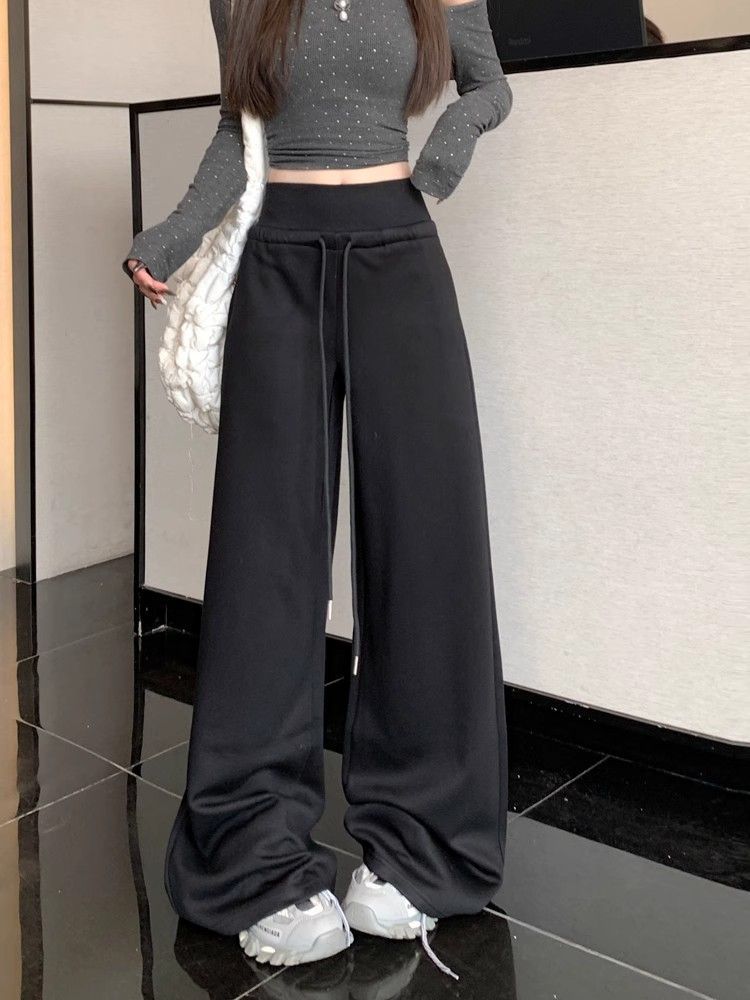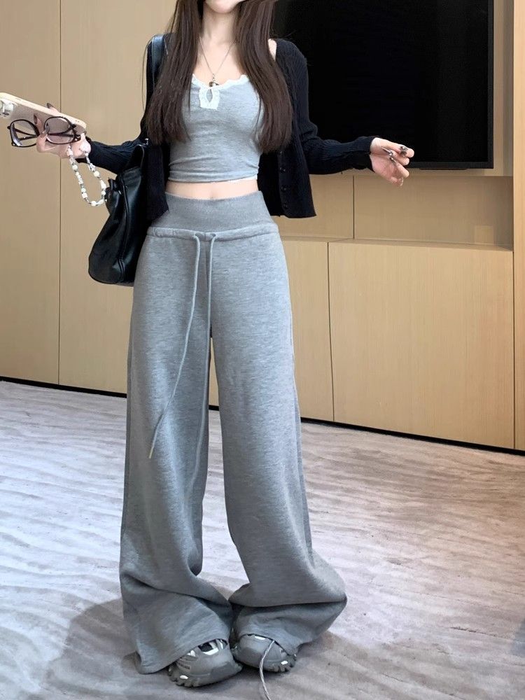 회색 스포츠 바지 스트레이트 바지 여성의 봄과 가을 새로운 높은 허리 처짐 리브 허리 미국 캐주얼 와이드 레그 팬츠 도매스토어 가기