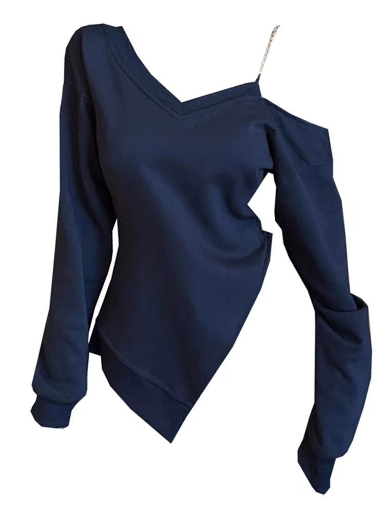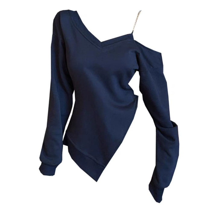 불규칙한 체인 긴팔 땀 여성 디자인 센스 슬림 핏 플리츠 아메리칸 스타일 핫 걸 슬랜트 칼라 숄더 탑 여성용 슬림 룩