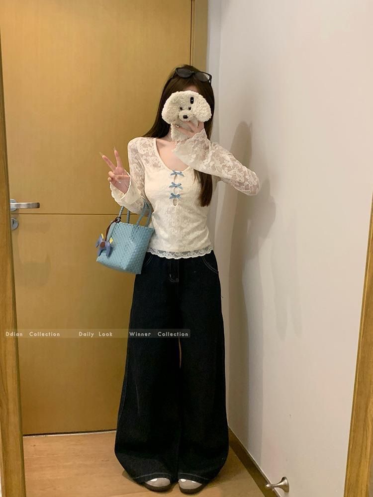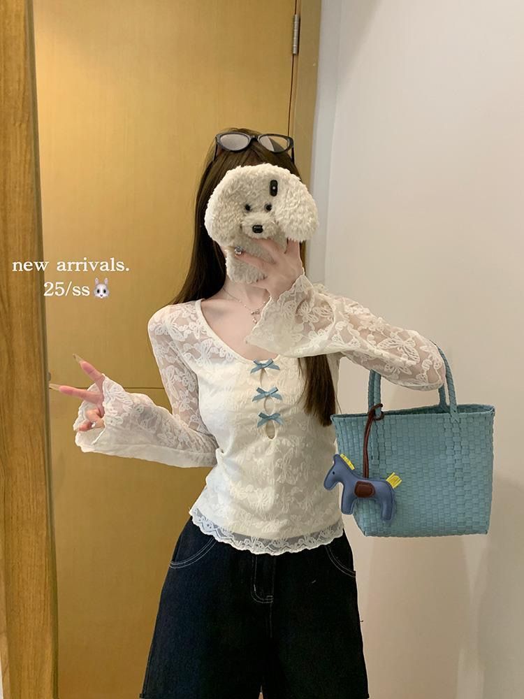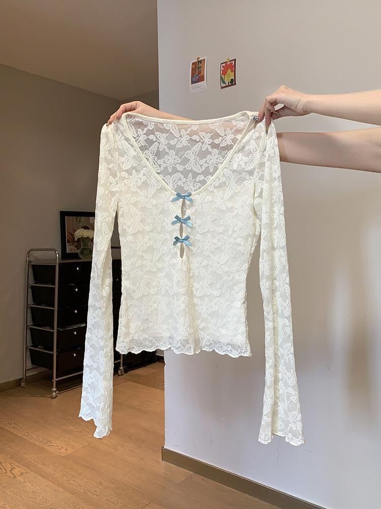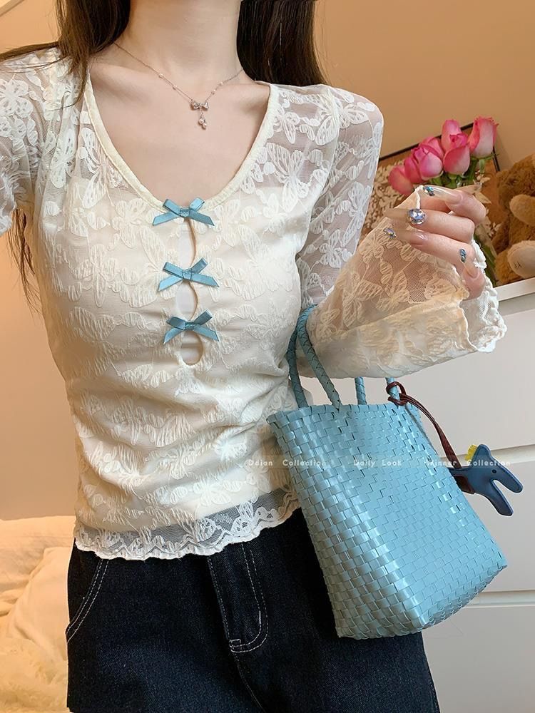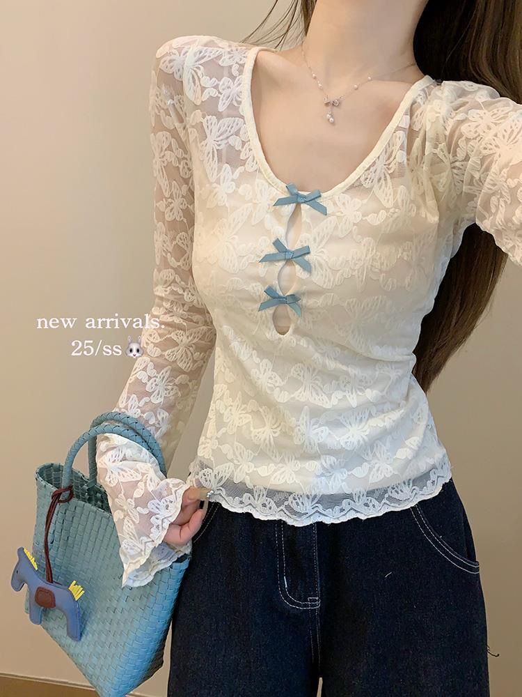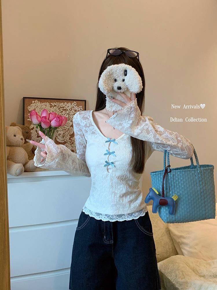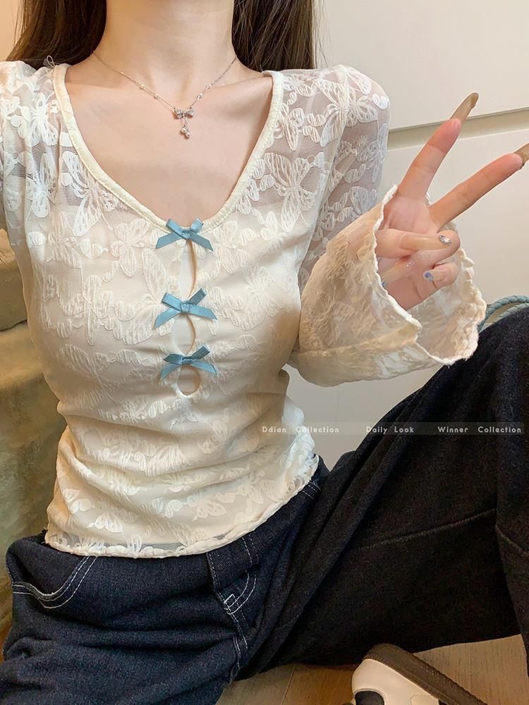 순수한 욕망 화이트 레이스 보우 할로우 티셔츠 이른 가을 내부 끈이없는 세련된 달콤한 베이스 셔츠 짧은 탑스토어 가기