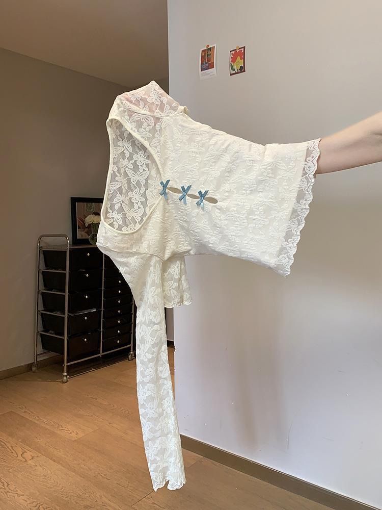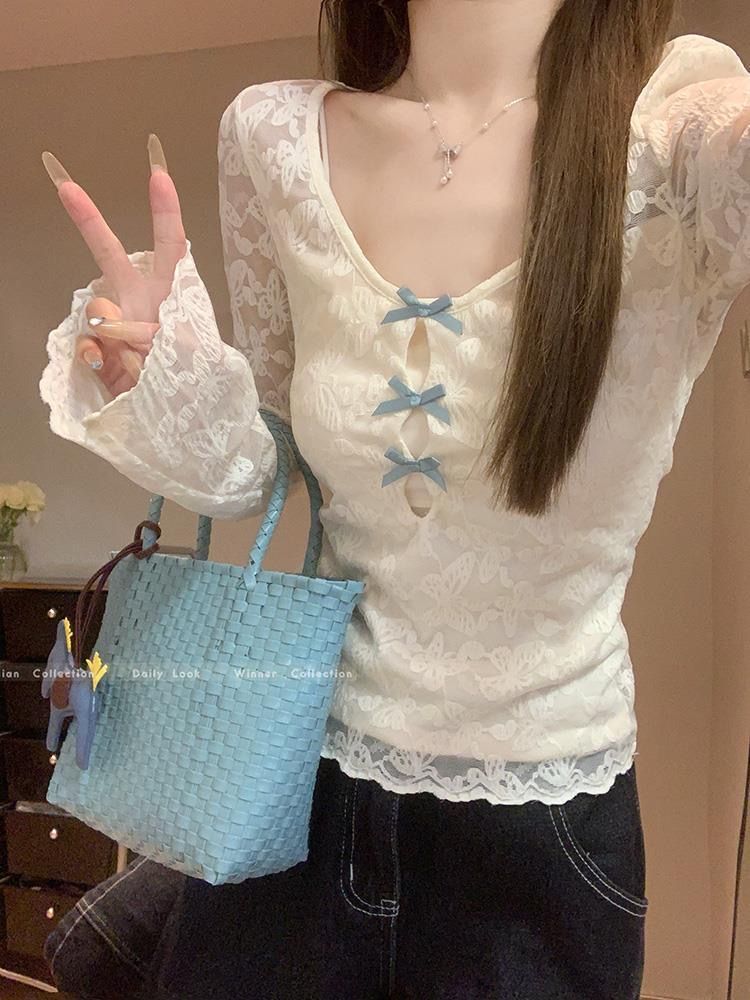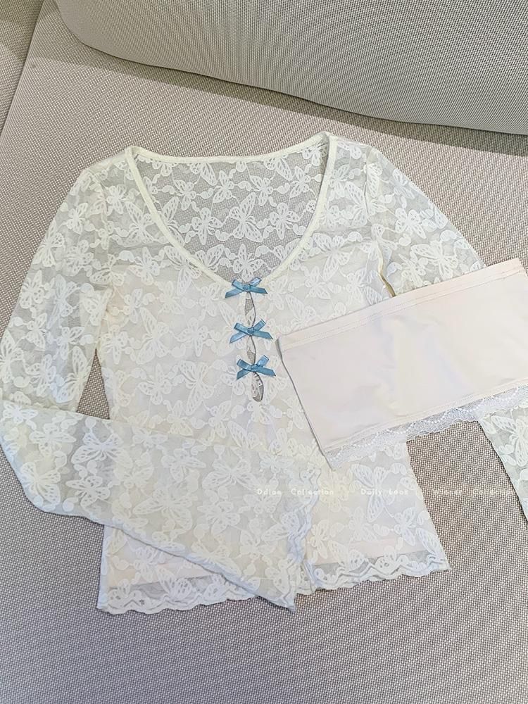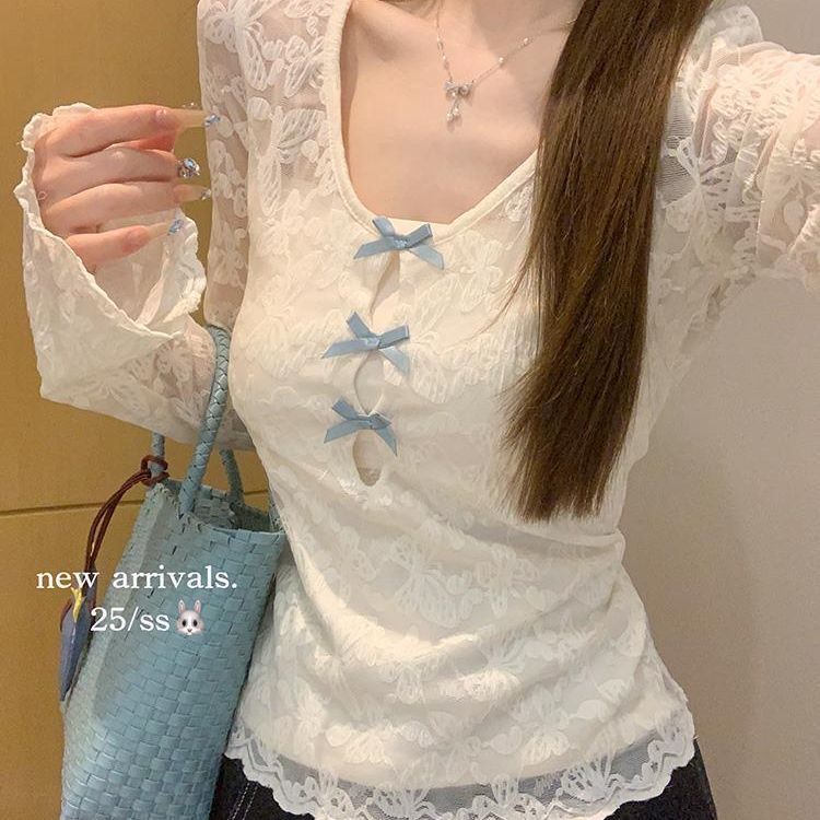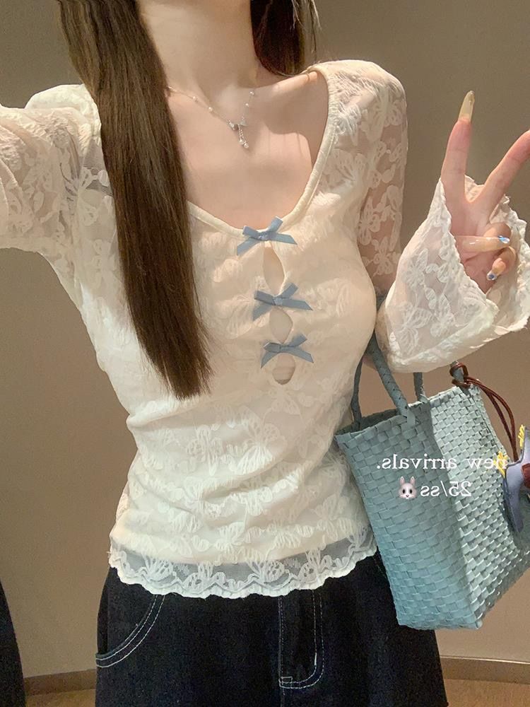 순수한 욕망 화이트 레이스 보우 할로우 티셔츠 이른 가을 내부 끈이없는 세련된 달콤한 베이스 셔츠 짧은 탑