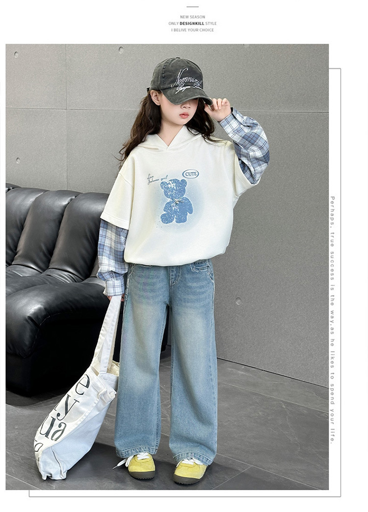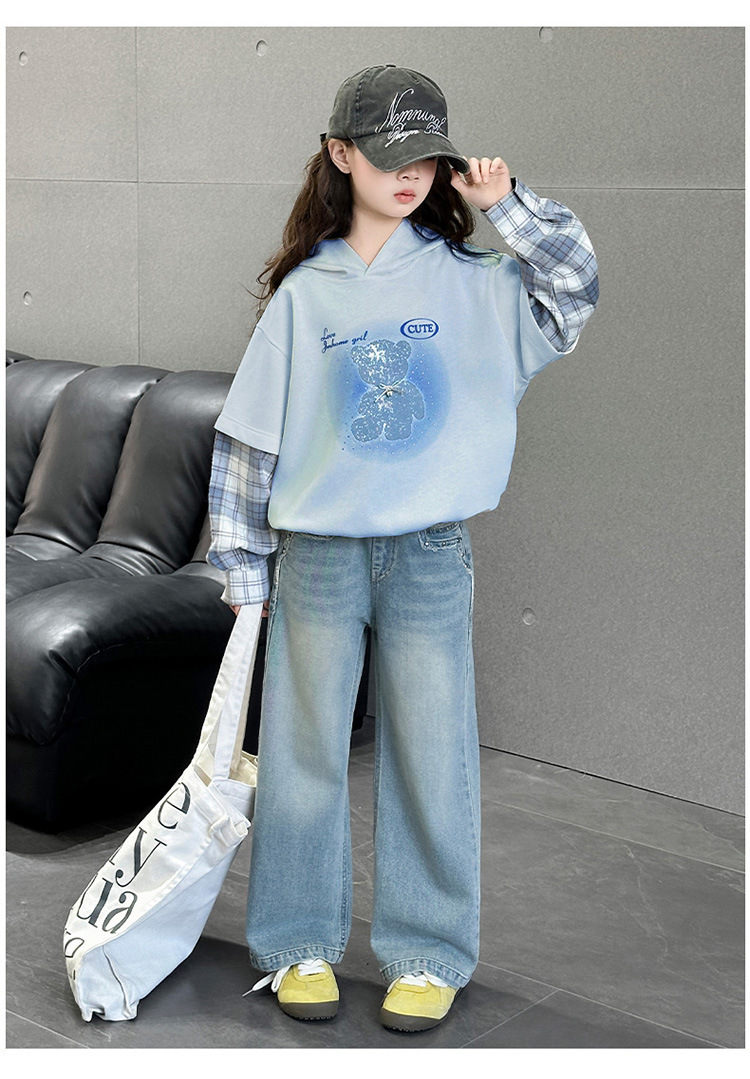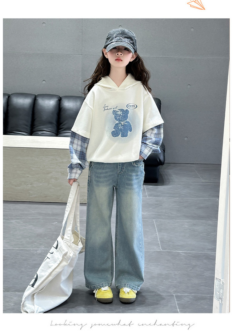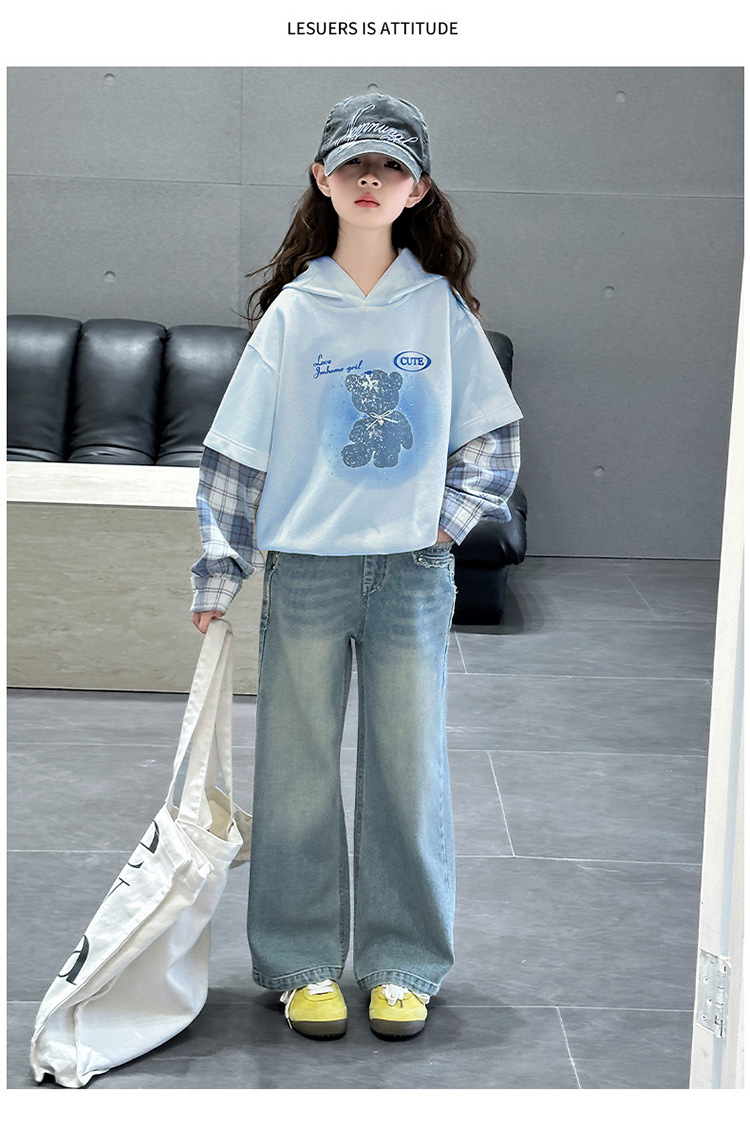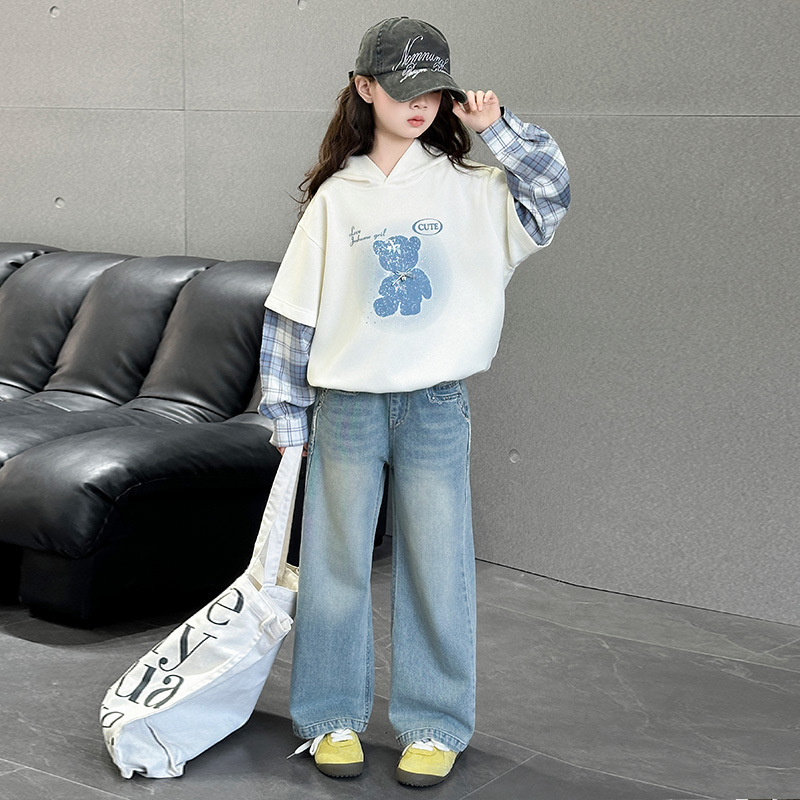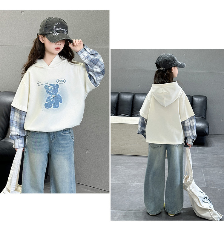 소녀 봄 세트 도매 2025 새로운 가짜 두 후드 스웨터 쇠고기 바지 세트 소녀 패션 조수