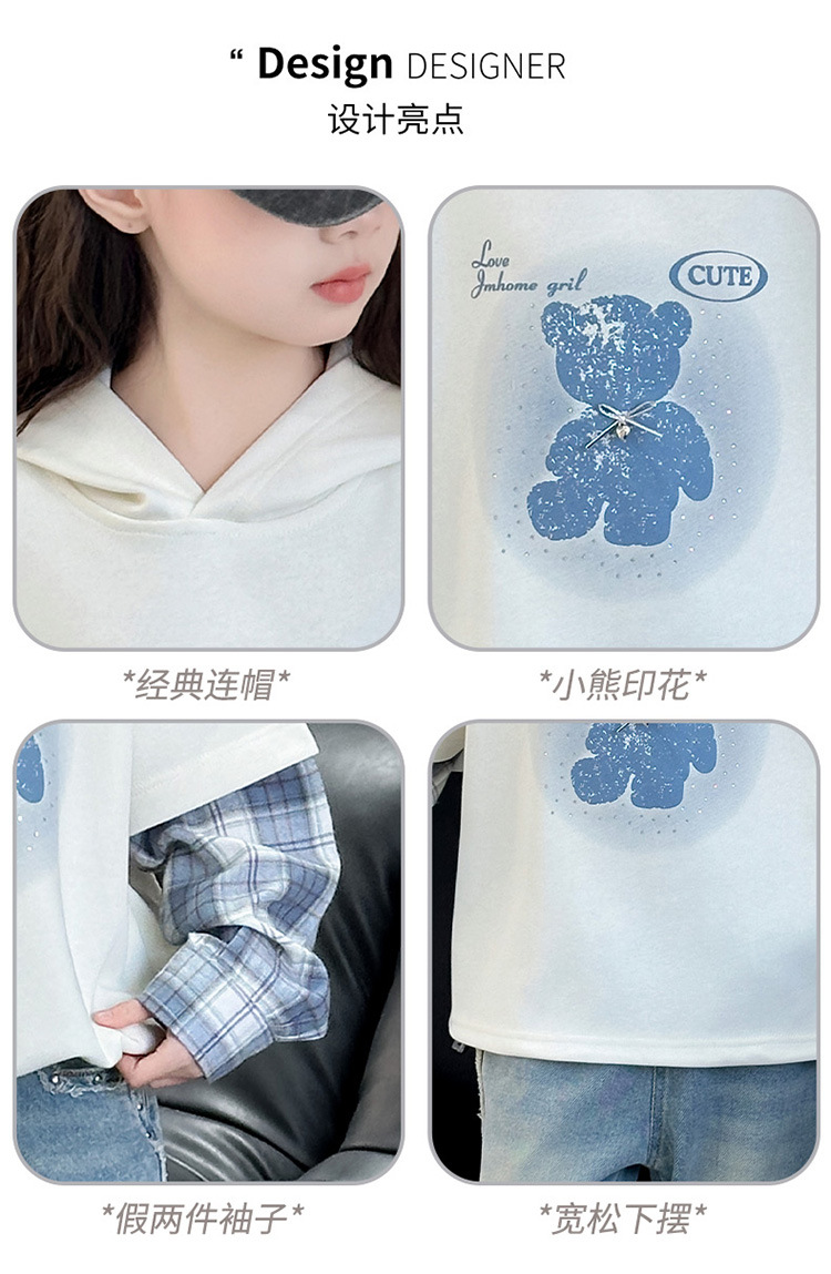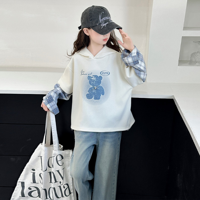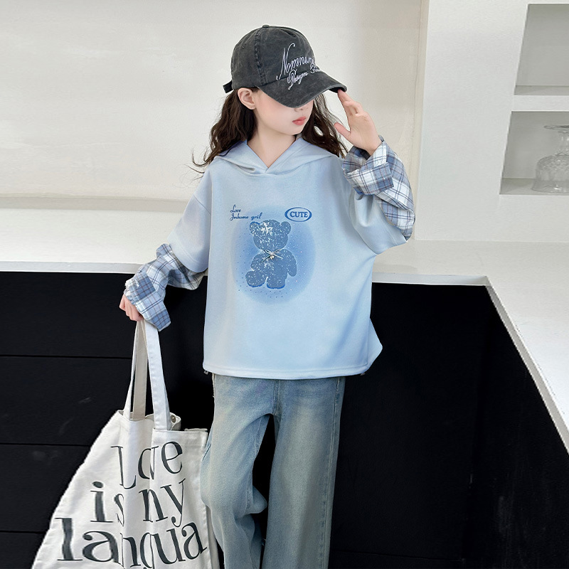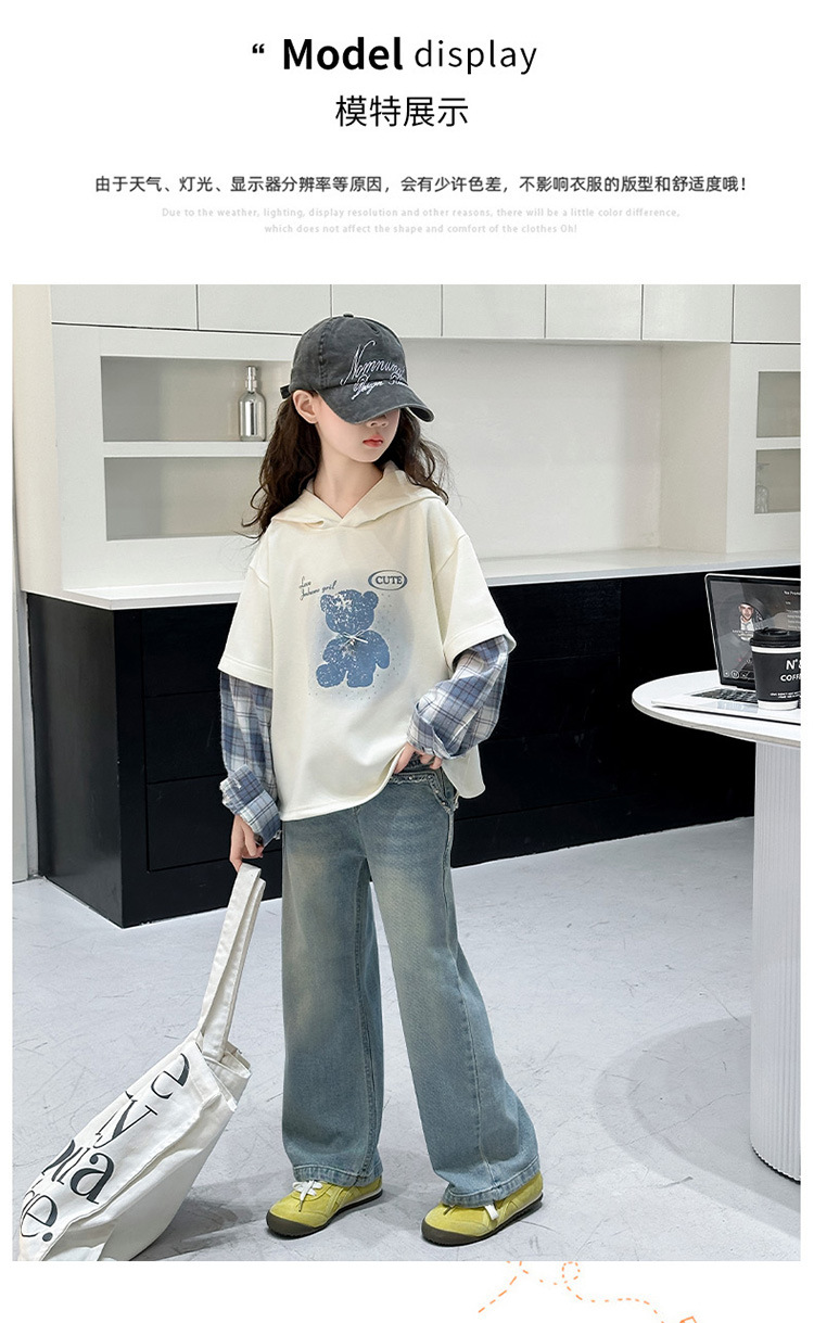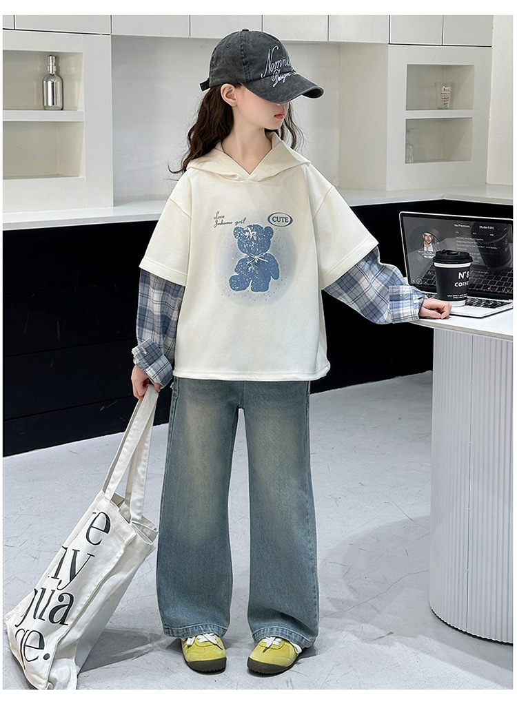소녀 봄 세트 도매 2025 새로운 가짜 두 후드 스웨터 쇠고기 바지 세트 소녀 패션 조수