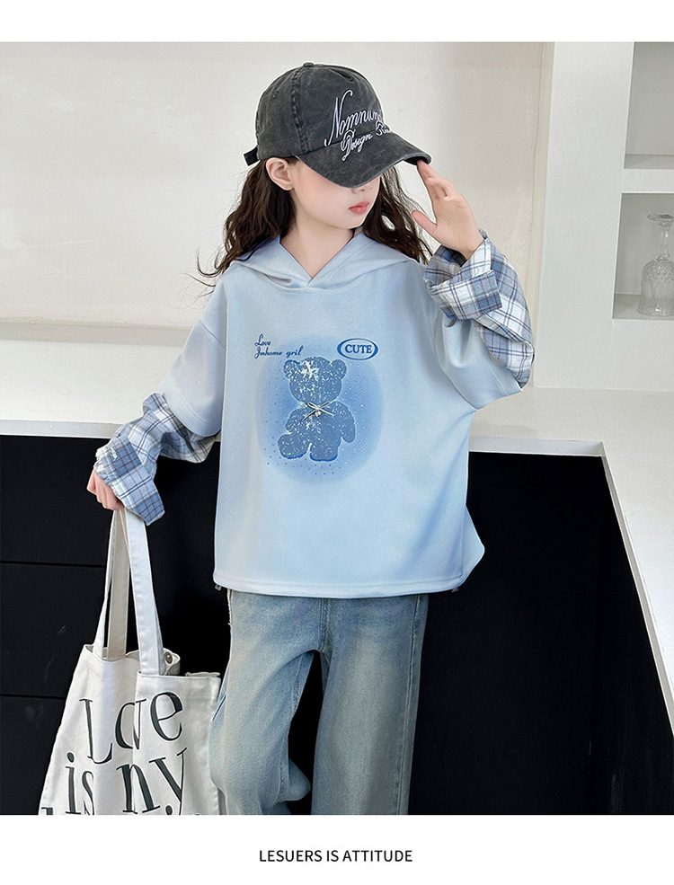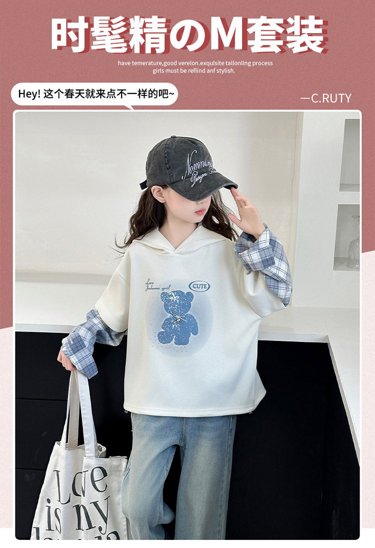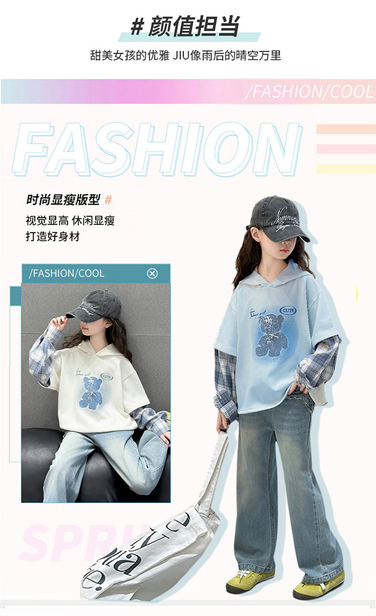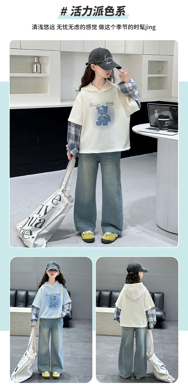 소녀 봄 세트 도매 2025 새로운 가짜 두 후드 스웨터 쇠고기 바지 세트 소녀 패션 조수스토어 가기