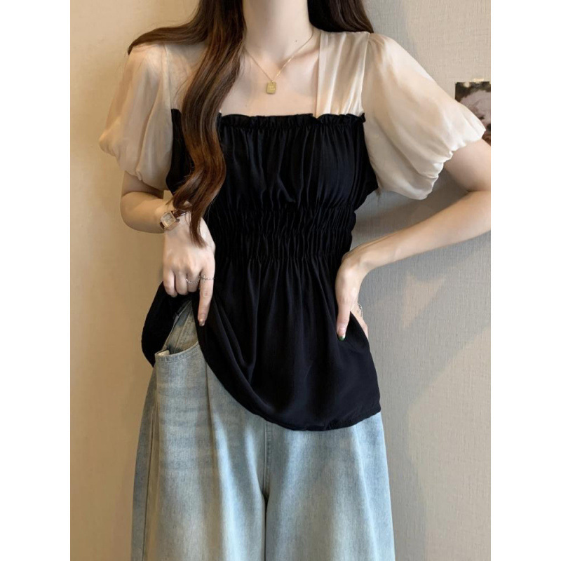 배꼽 덮고있는 시폰 셔츠 여성용 여름 플러스 사이즈 통통녀 타이트한 허리 슬리밍 메쉬 퍼프 슬리브 탑 프렌치 스퀘어 칼라 작은 셔츠스토어 가기