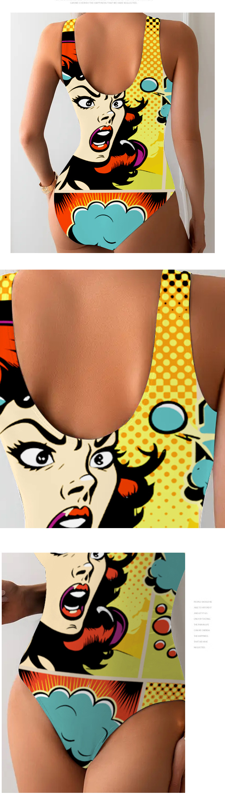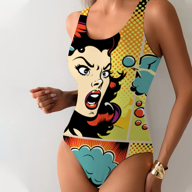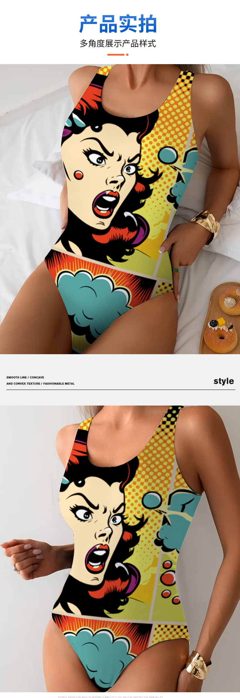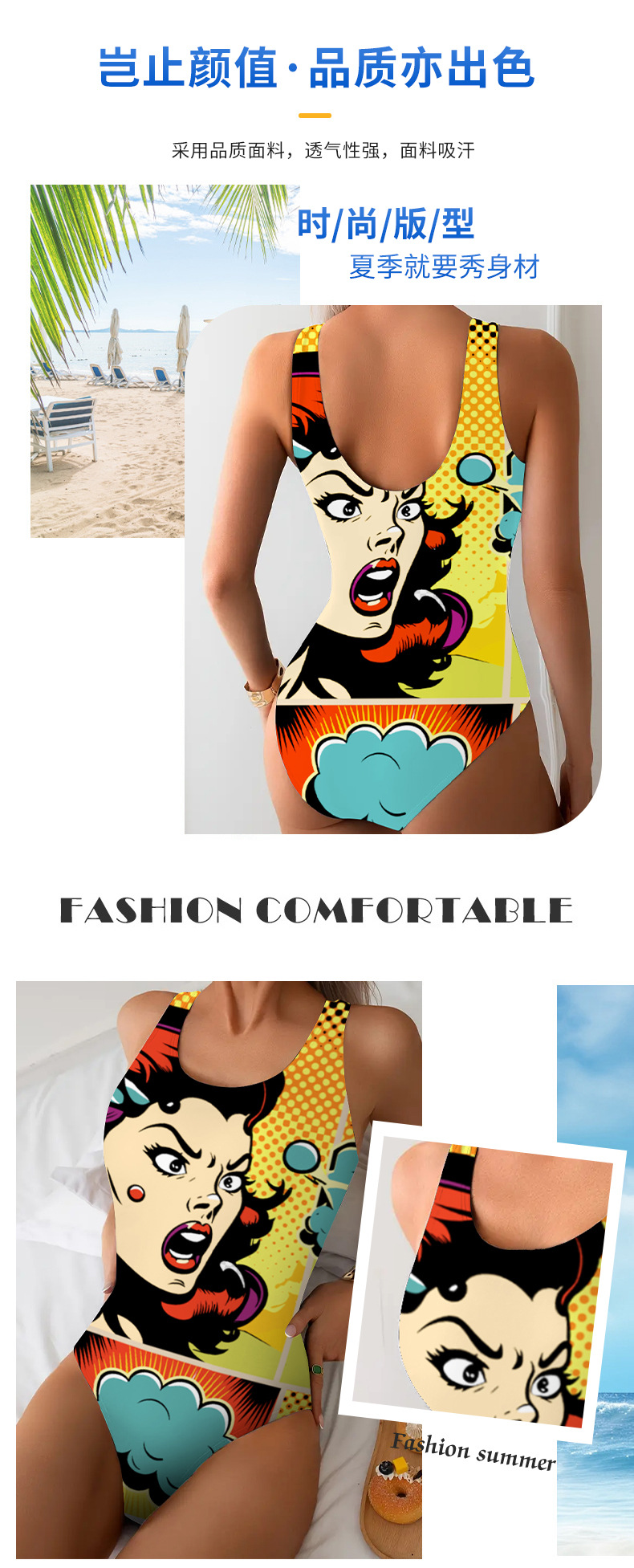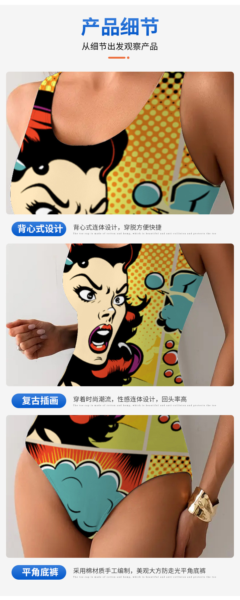 새로운 빈티지 일러스트 프린트 점프 수트 조끼 스타일 대형 U 칼라 온천 수영복 패션 트렌드 유럽과 미국 스타일의 대외 무역