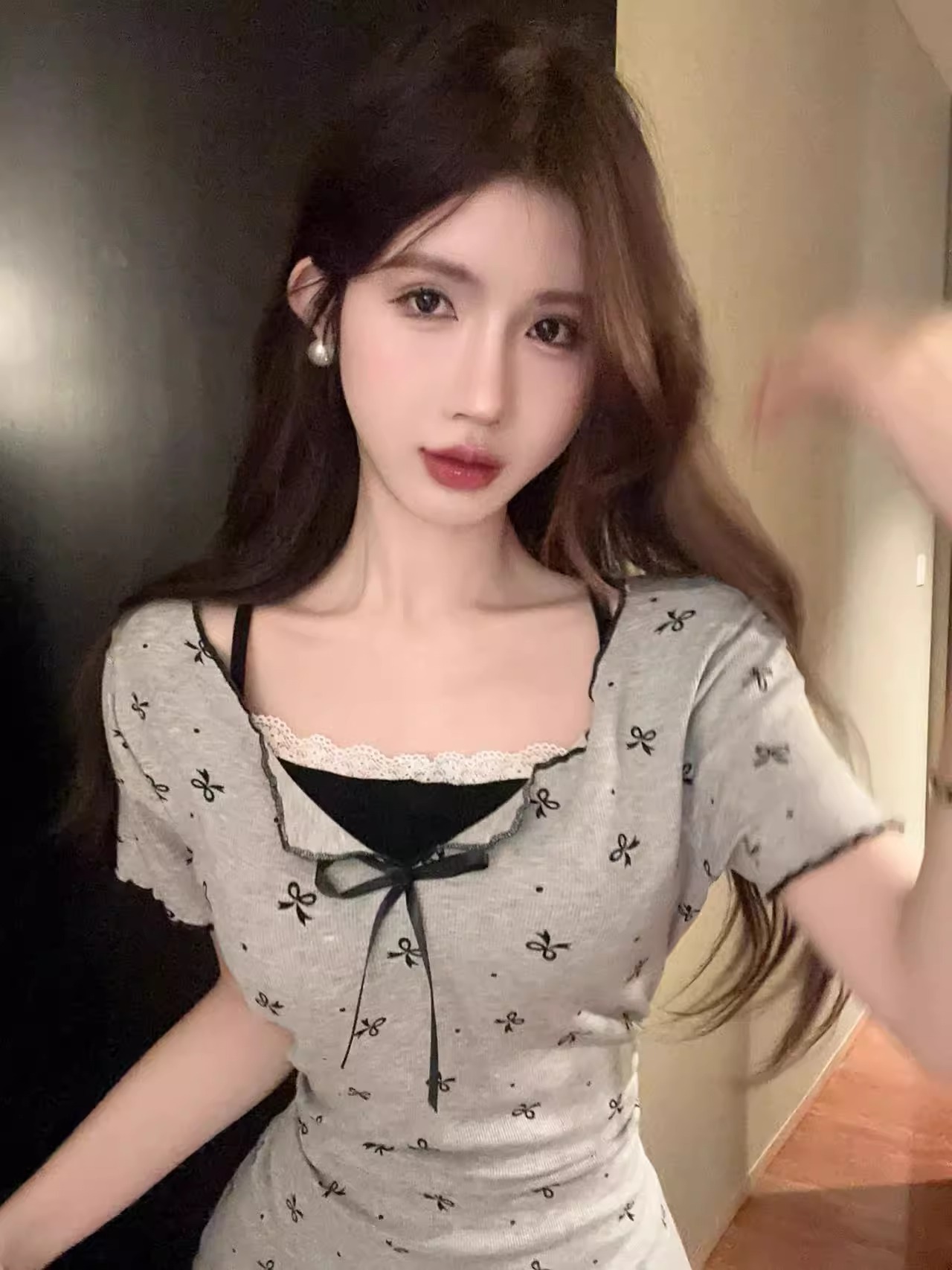 프랑스 스타일 우아한 회색 인쇄 반팔 원피스 여성 여름 2025 작은 허리 슬리밍 가짜 투피스 스커트