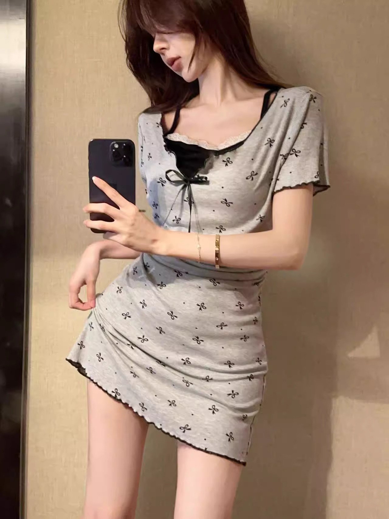 프랑스 스타일 우아한 회색 인쇄 반팔 원피스 여성 여름 2025 작은 허리 슬리밍 가짜 투피스 스커트스토어 가기
