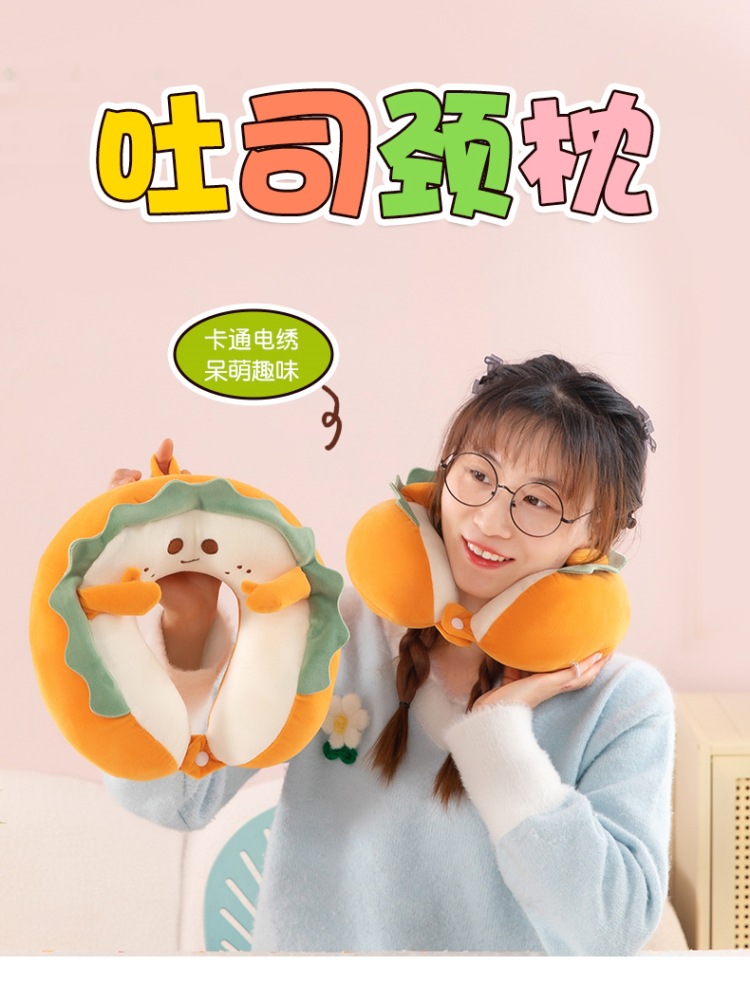 ✅자동차 여행을위한 귀여운 토스트 빵 U 자형 목 베개 목 보호 휴대용 U 자형 베개 머리 자궁 경부 베개 여성용스토어 가기