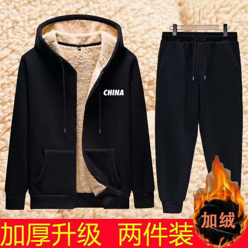 가을과 겨울 남자 양가죽 후드 스웨터 세트 세련된 따뜻한 기모 두꺼운 코트 캐주얼 스포츠 카디건스토어 가기