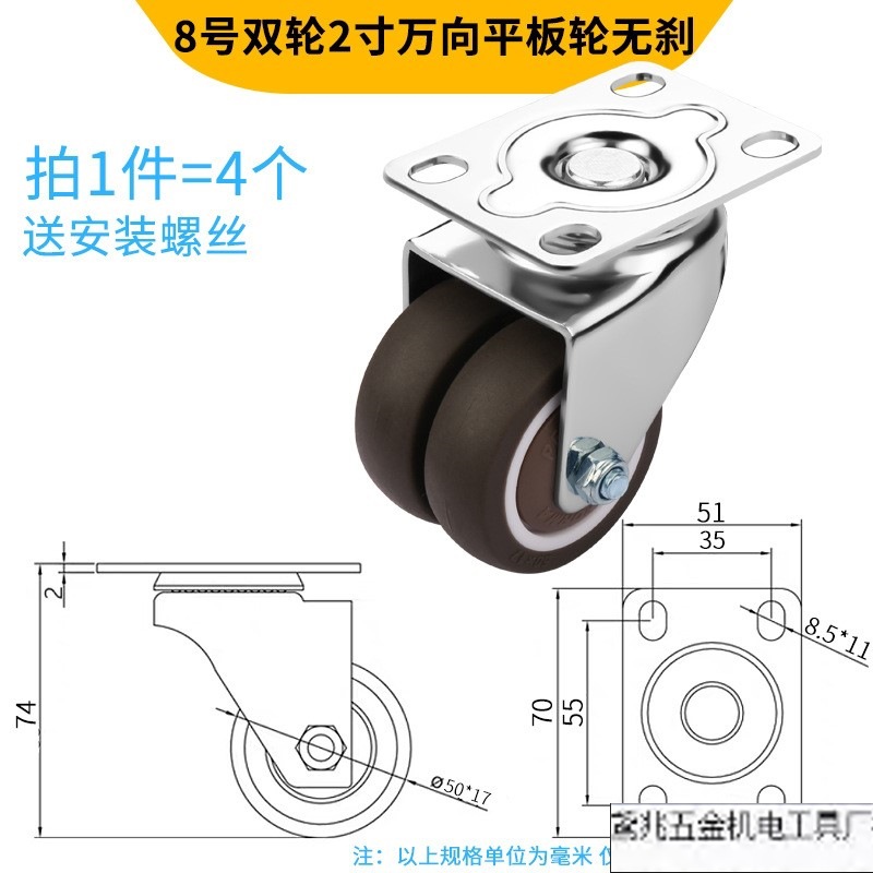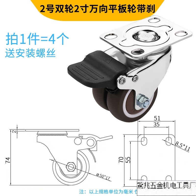 • No. 17 이중 휠 2인치 범용 플랫 휠(브레이크 포함) 4개