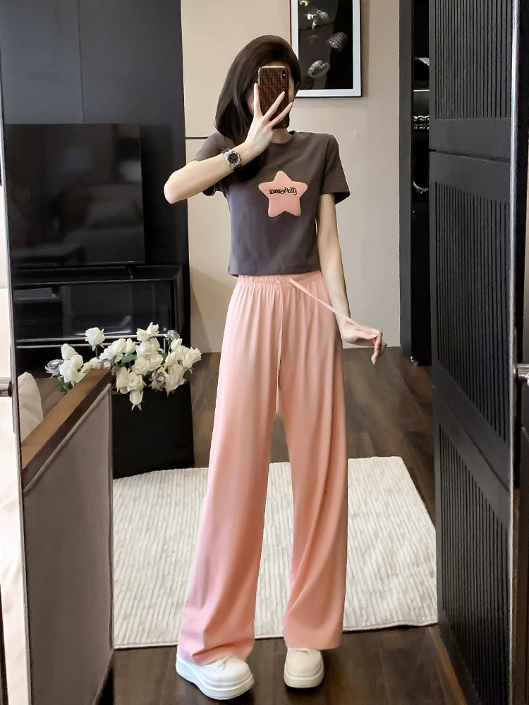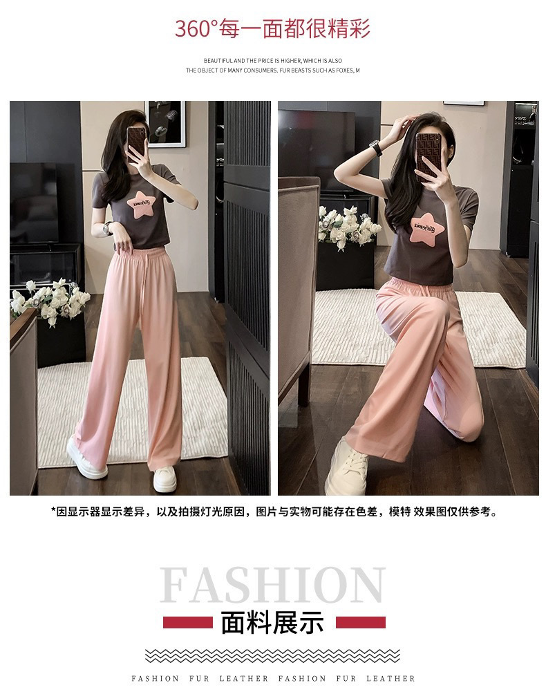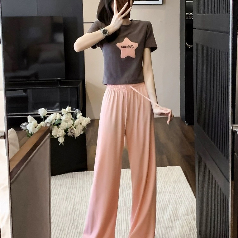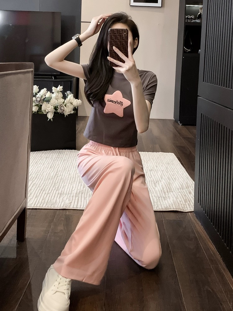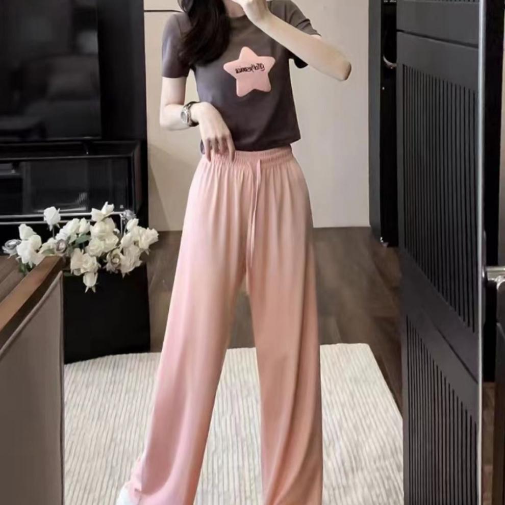 캐주얼 스포츠 투피스 여성 2025 여름 세련 된 반소매 탑 유행 나이 감소 와이드 레그 바지 세트