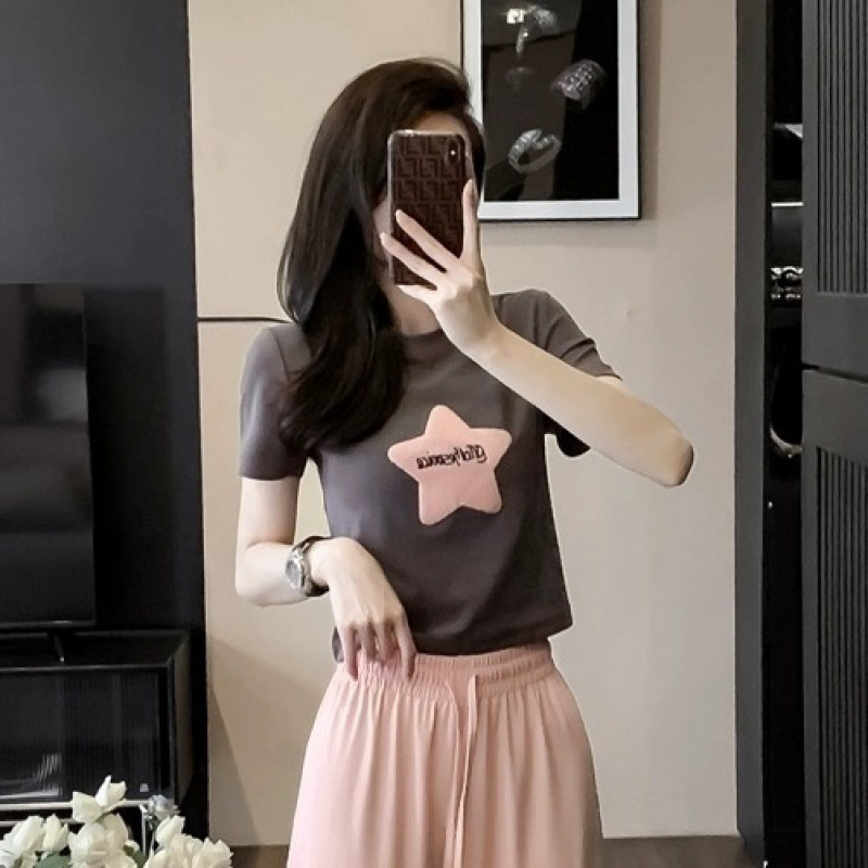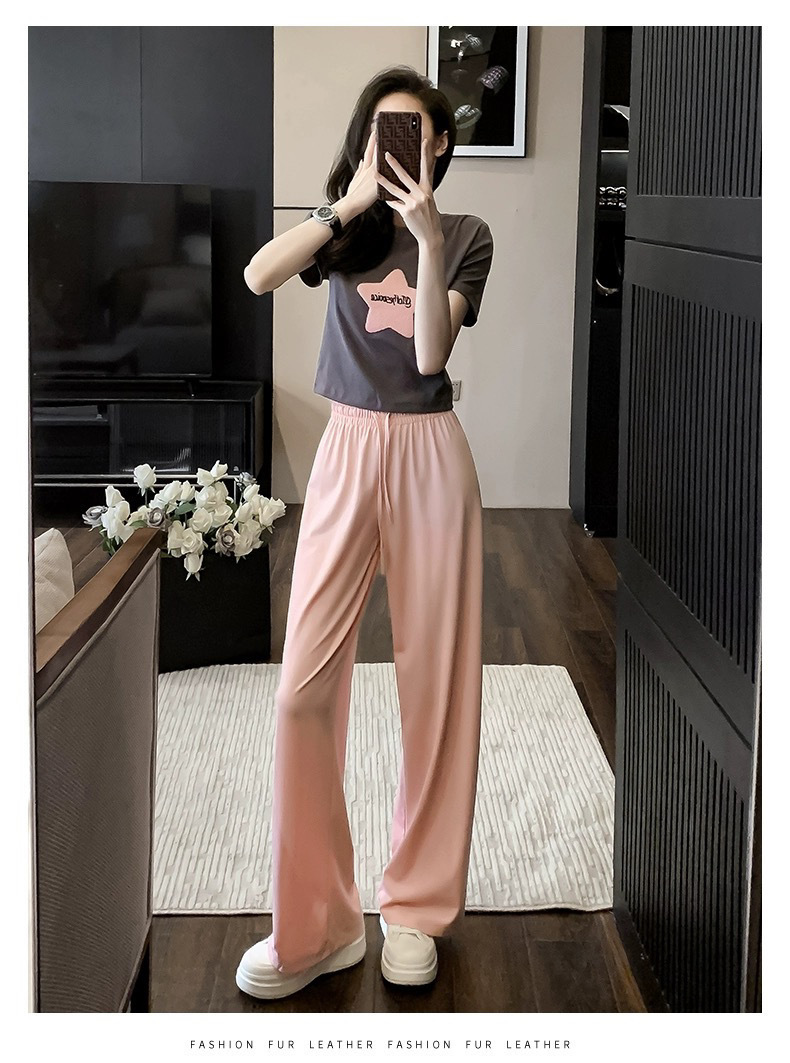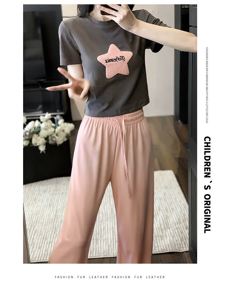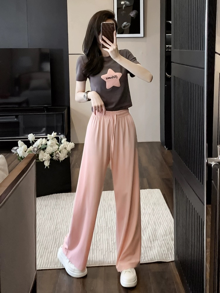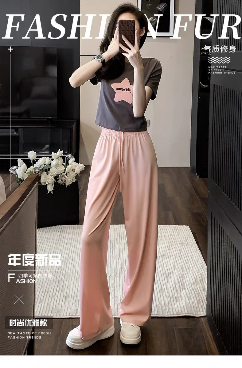 캐주얼 스포츠 투피스 여성 2025 여름 세련 된 반소매 탑 유행 나이 감소 와이드 레그 바지 세트