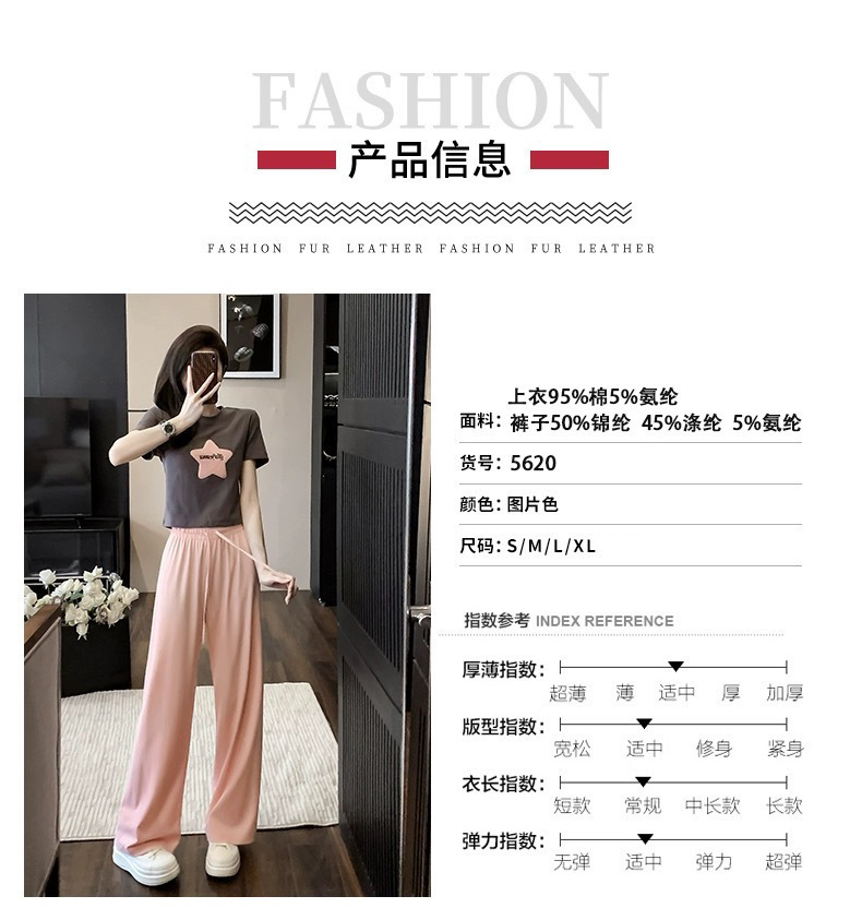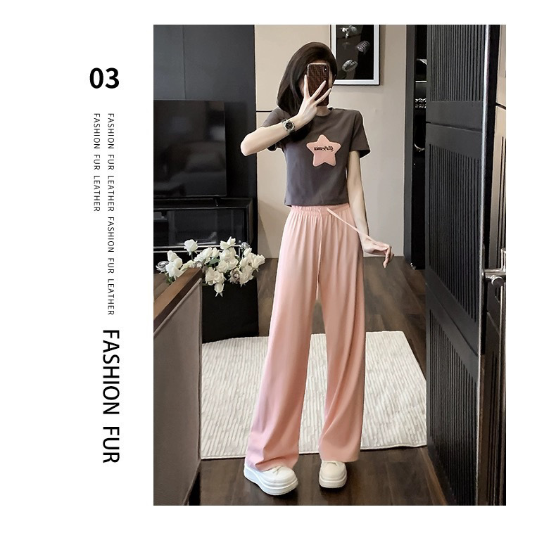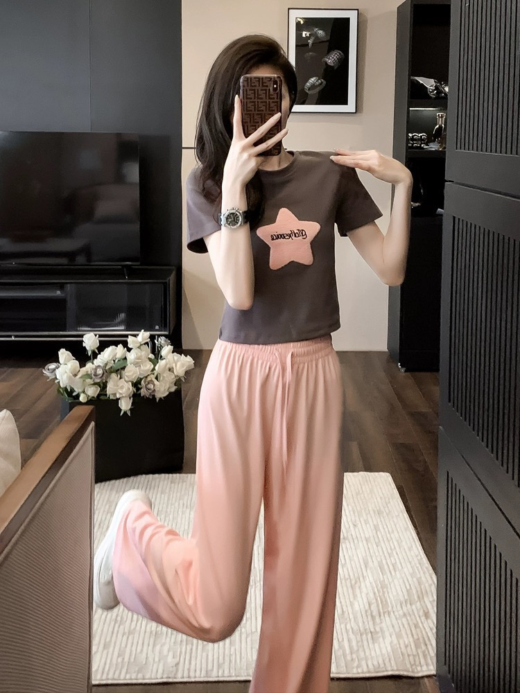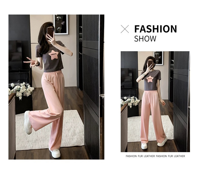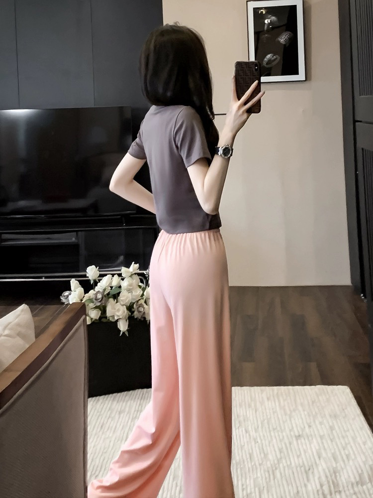 캐주얼 스포츠 투피스 여성 2025 여름 세련 된 반소매 탑 유행 나이 감소 와이드 레그 바지 세트스토어 가기