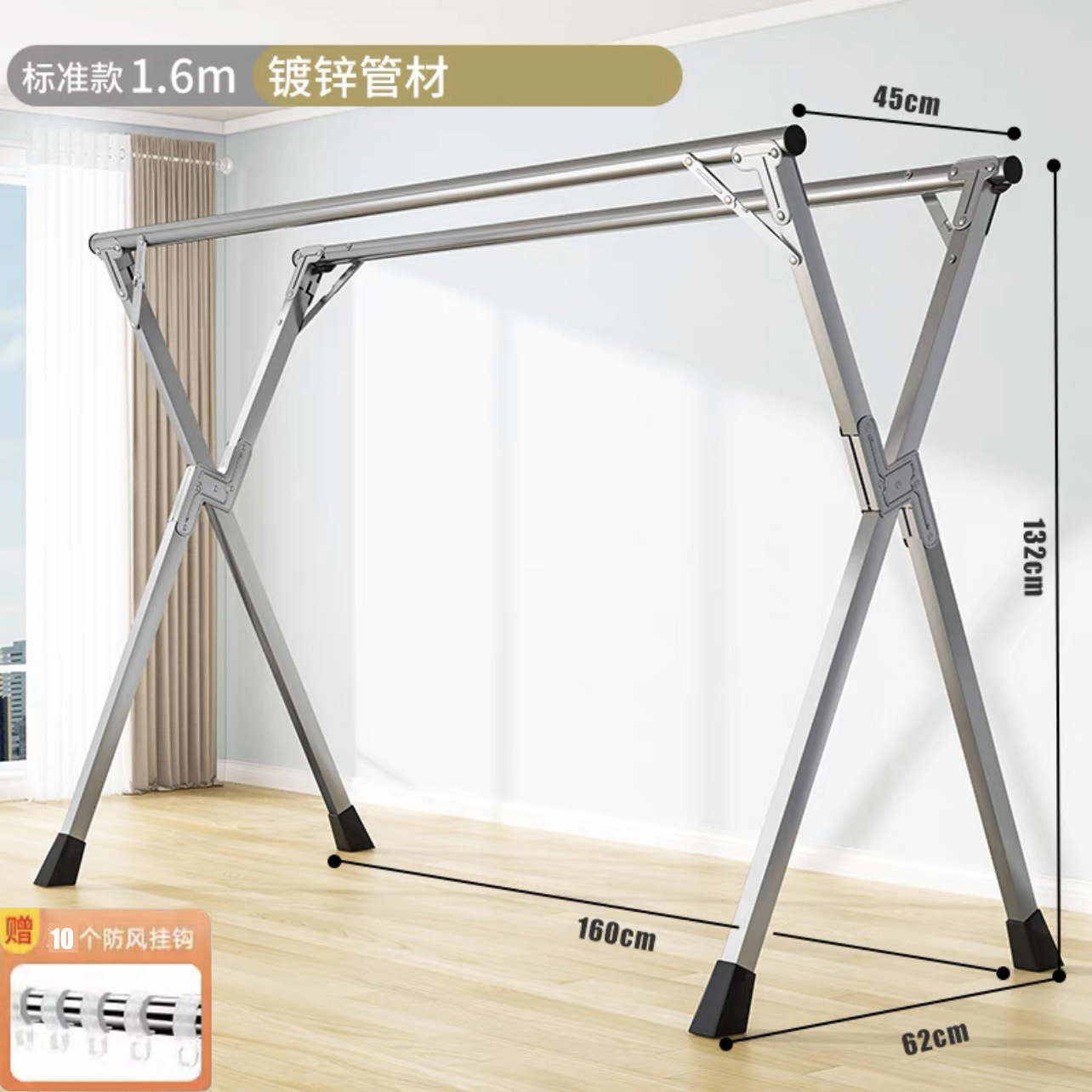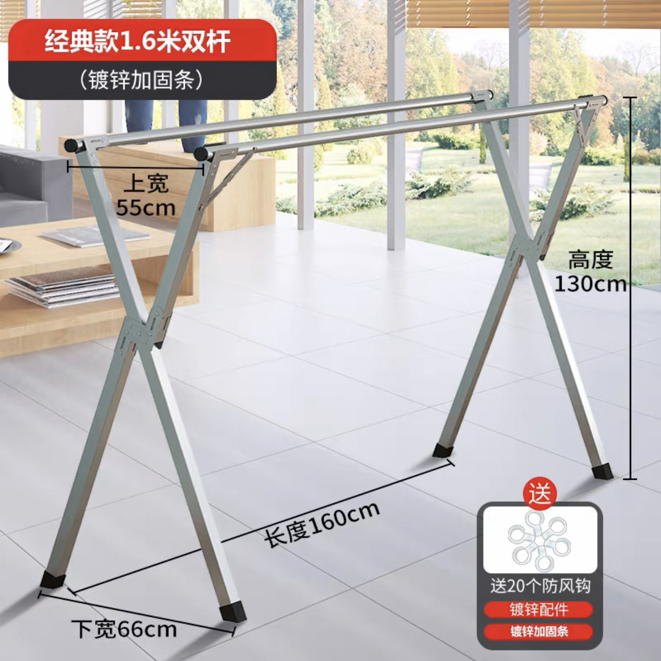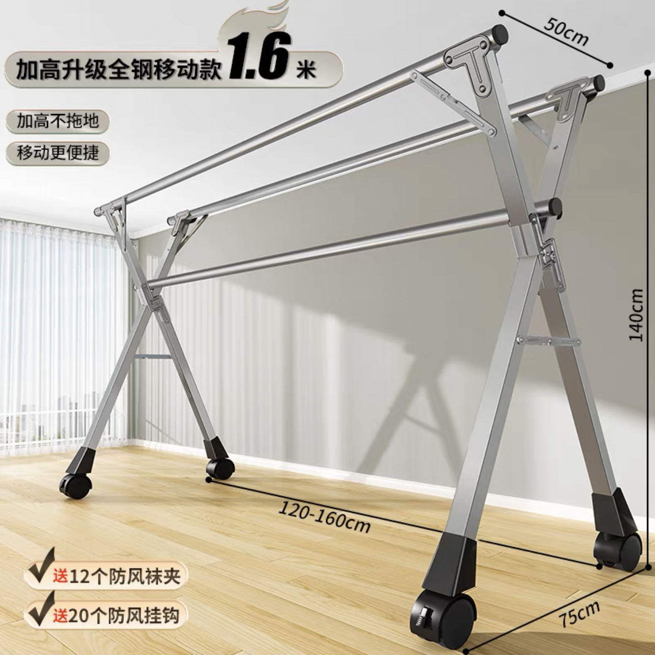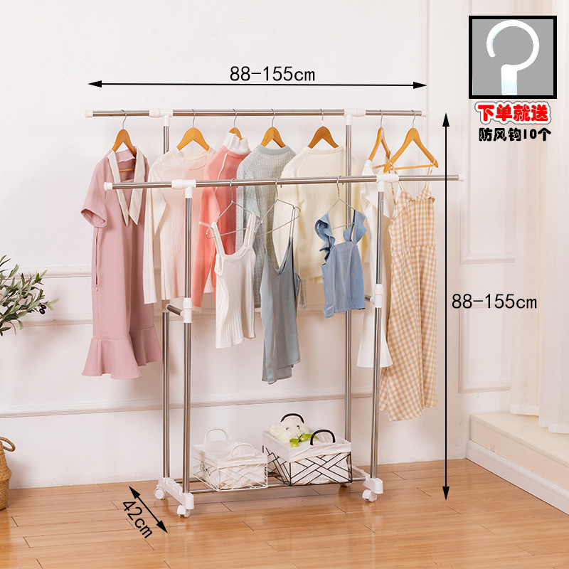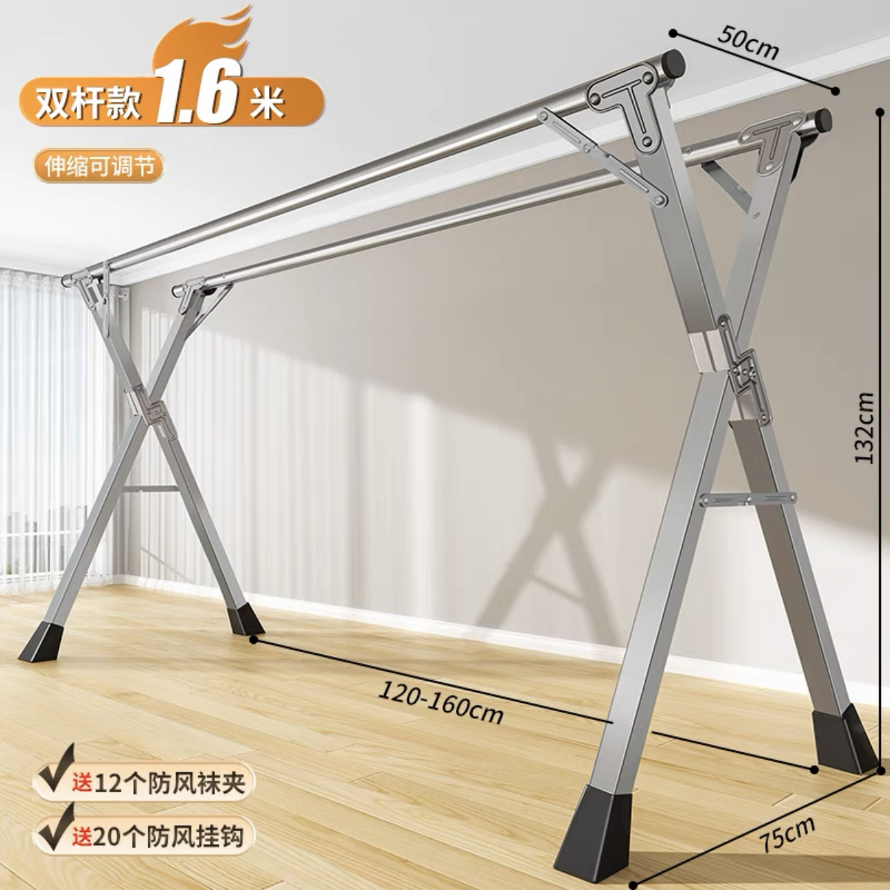 • [자유롭게 수납 가능] 두꺼운 이중 폴 1.6m [방풍 후크 20개 + 양말 클립 12개]