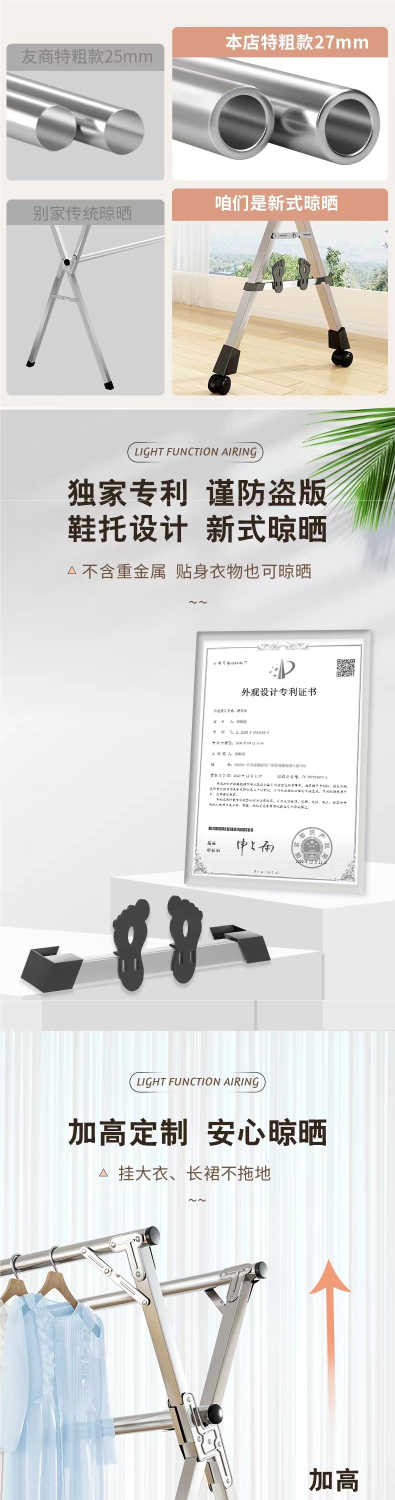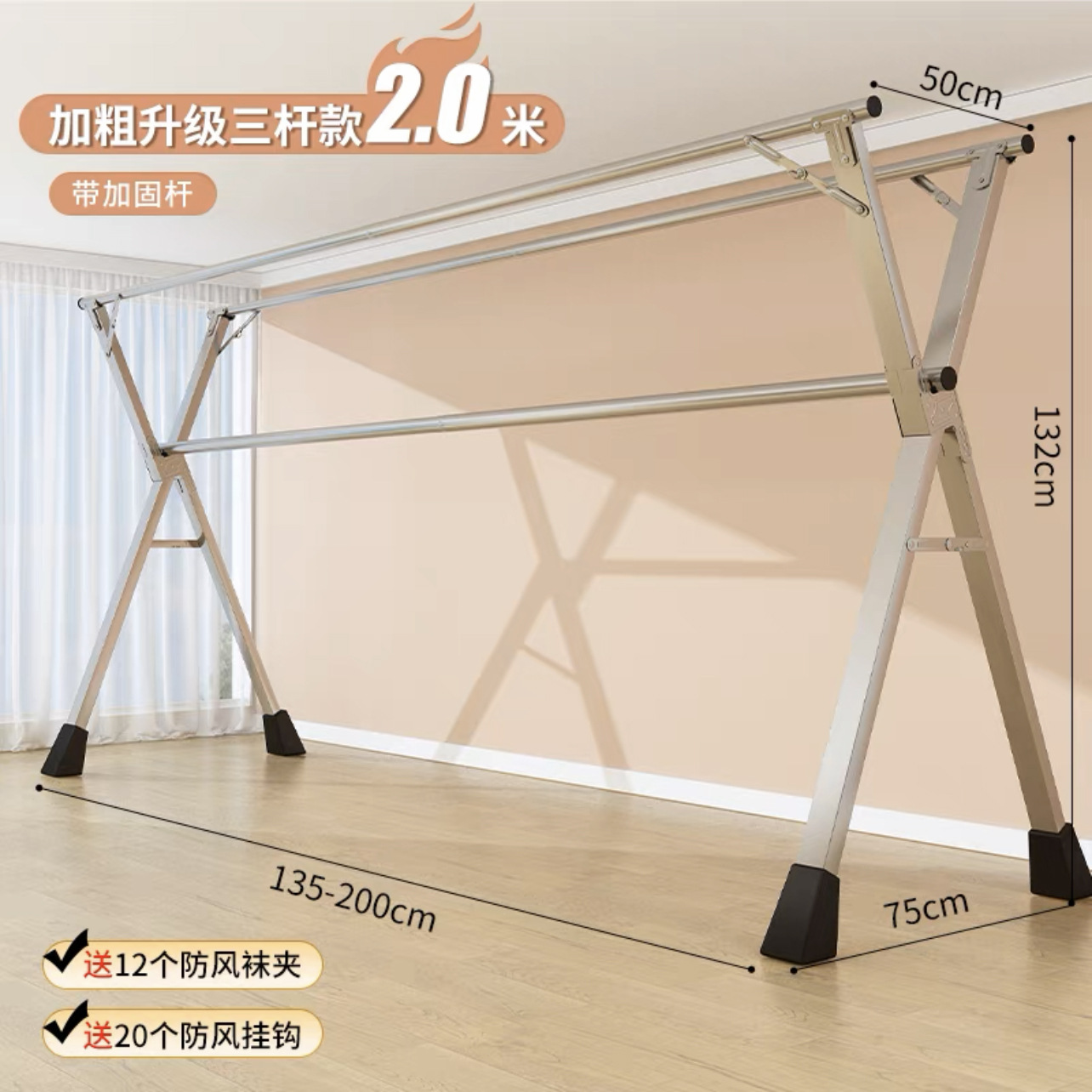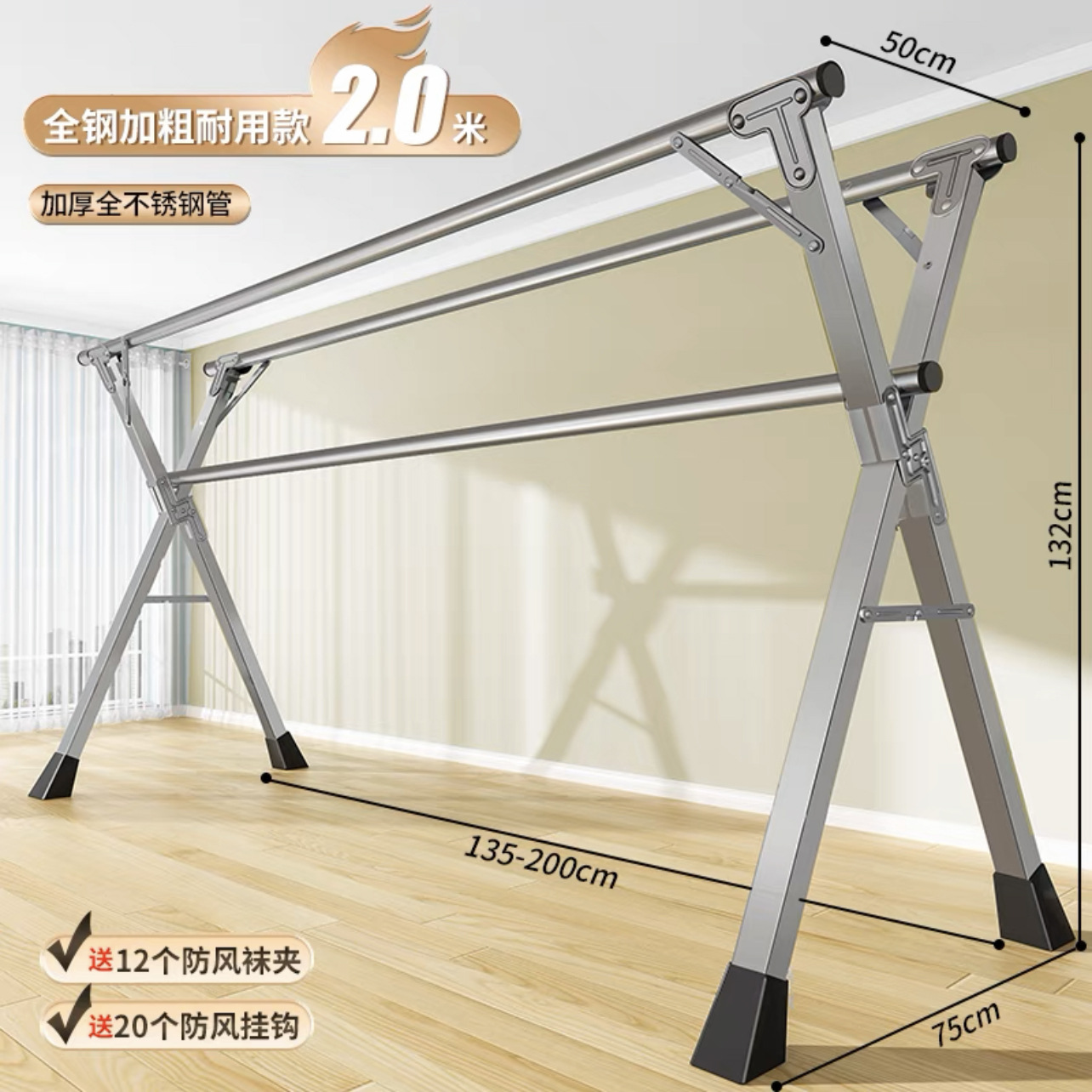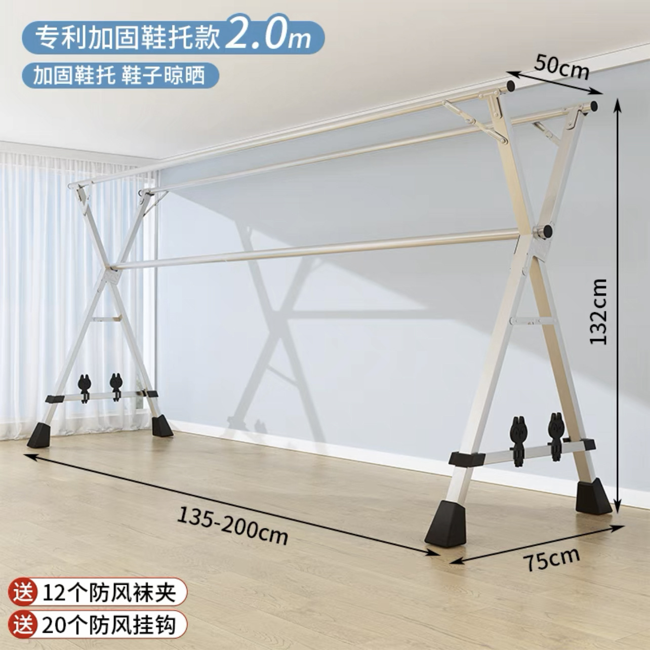 • [업그레이드된 올스틸 신발 지지대] 두꺼운 3극 2.0m [방풍 후크 20개 + 양말 클립 12개]