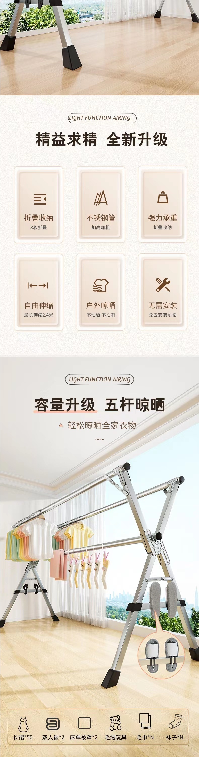 • [플래그십 올스틸 풀리 + 신발 지지대] 특대 3극 2.4m [방풍고리 20개 + 양말 12개
