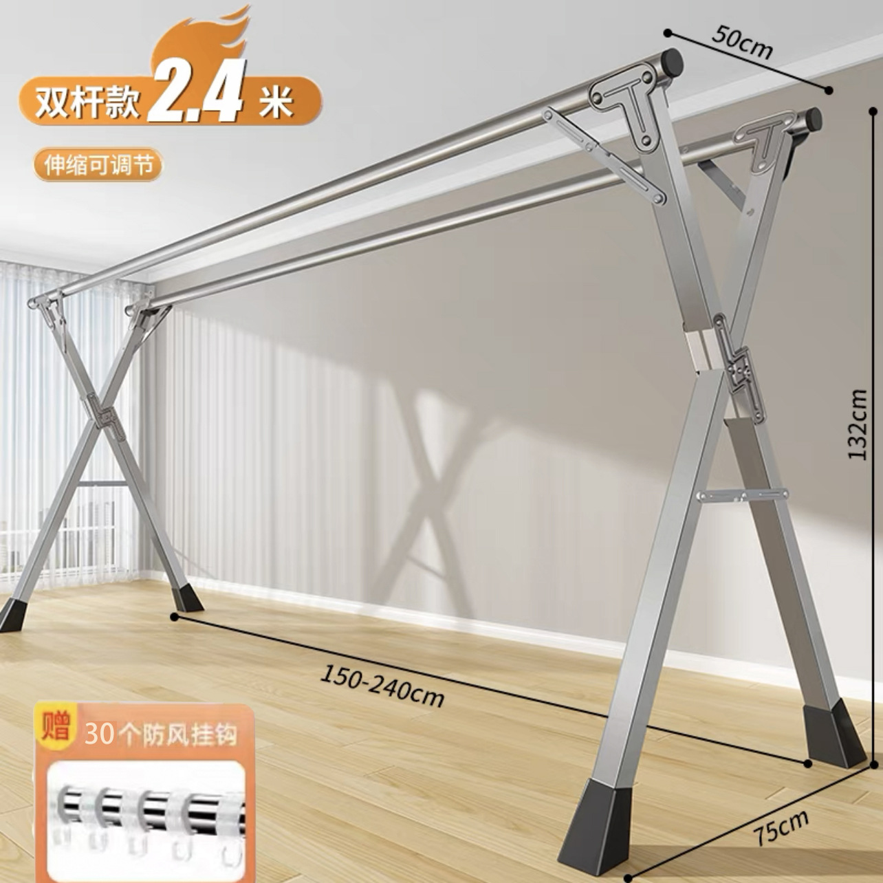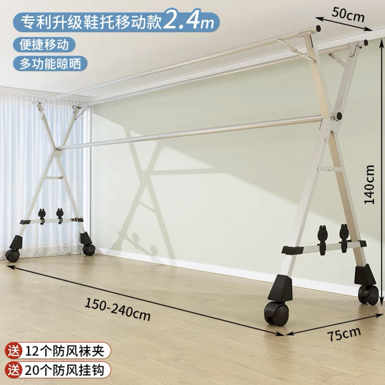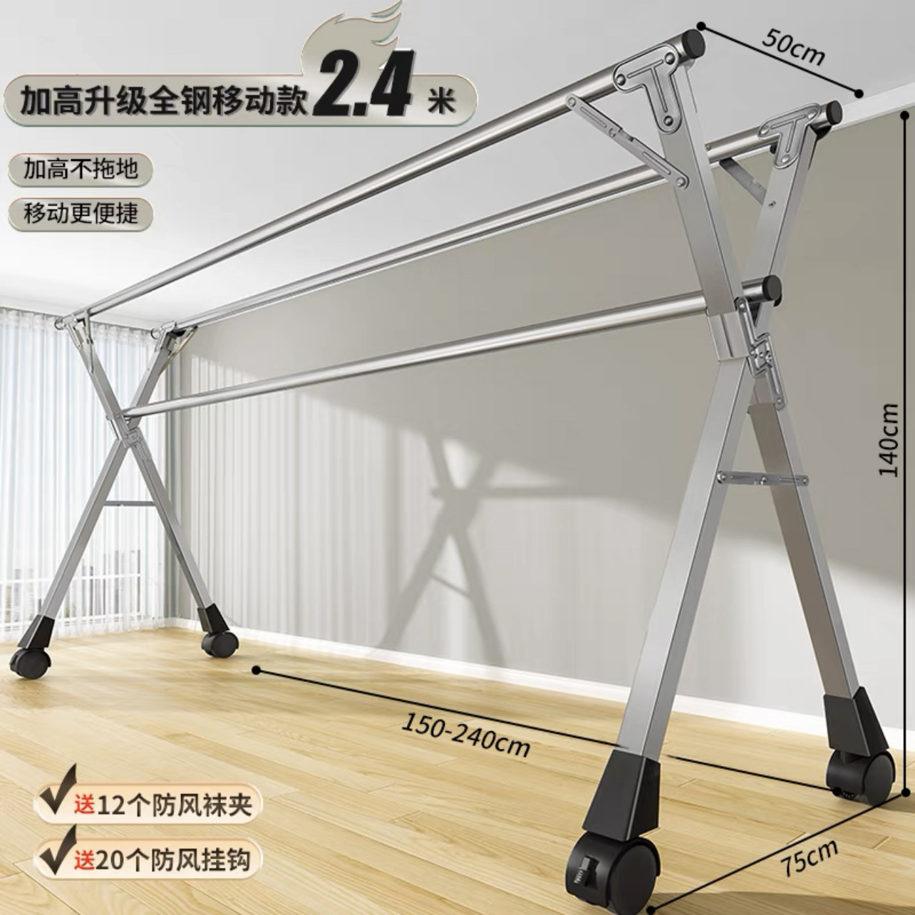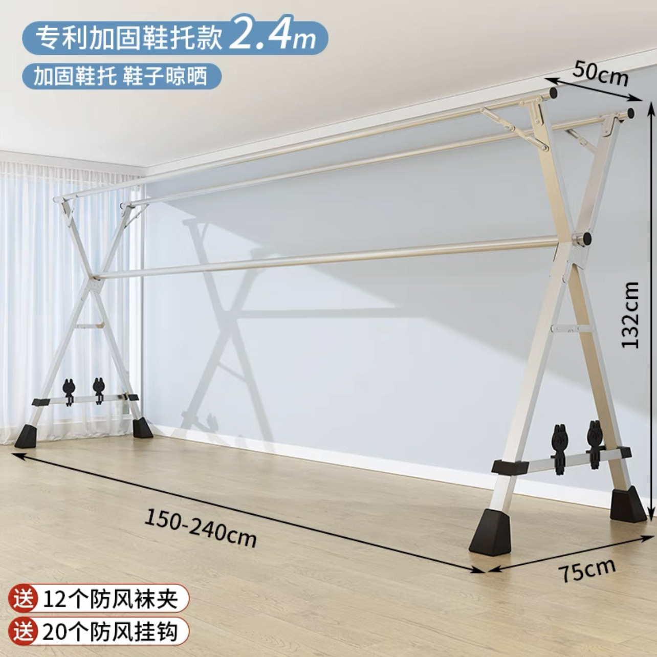 • [자유롭게 수납 가능] 두꺼운 이중 폴 2.4m [방풍 후크 20개 + 양말 클립 12개]