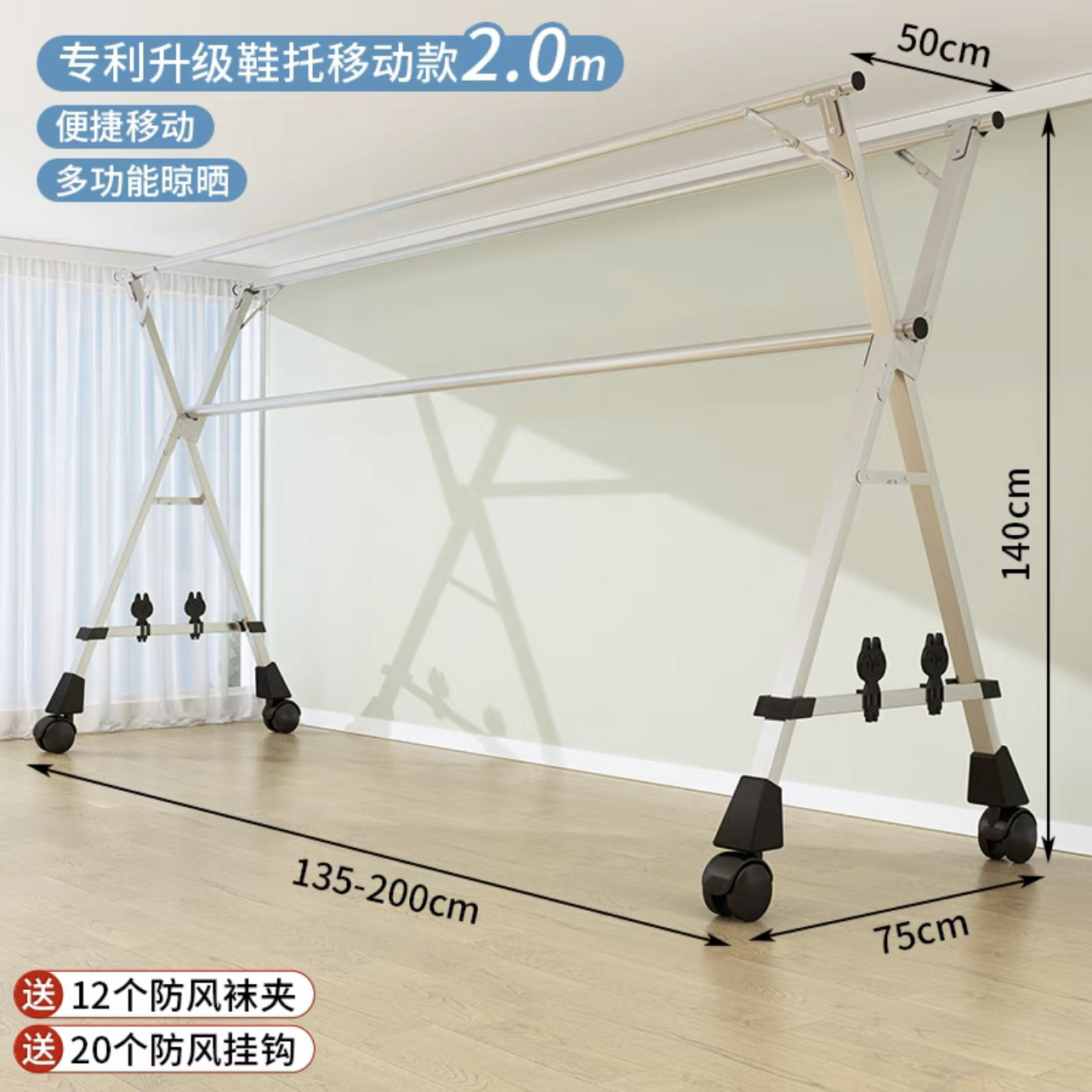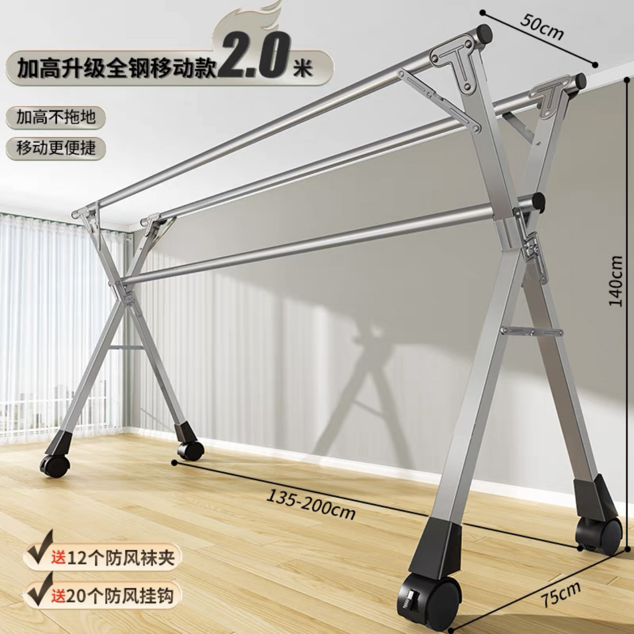 • [자유롭게 수납 가능] 두꺼운 이중 폴 2.0m [방풍 후크 20개 + 양말 클립 12개]