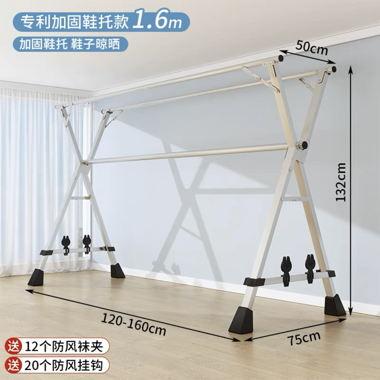 • [업그레이드된 올스틸 신발 지지대] 두꺼운 3극 1.6m [방풍 후크 20개 + 양말 클립 12개]