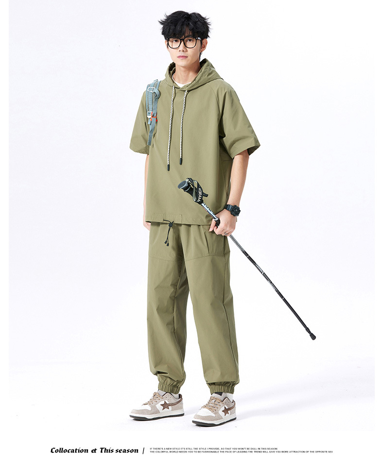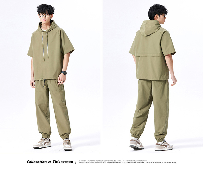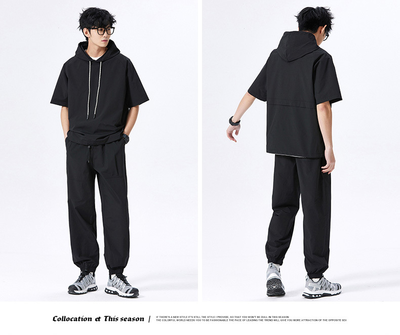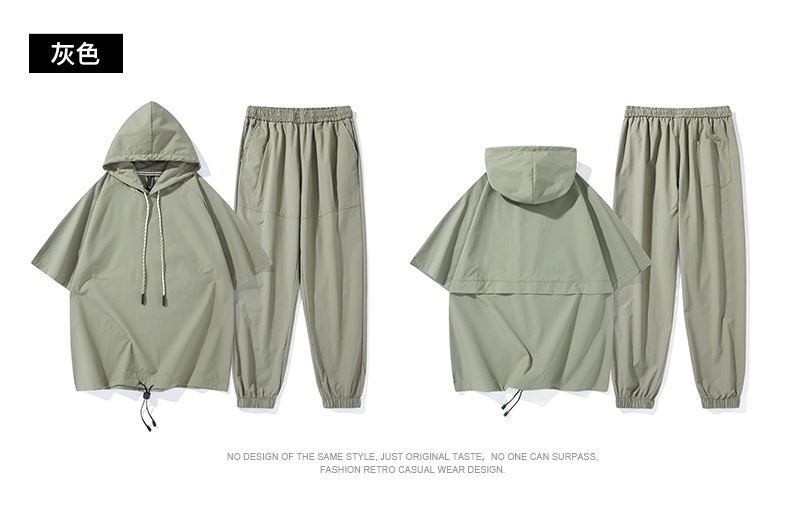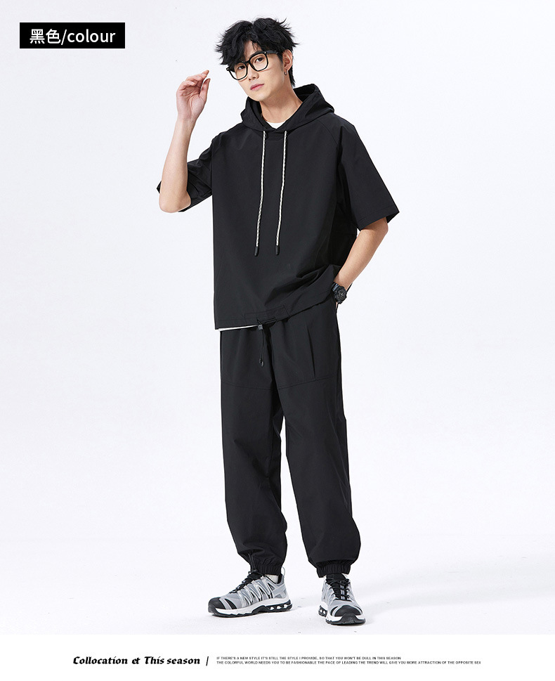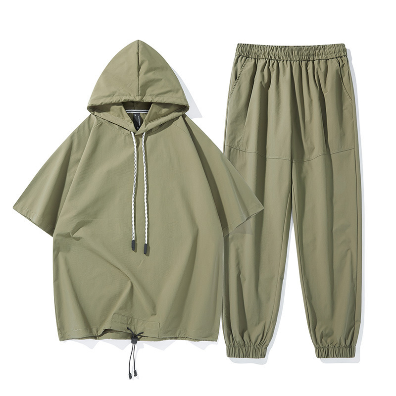무료 배송 스포츠 세트 남자 2025 봄과 여름 달리기 피트니스 느슨한 캐주얼 아이스 실크 후드 짧은 소매 티셔츠 바지 2