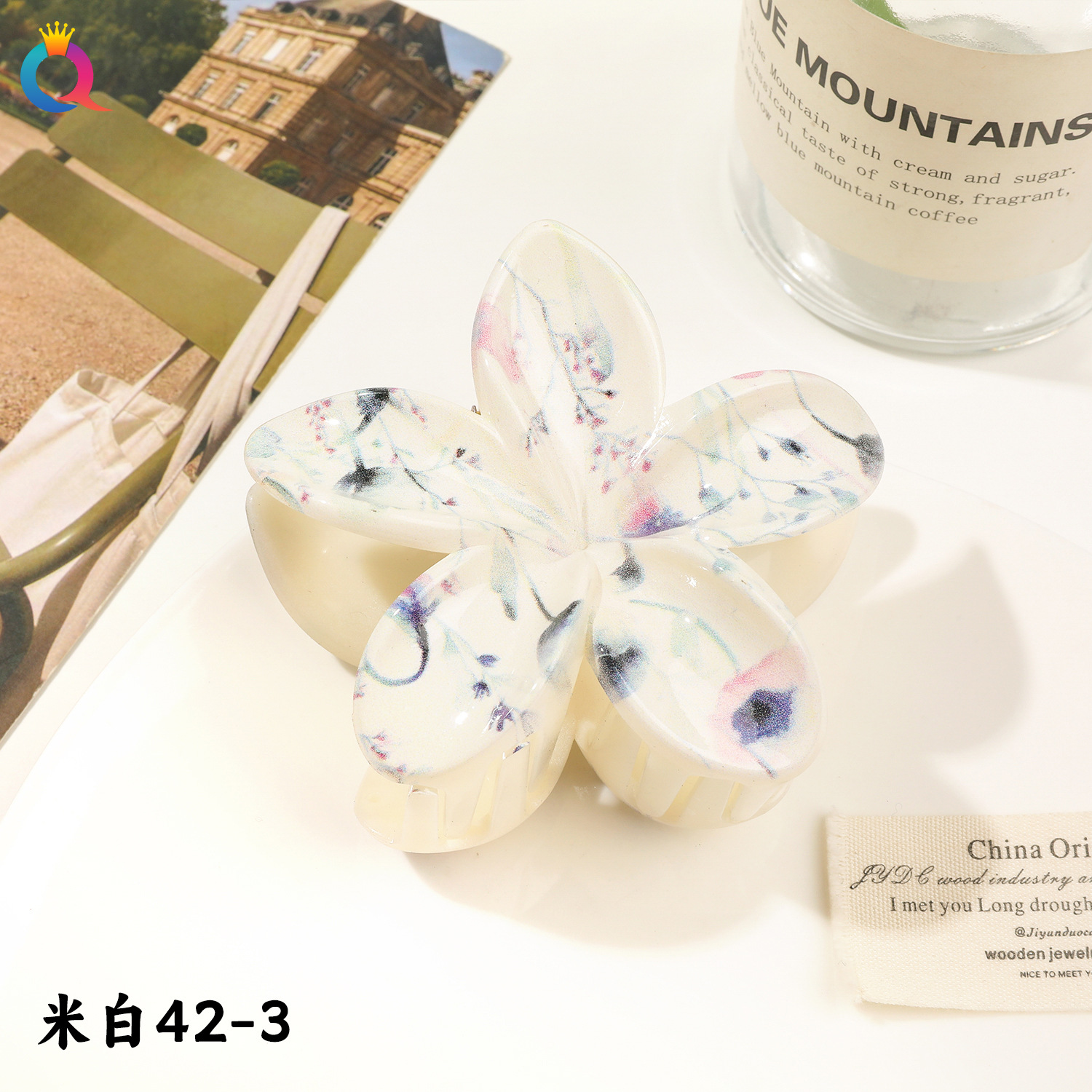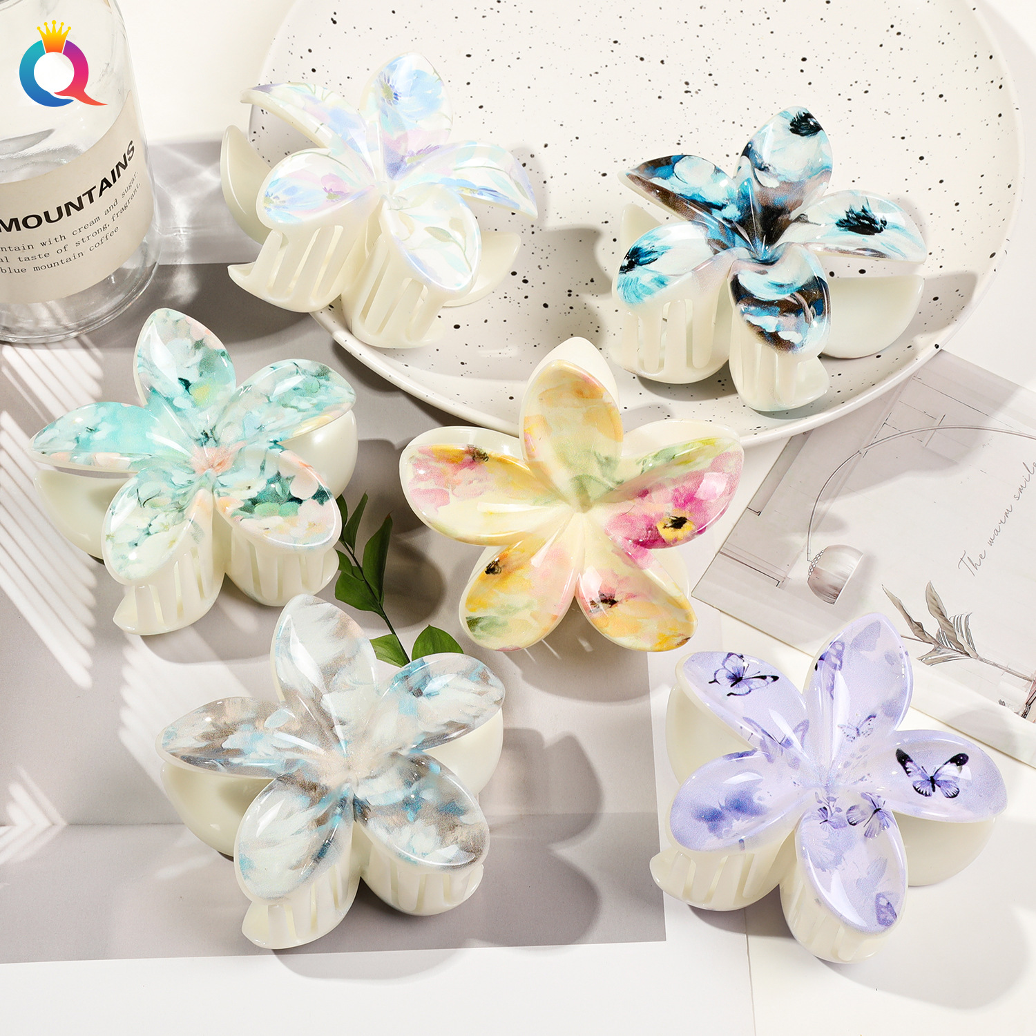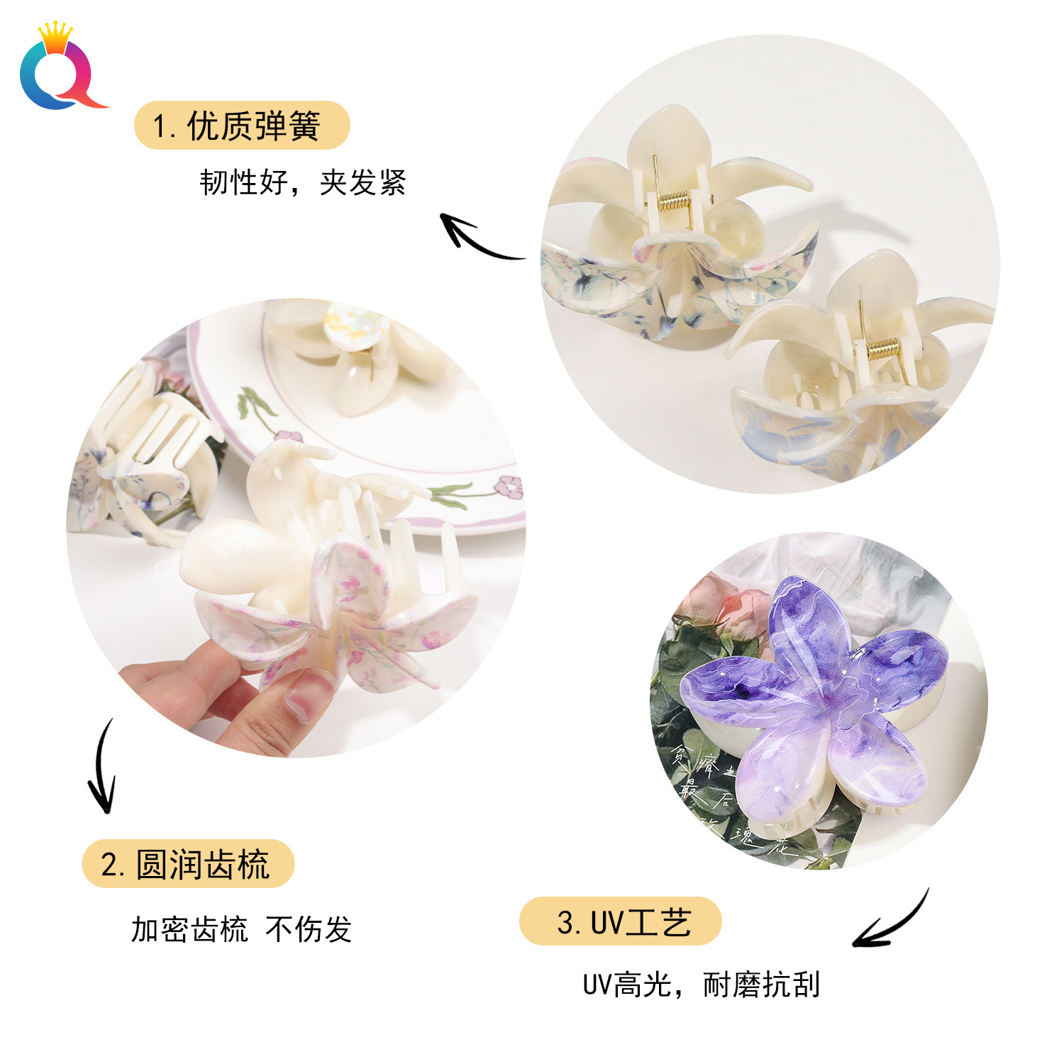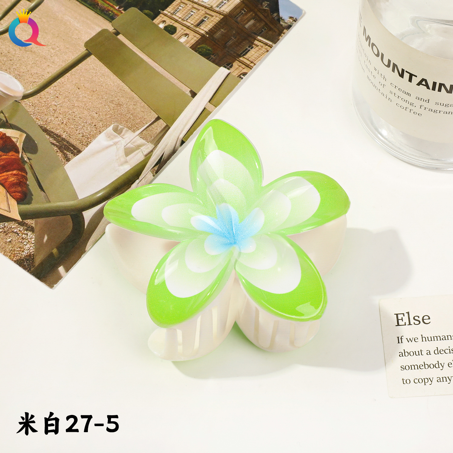 치유에의 새로운 크로스보더 플루메리아 헤어 클립, 패셔너블한 UV 프린팅 자스민 헤어핀, 유럽 및 미국 스타일의 창의적인 꽃 모양 샤크 클립