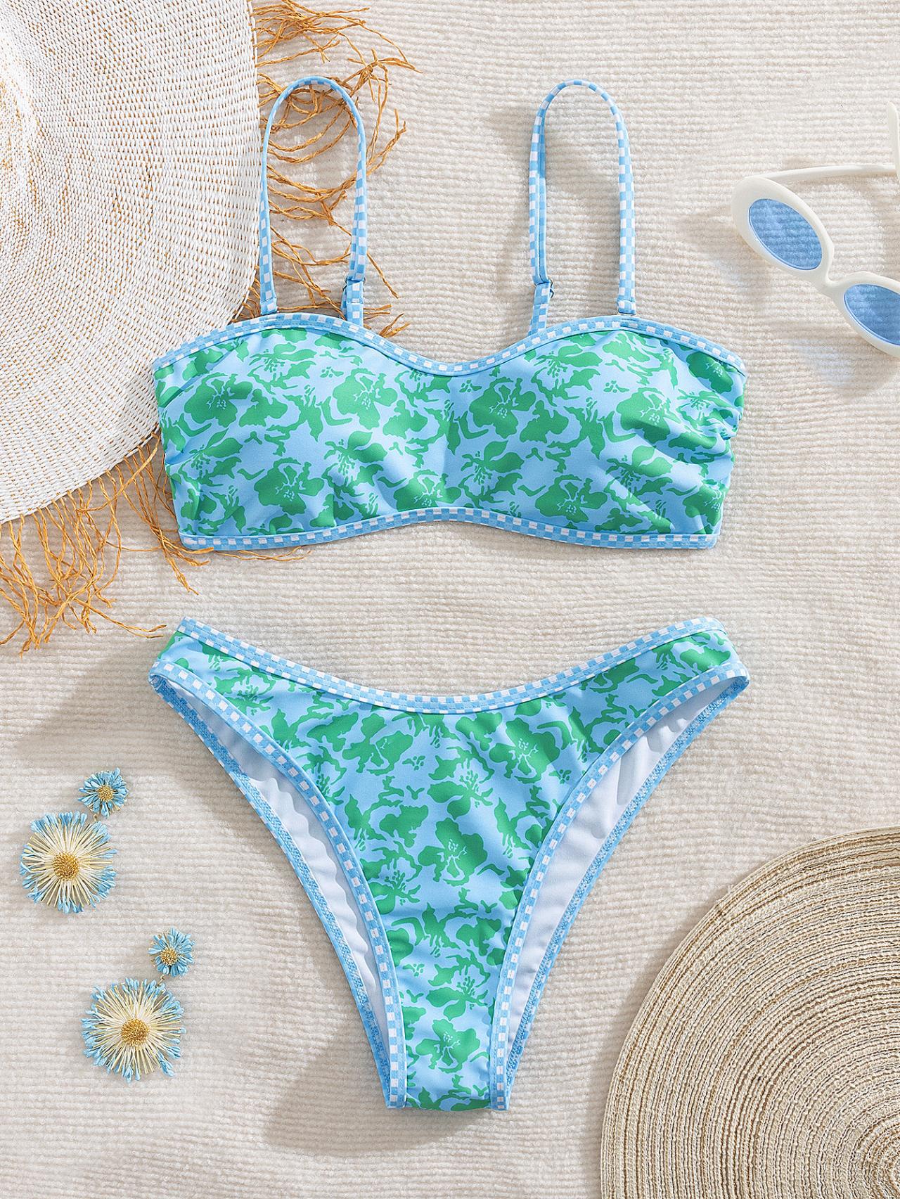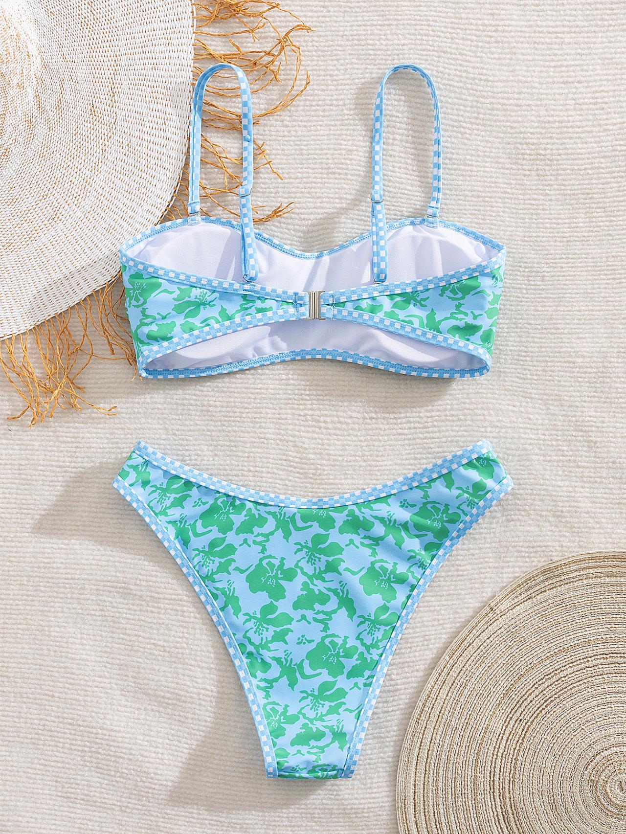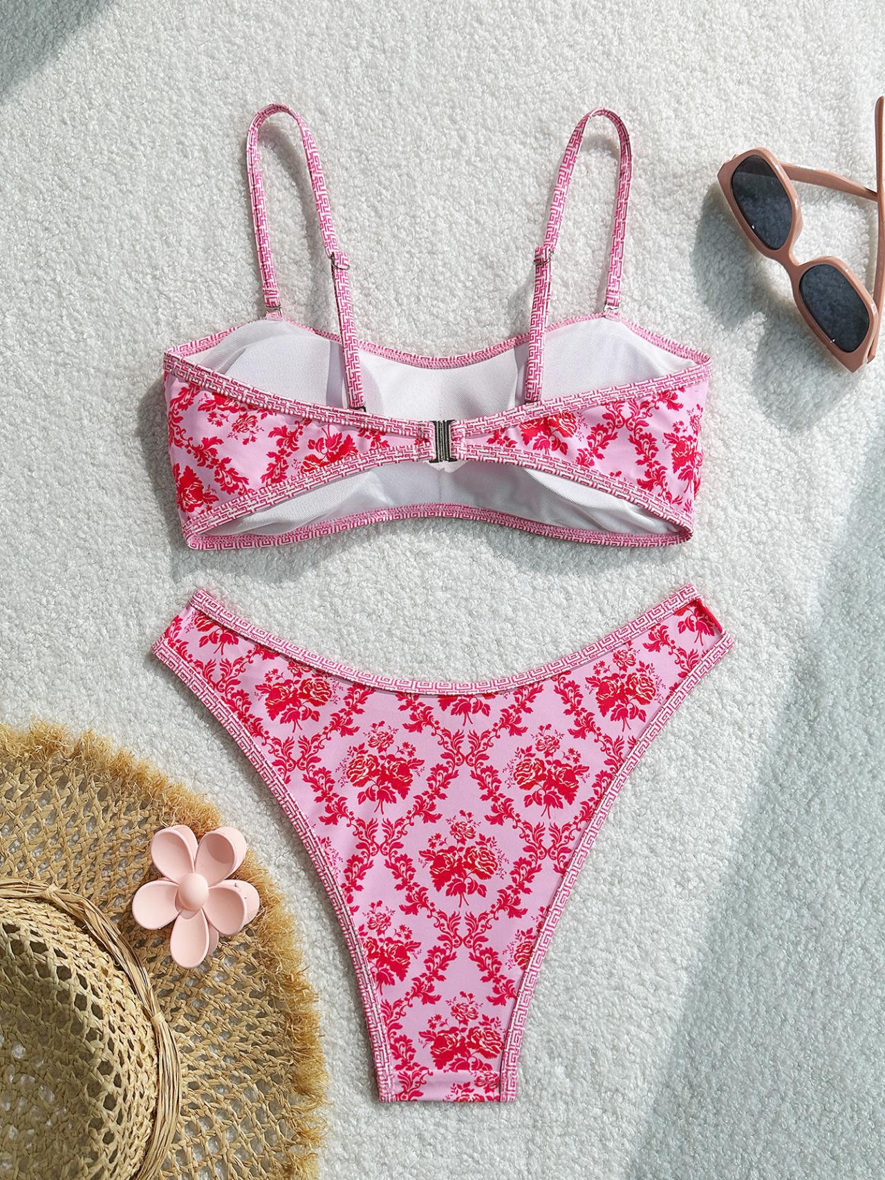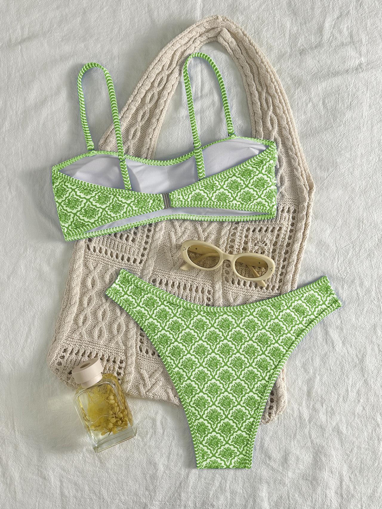 새로운 폭발성 인쇄 트라이앵글 컵 비키니 레이스 업 넥 G-스트링 분할 수영복 유럽 및 미국 Ins 수영복 따뜻한