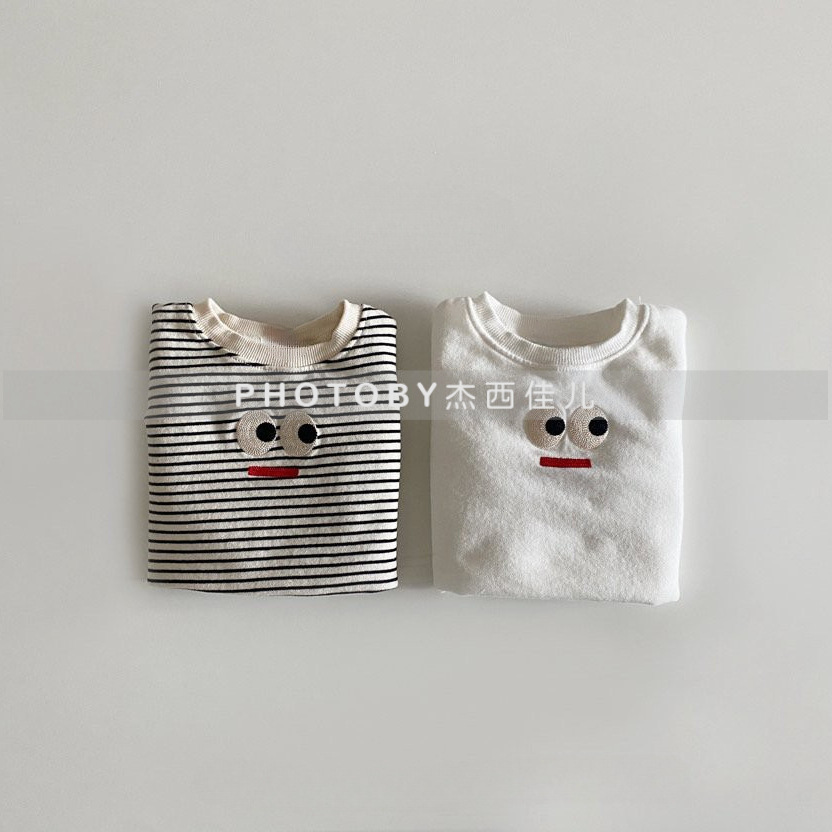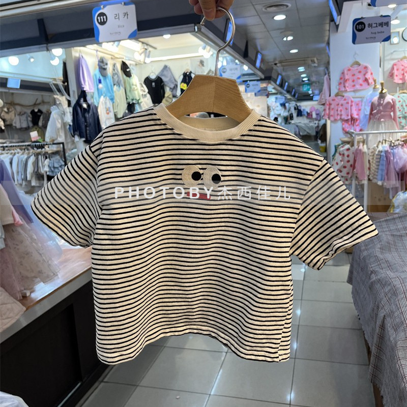 소년 귀여운 반팔 티셔츠 한국어 버전 재미 있은 아동 의류 여름 소녀 단색 줄무늬 바닥 셔츠스토어 가기