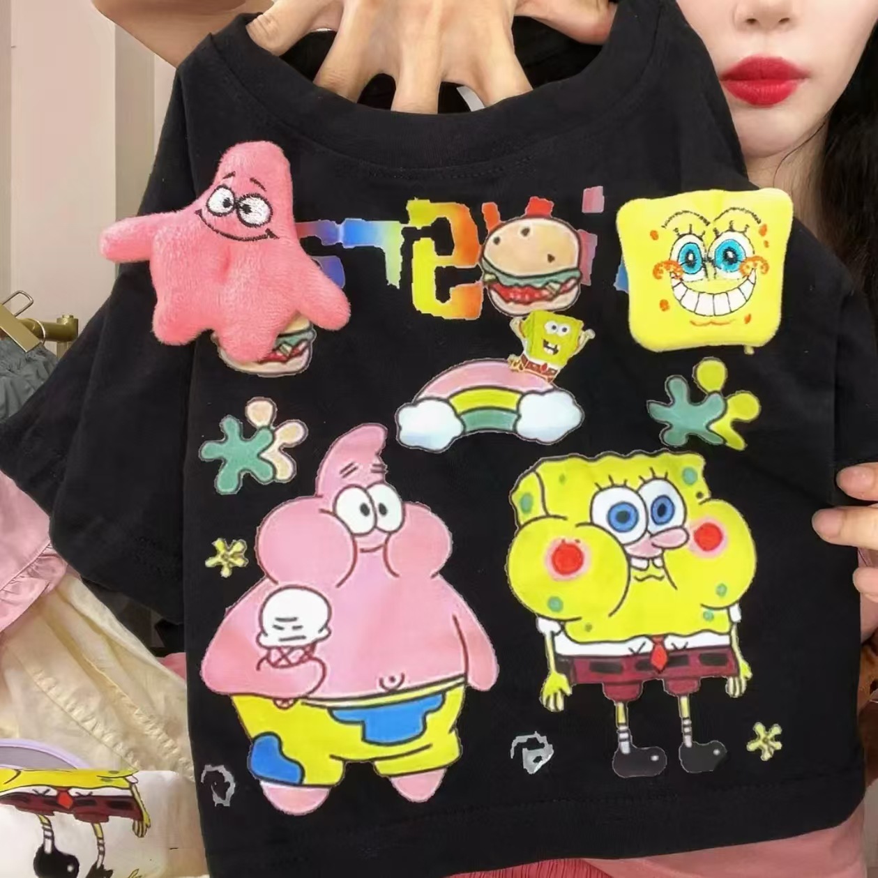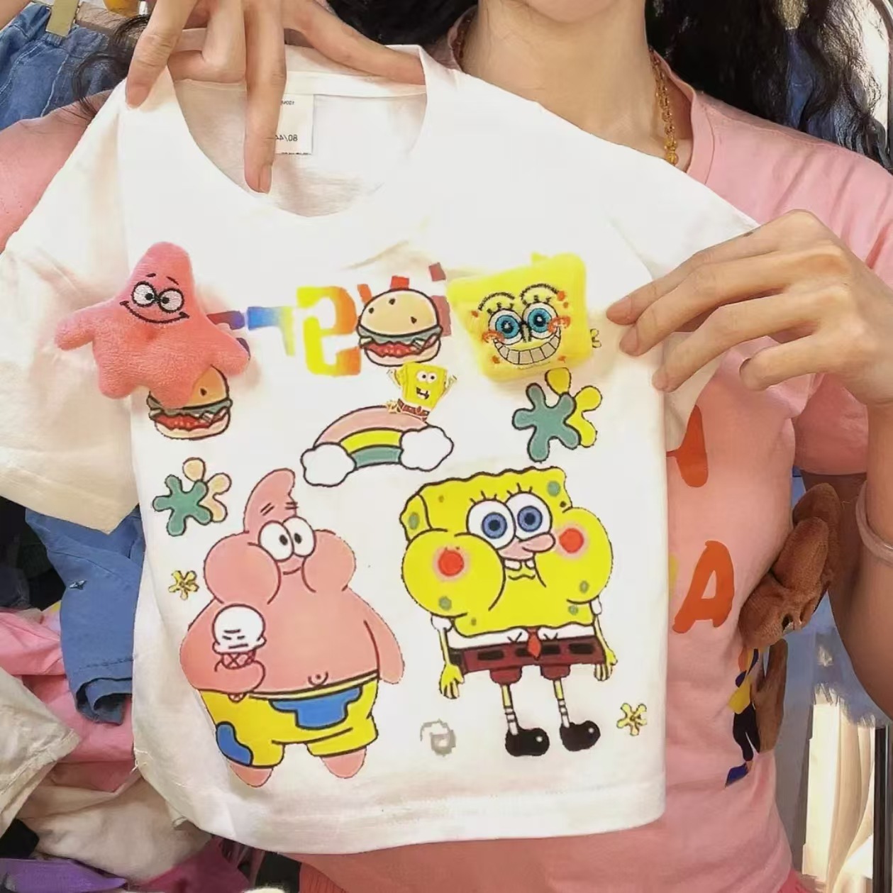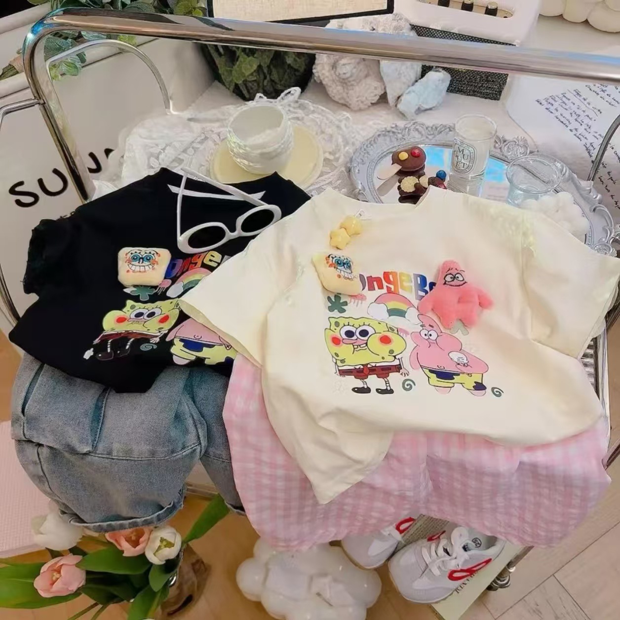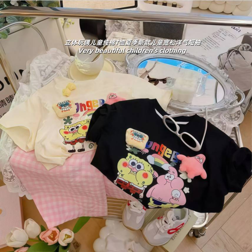 스폰지 밥 인형 소년 소녀 용 아동복 여름 어린이 반팔 티셔츠 느슨한 탑 조수 생성 헤어스토어 가기