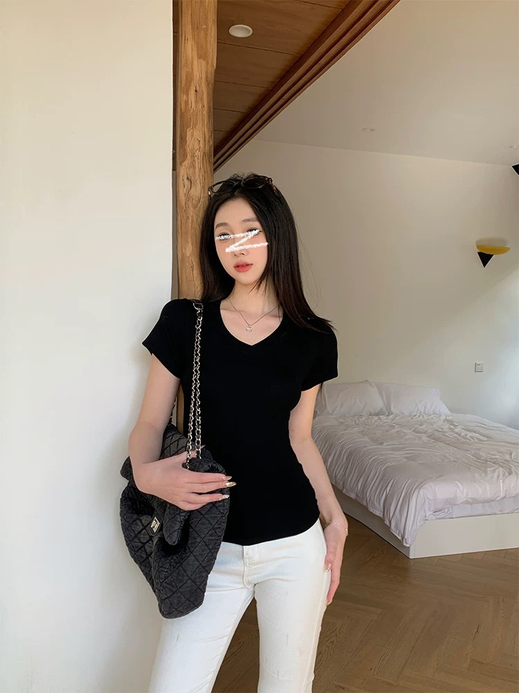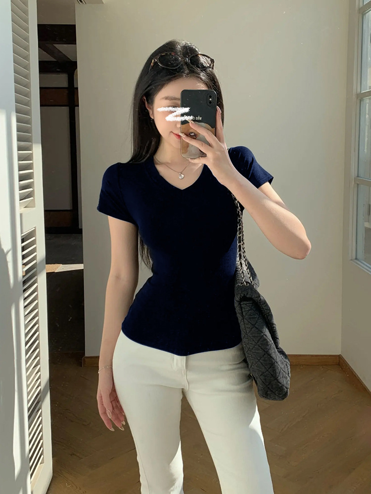 재고 기본 어깨 V 넥 슬림 탑 허리 슬림 조커 반소매 티셔츠