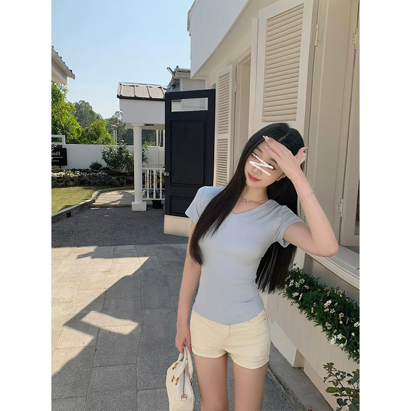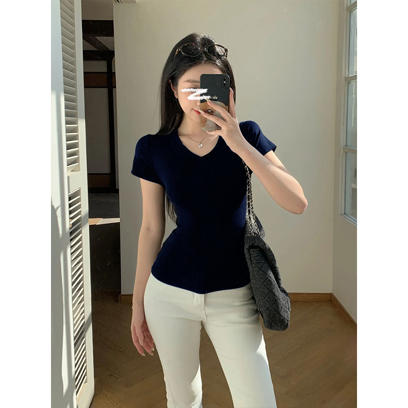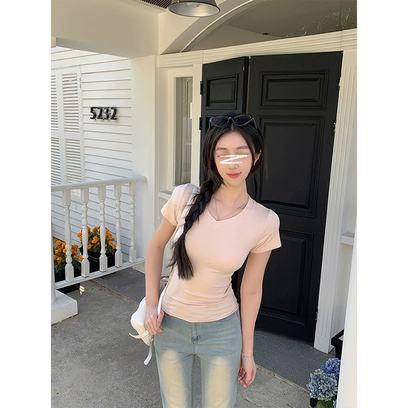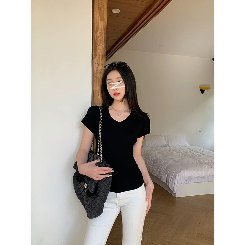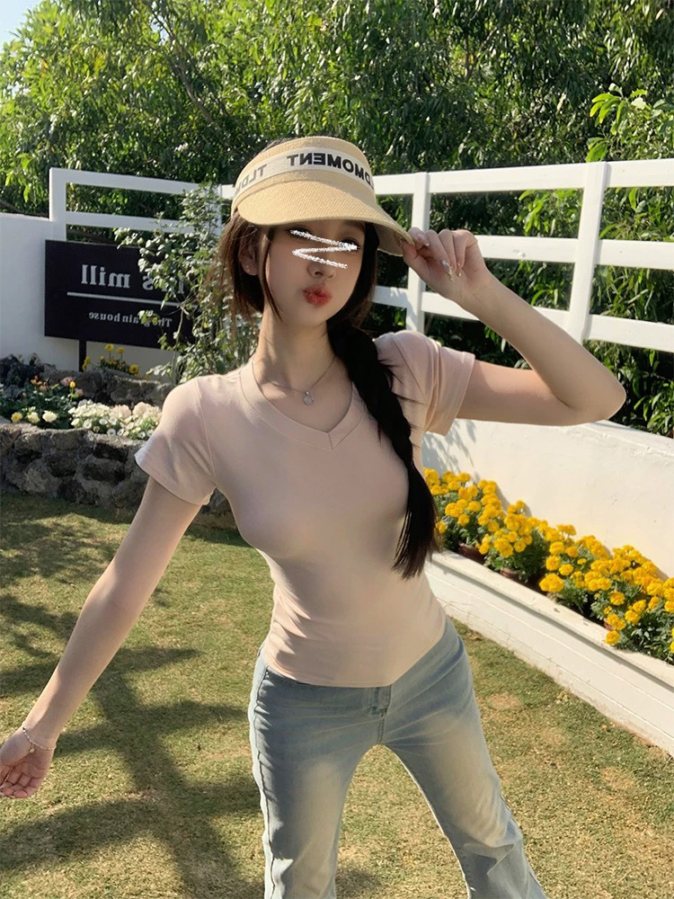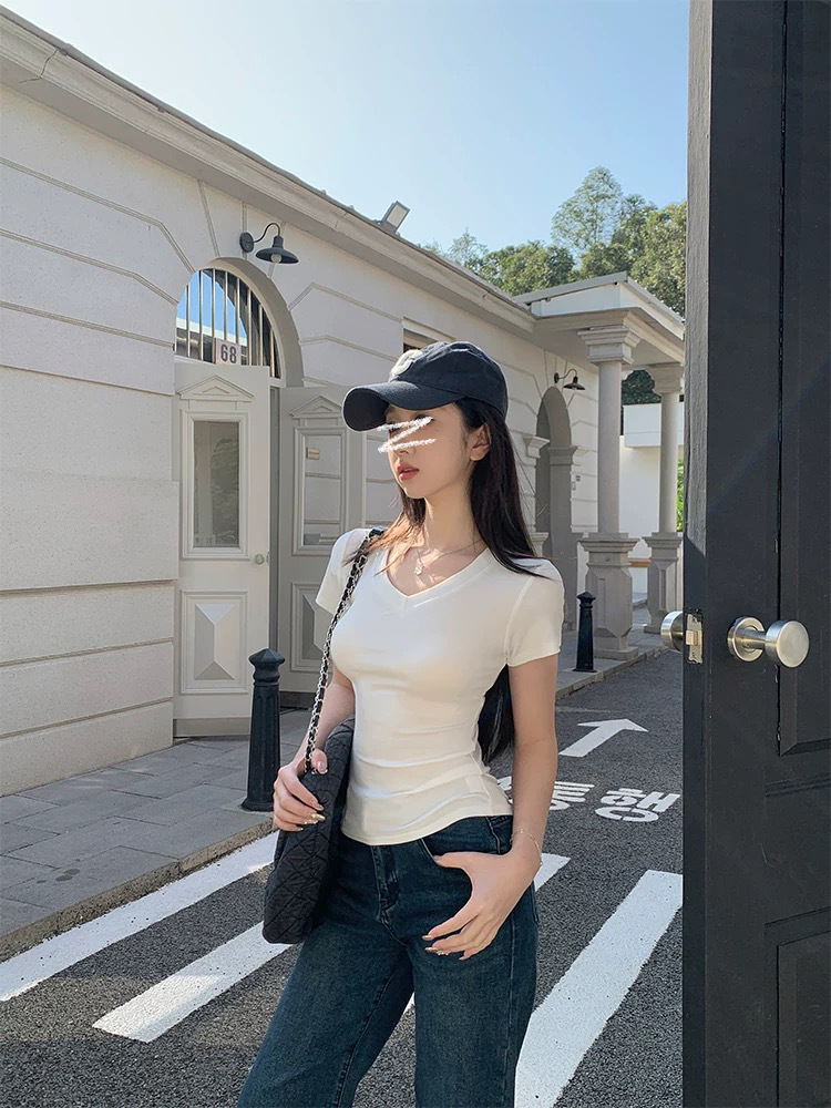 재고 기본 어깨 V 넥 슬림 탑 허리 슬림 조커 반소매 티셔츠스토어 가기