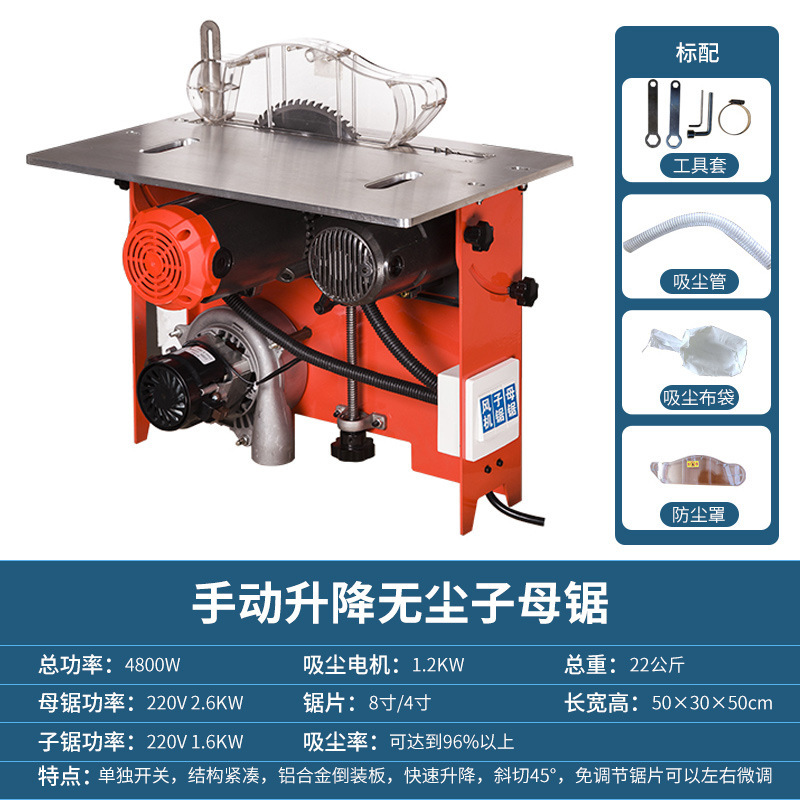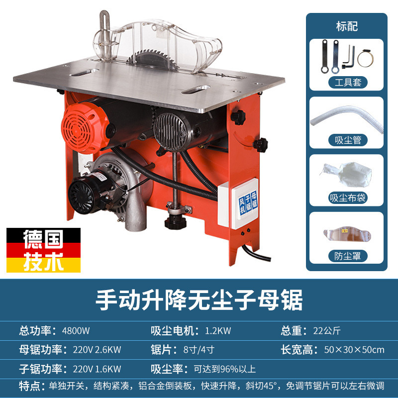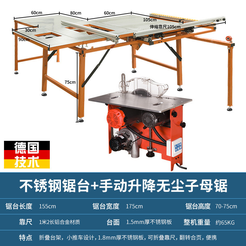 • 독일 모델: 이중 보이지 않는 스테인레스 스틸 톱 테이블 + 수동 리프팅 톱/고출력