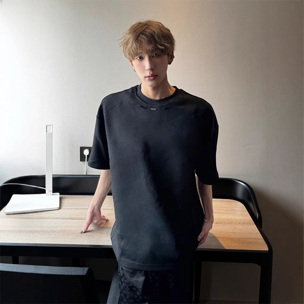 260g 무거운 미국 작은 목선 티셔츠 남성 금속 버클 해체 패션 브랜드 짧은 소매 틈새 디자인 고급 반 소매