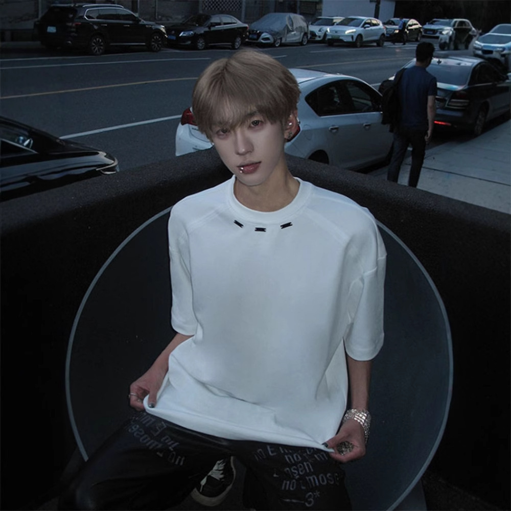 260g 무거운 미국 작은 목선 티셔츠 남성 금속 버클 해체 패션 브랜드 짧은 소매 틈새 디자인 고급 반 소매스토어 가기