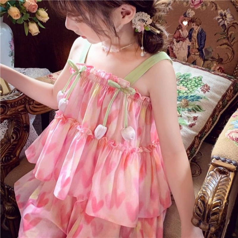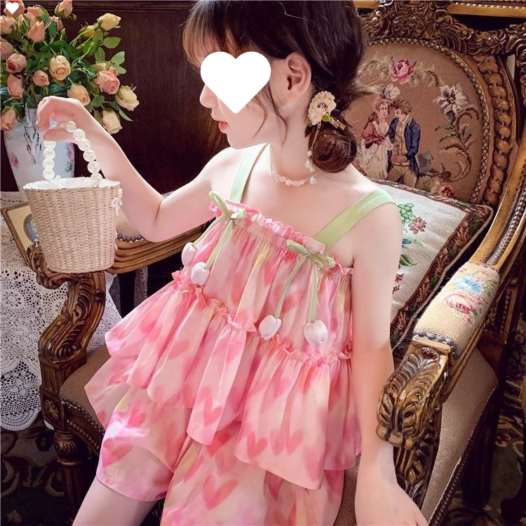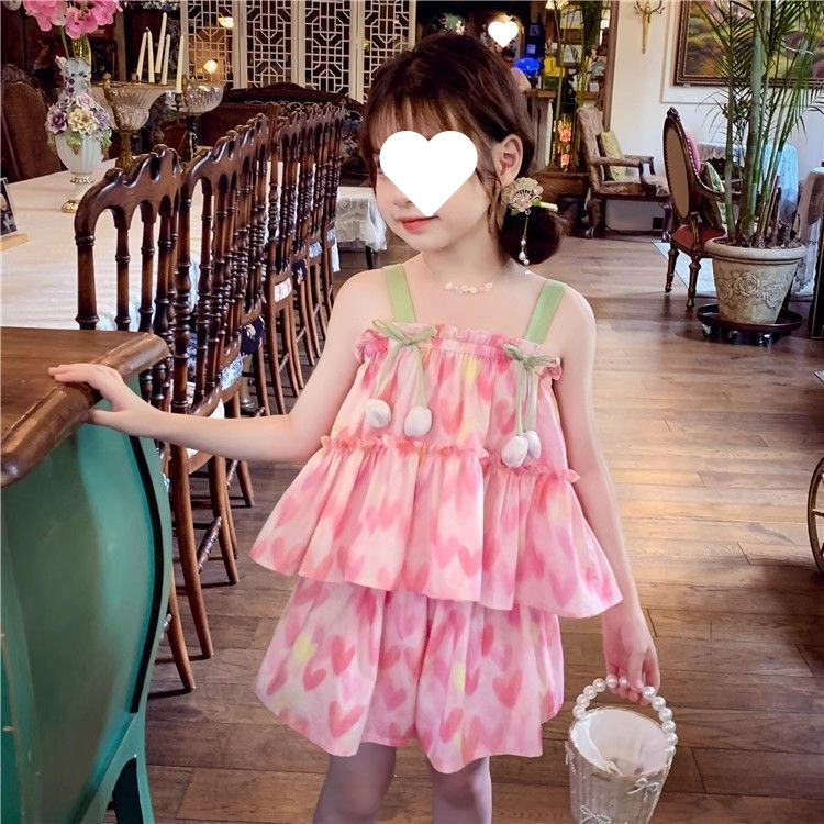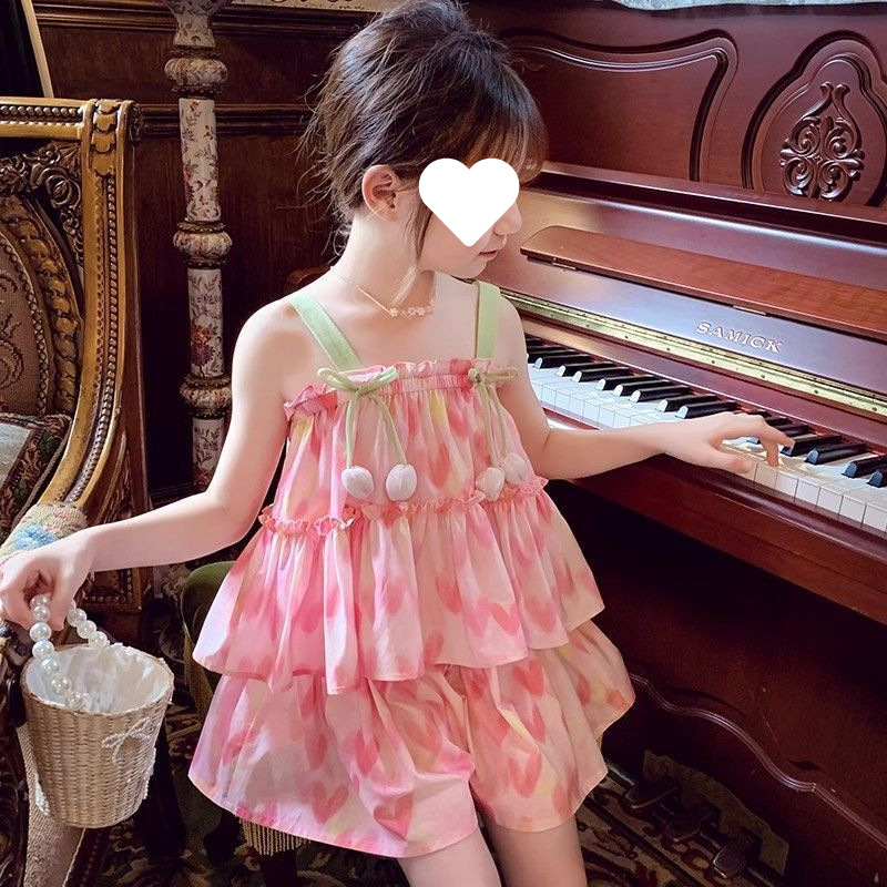 소녀 유행 세트 여름 2025 새로운 세련된 어린이 슬링 반바지 투피스 세트 소녀의 휴일 세트
