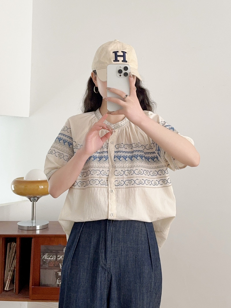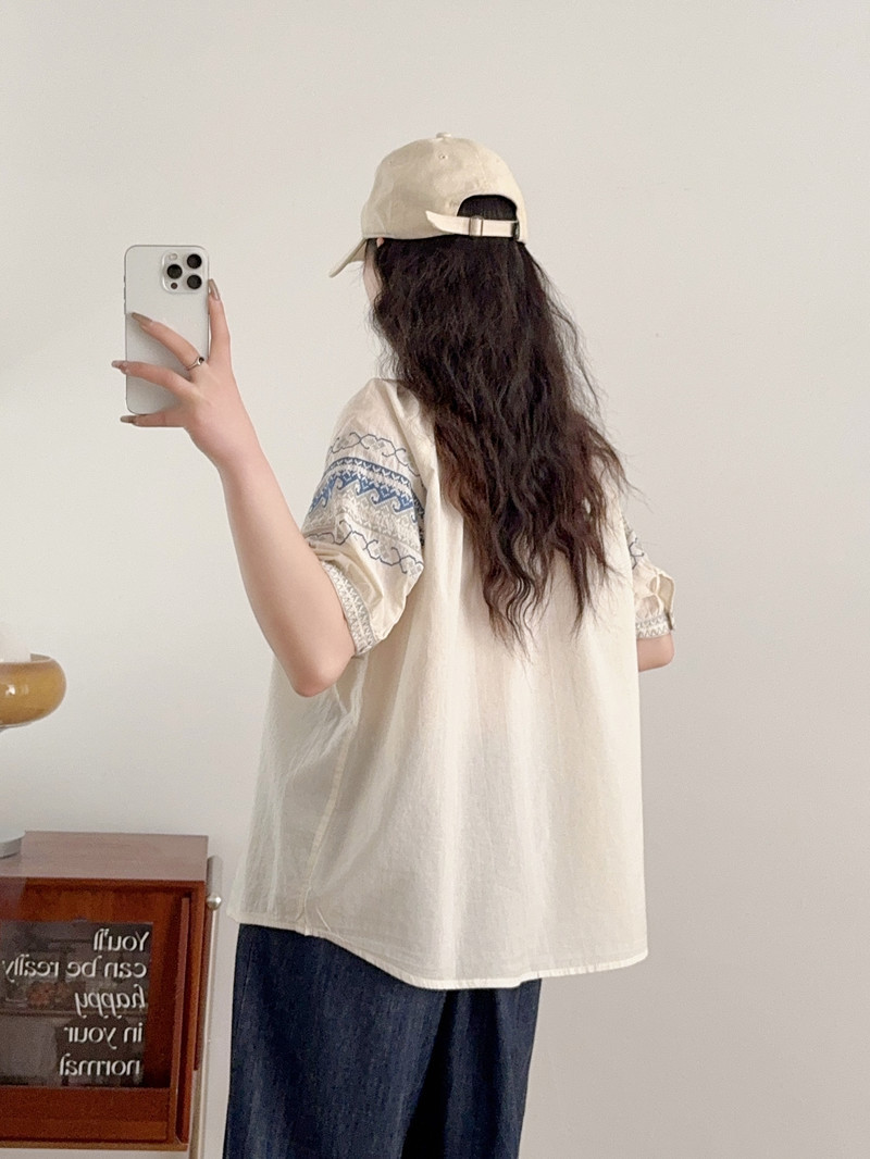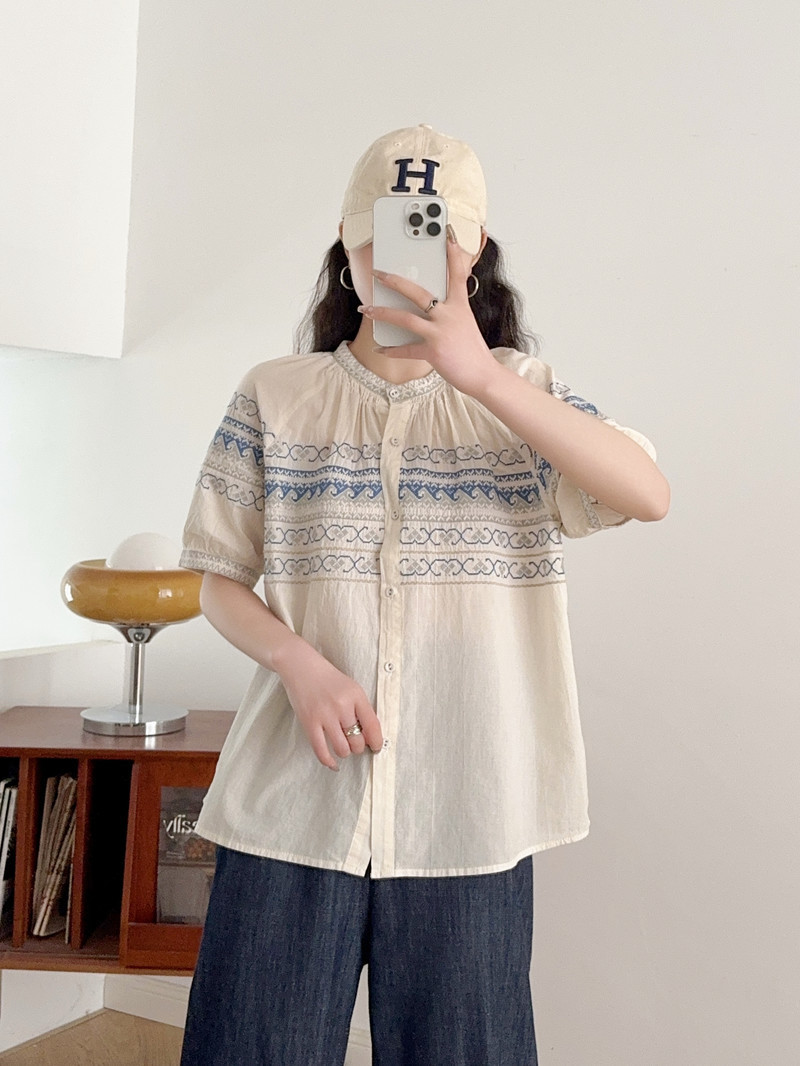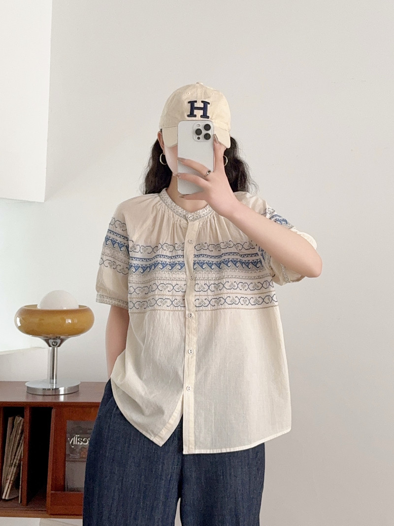 2025 여름 새로운 국가 스타일 자수 느슨한 숙녀 반팔 셔츠 카디건 탑 도매스토어 가기