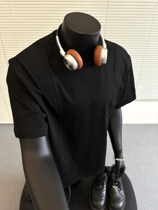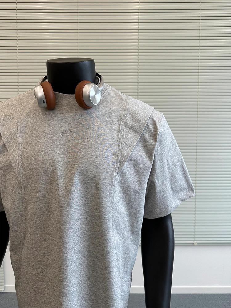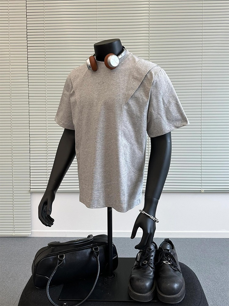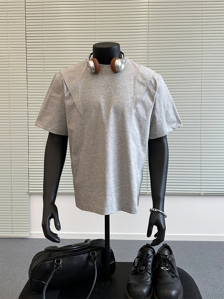 국경 간 멜란지 그레이 어깨 반팔 남성 미국식 레트로 헤비 박스 쇼트 와이드 티셔츠 패션 브랜드 해체 반소매 캐주얼