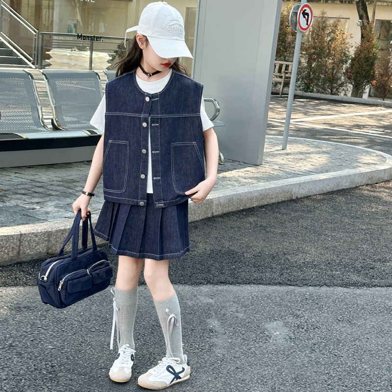 소녀의 여름 세트 2025 새로운 스타일 유행 어린이 여름 조끼 데님 3 조각 세트 소녀의 주름 치마