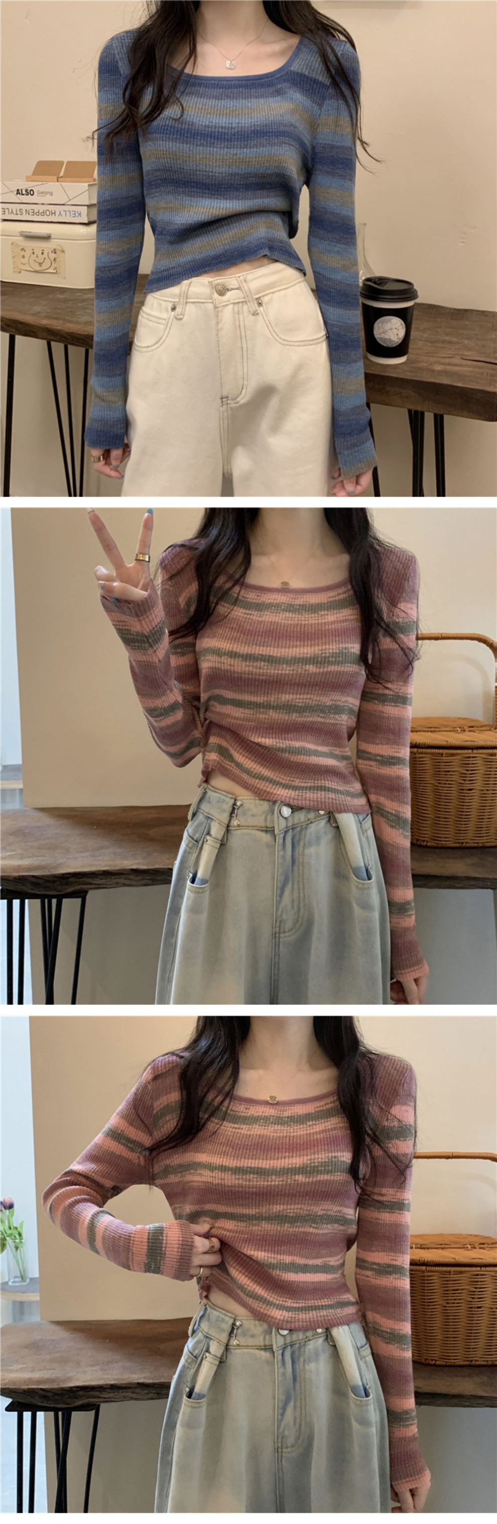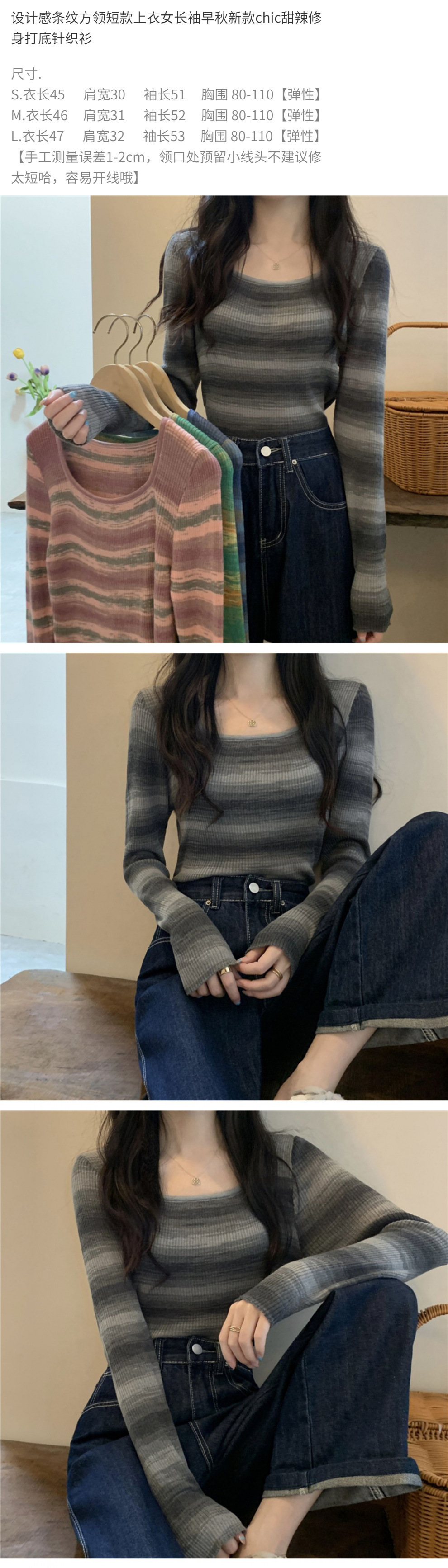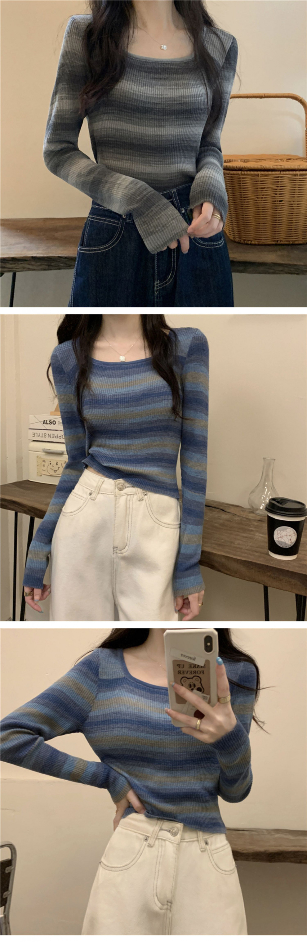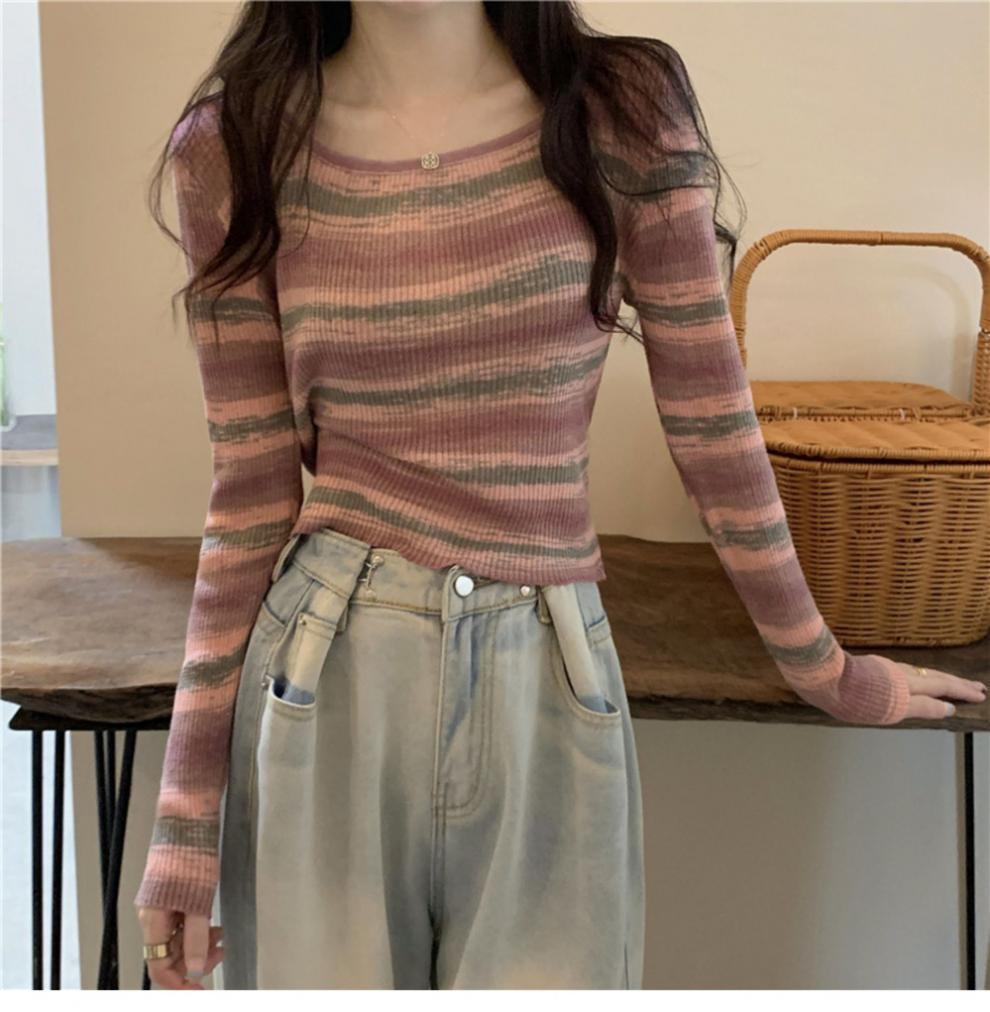 디자인 센스 스트라이프 로우 넥 베이스 셔츠 여성용 긴 소매 이른 가을 짧은 Hic 달콤한 매운 슬림 핏 스퀘어 칼라베이스 셔츠스토어 가기