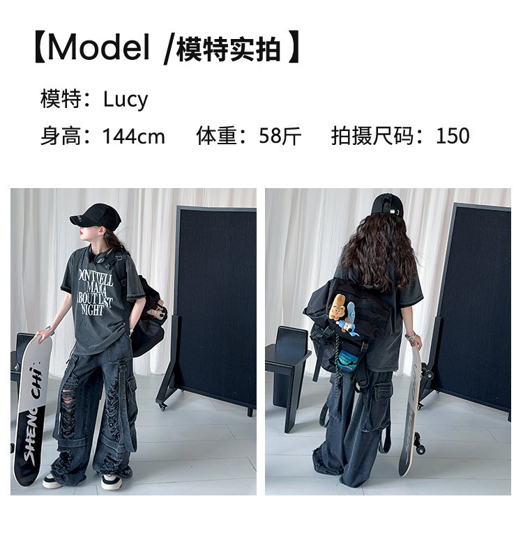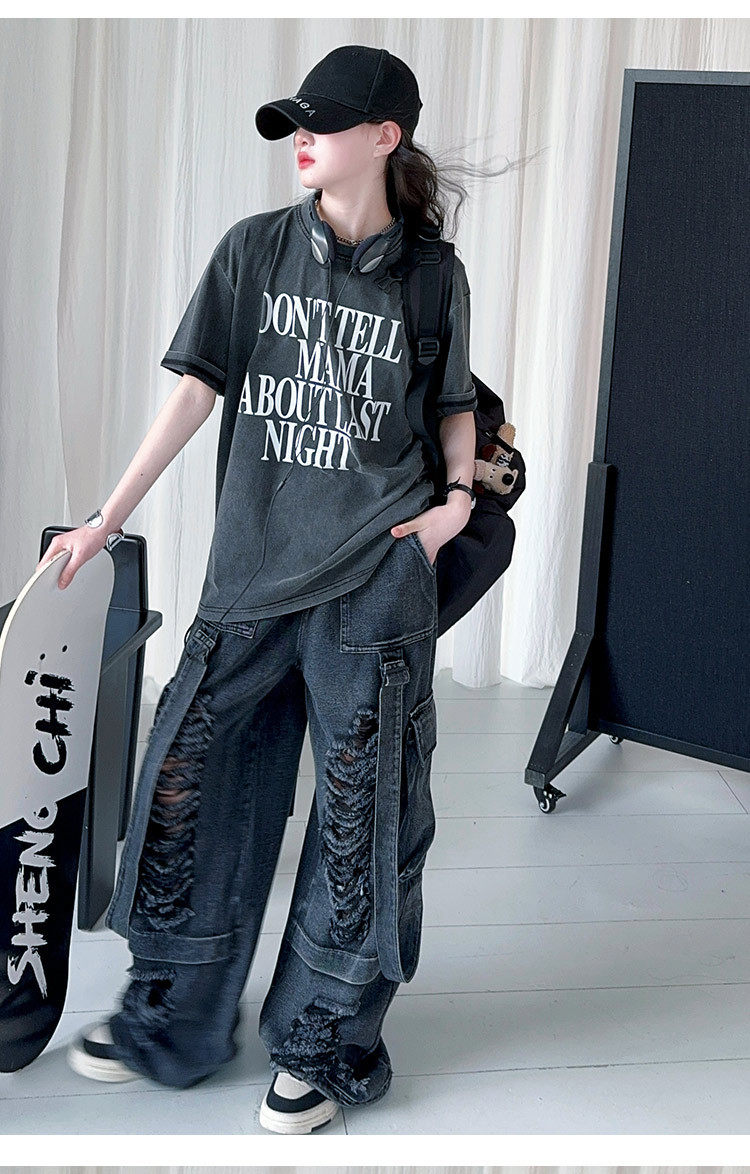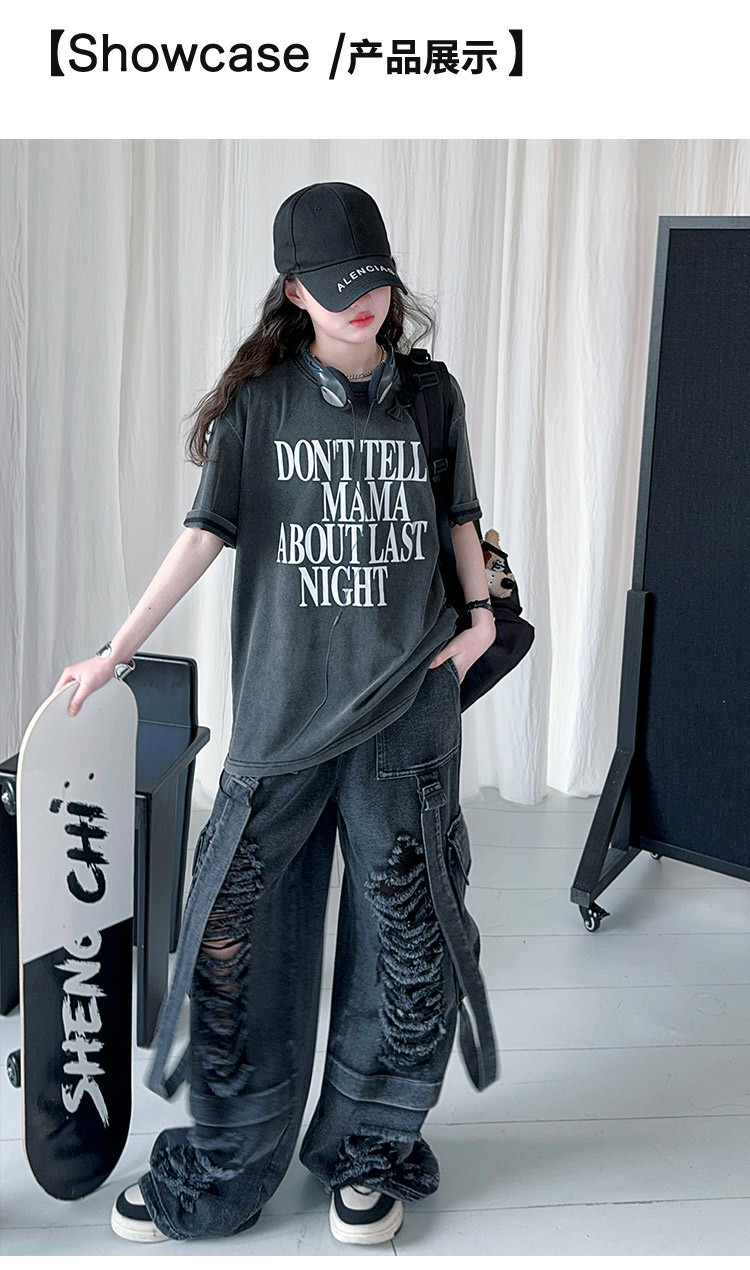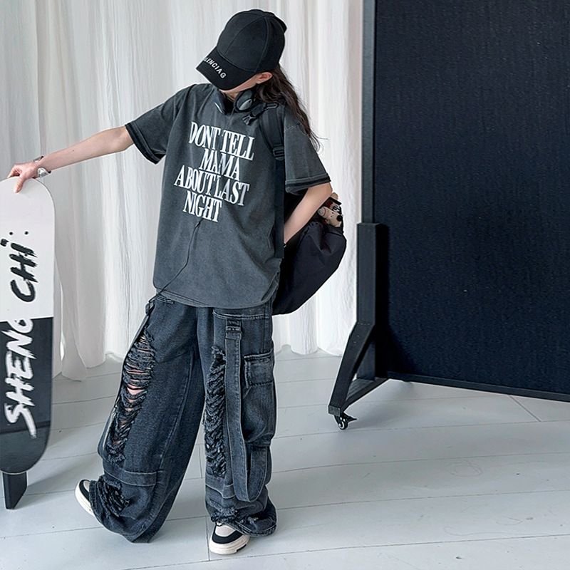 소녀 찢어진 청바지 세트 봄과 여름 2025 새로운 중대형 어린이 미국 느슨한 서양식 넓은 다리 바지