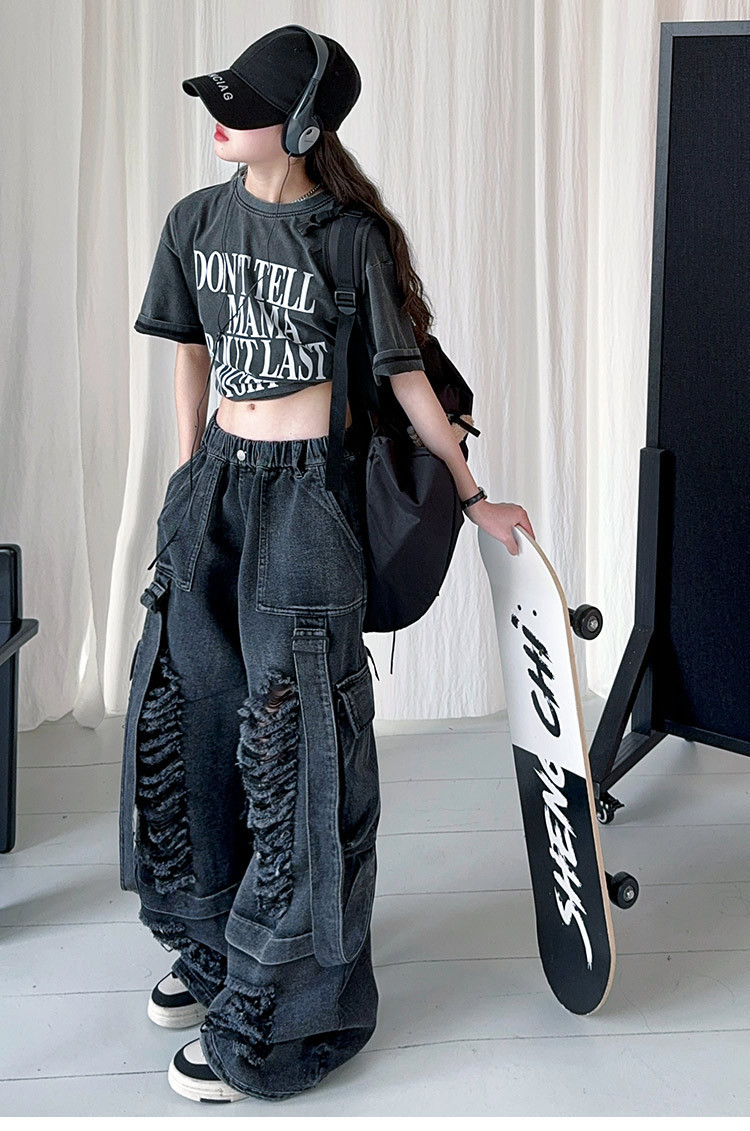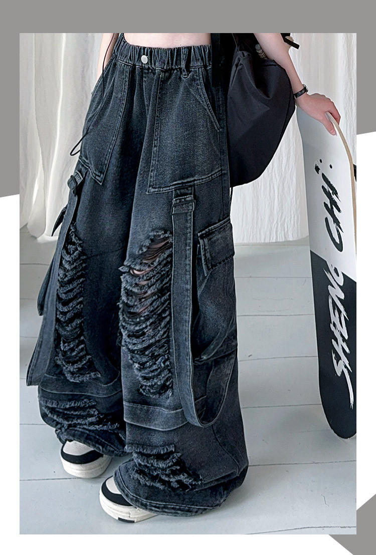 소녀 찢어진 청바지 세트 봄과 여름 2025 새로운 중대형 어린이 미국 느슨한 서양식 넓은 다리 바지스토어 가기
