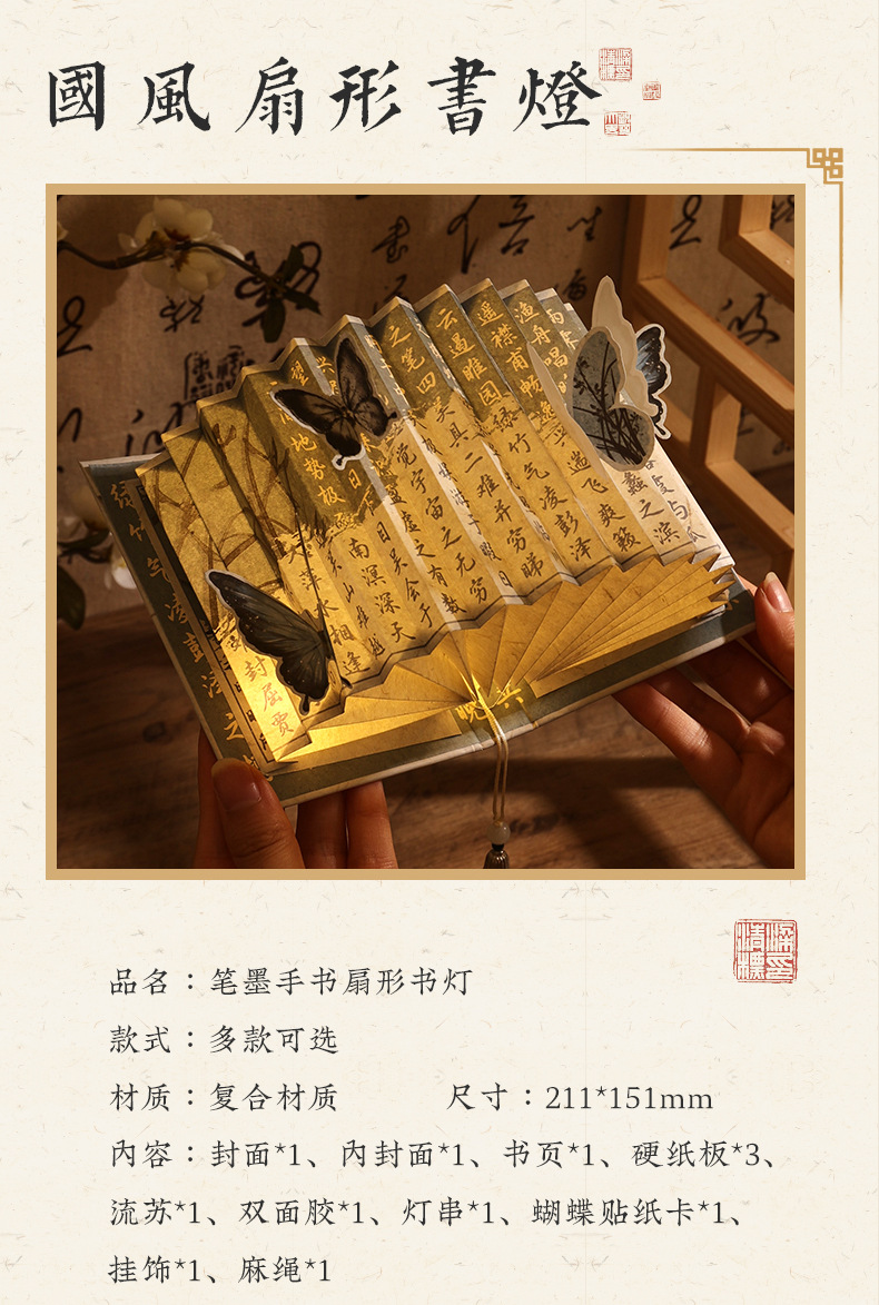 -Guofeng 팬 모양의 수제 책 램프 펜과 잉크 핸드북 DIY 창조적 인 골동품 책 램프 나비 밤 조명 도매 선물
