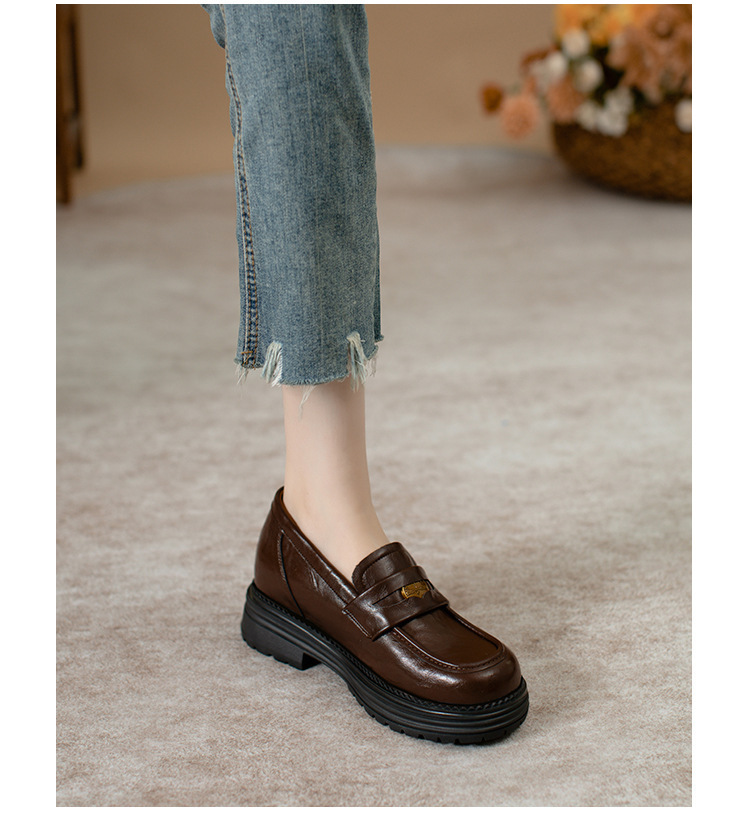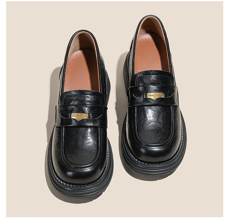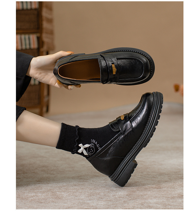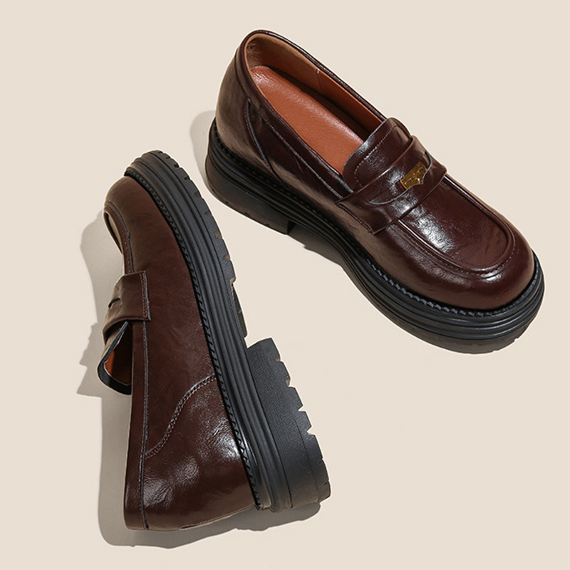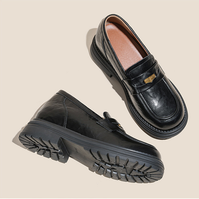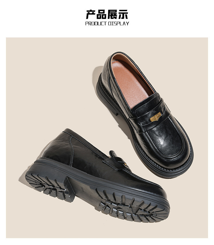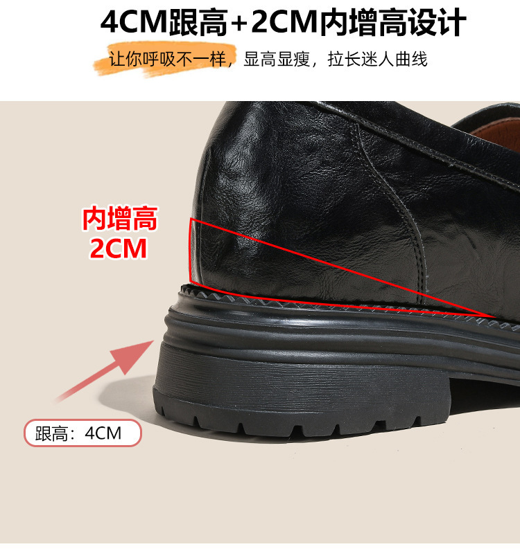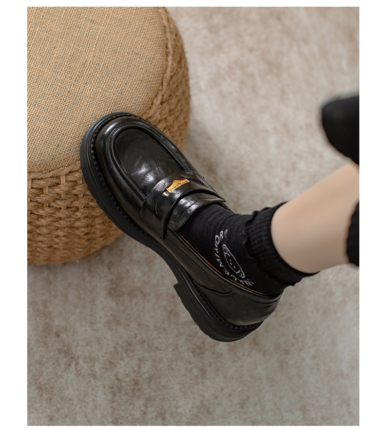 영국 스타일 슬립 온 골드 코인 로퍼 여성 올 매치 두꺼운 밑바닥 라운드 머리 내부 높이 올리는 작은 가죽 신발